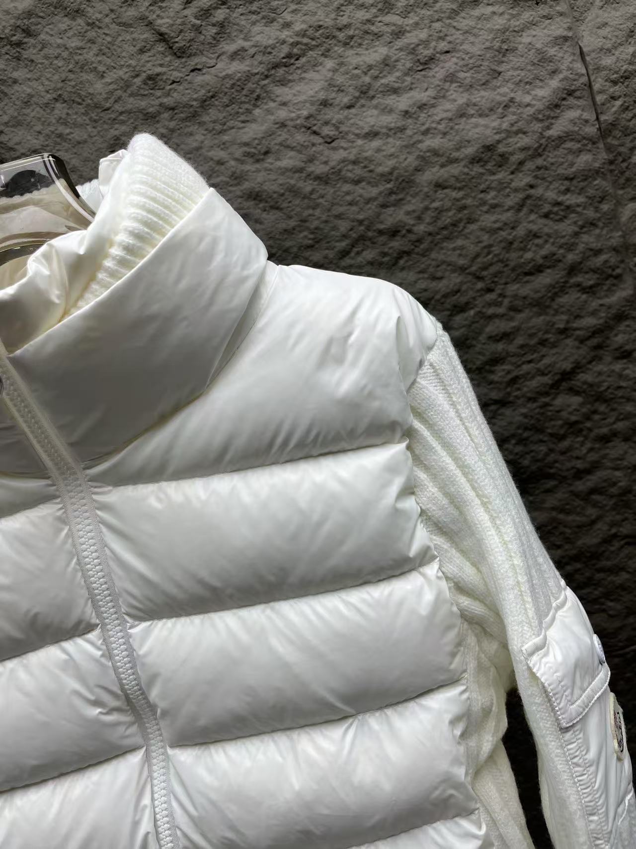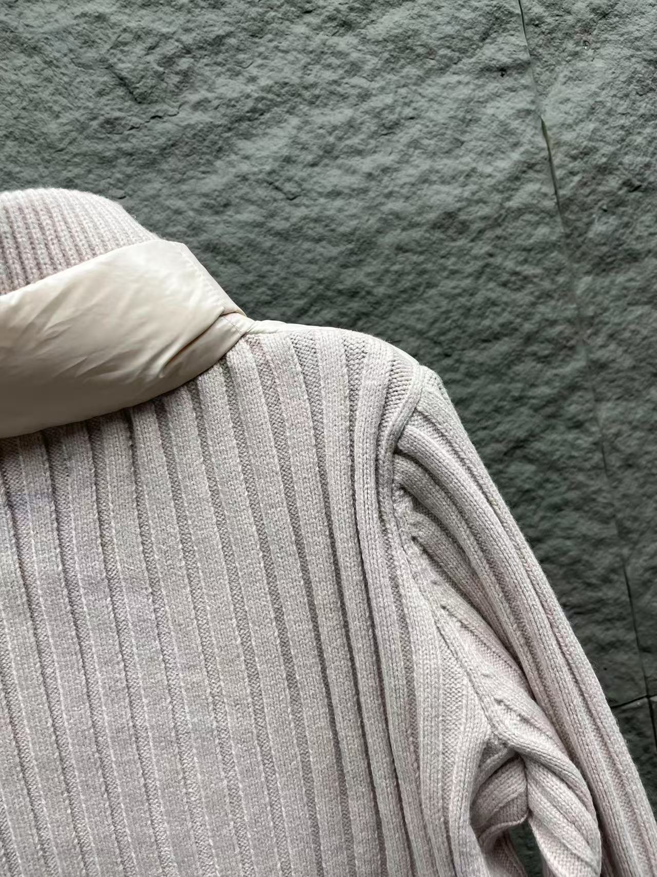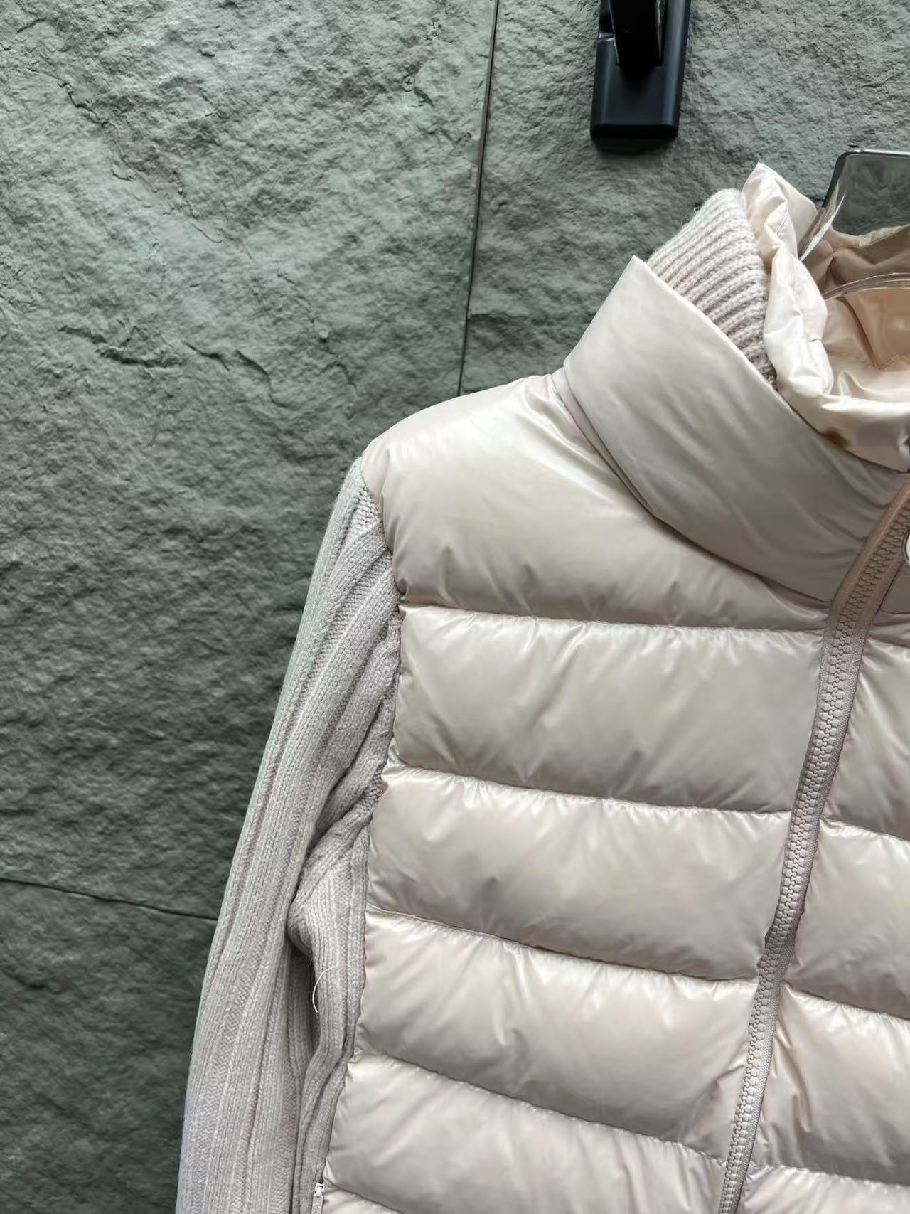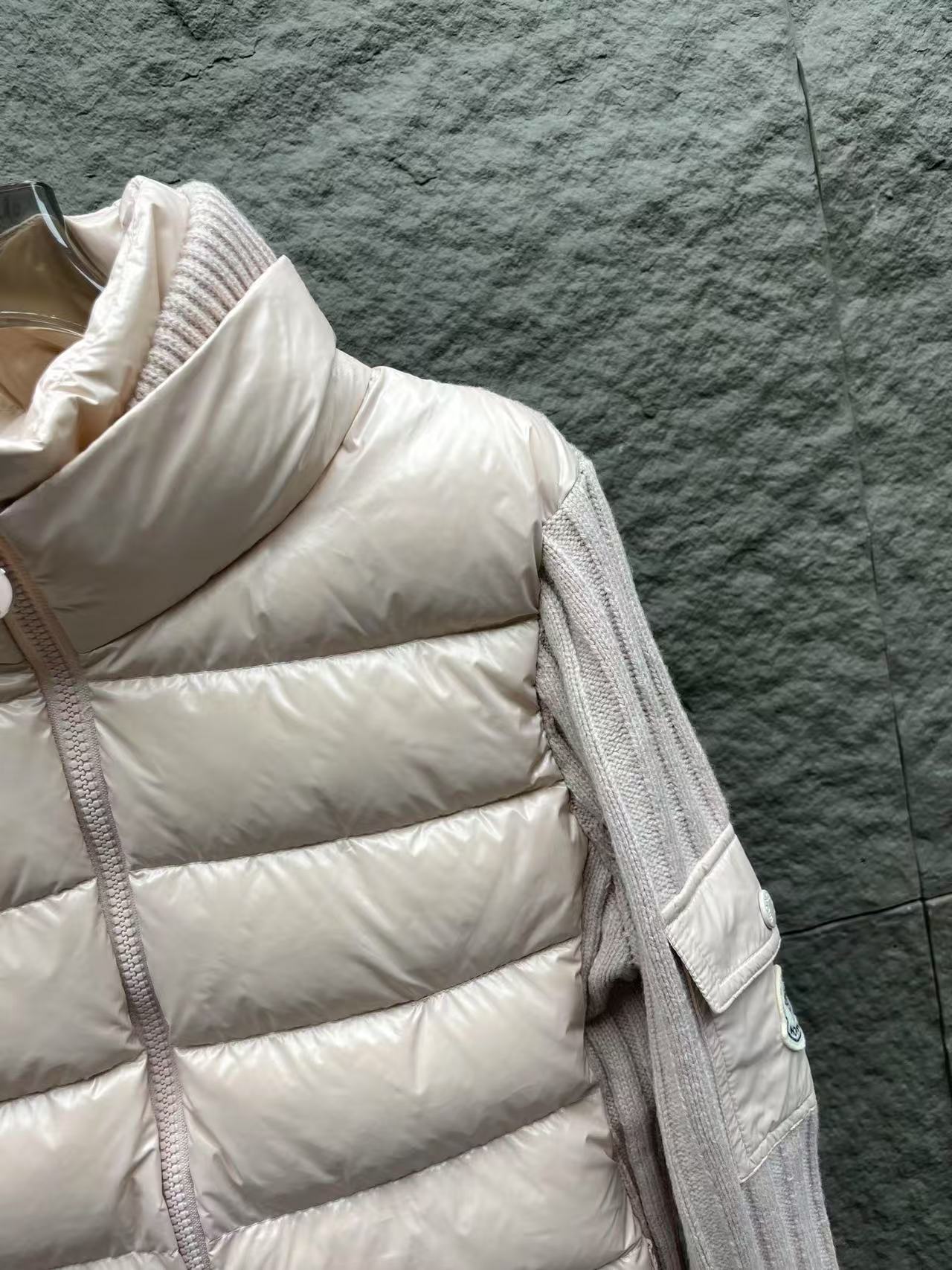 針織拼接:手臂和領邊的針織與外套主體互相呼應,讓整件外套看起來更有層次感,完全擺脫了傳統羽絨服的沉悶感。