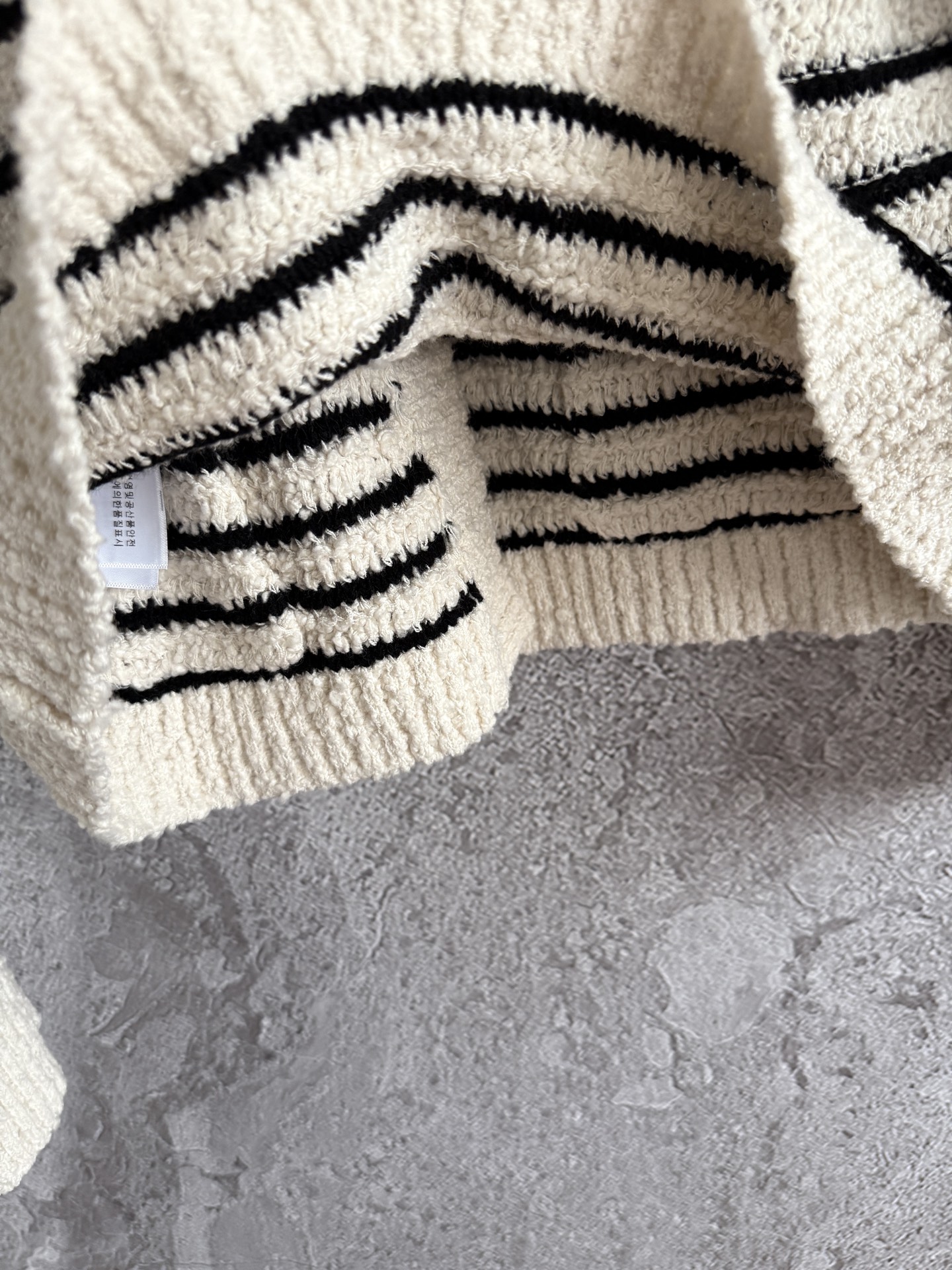 選用羊毛與棉混紡的粗針織紗線,帶有顆粒肌理感,質地細膩柔軟,完全不會刺膚。表面還有輕微的絨感效果,摸起來溫暖舒適。