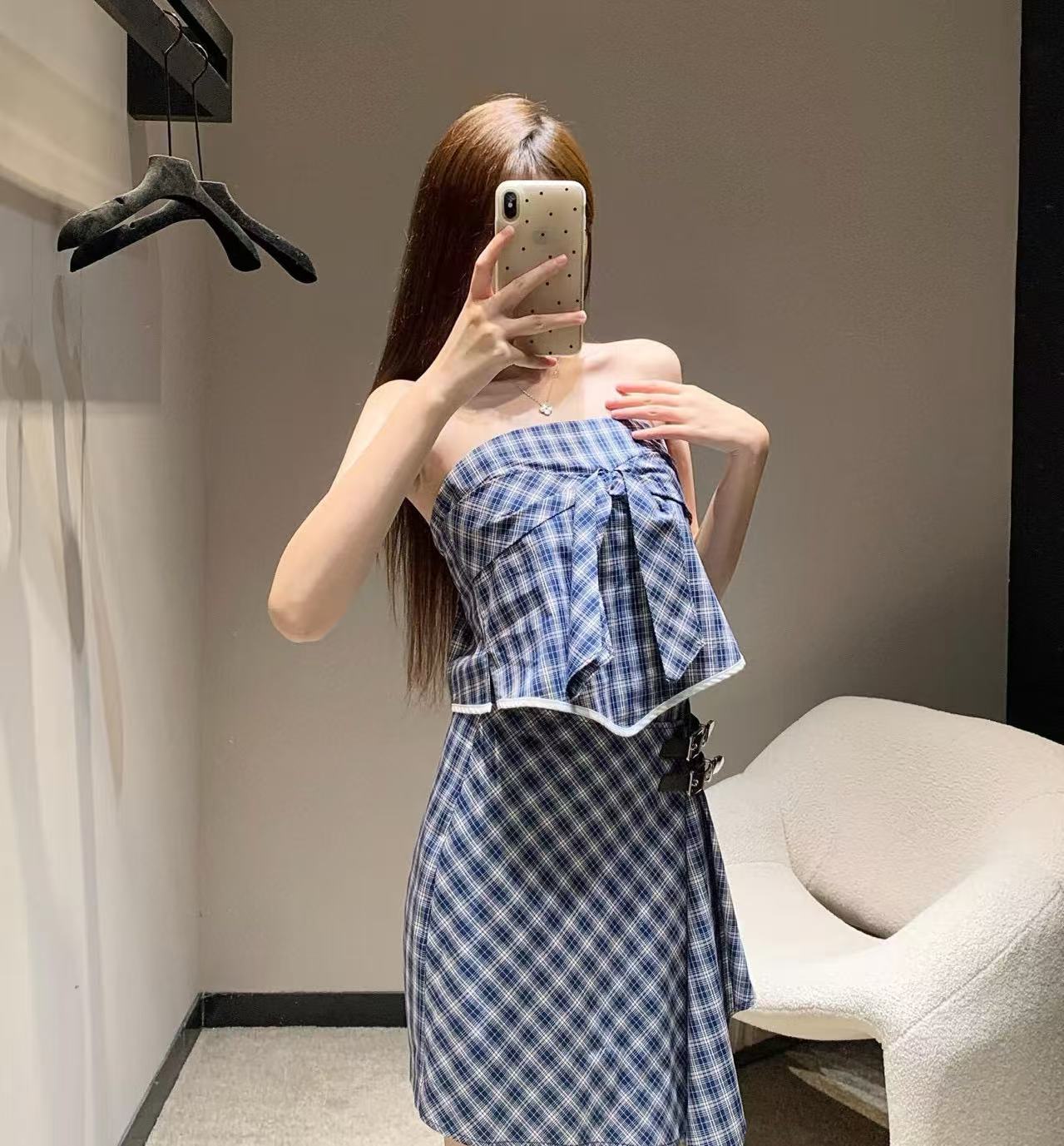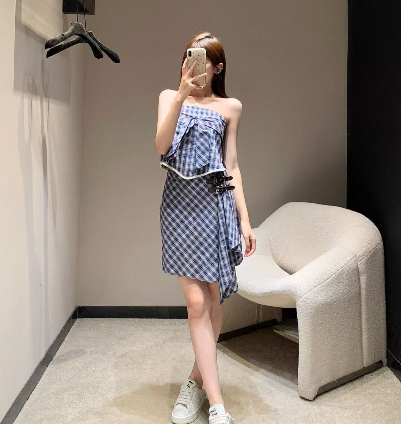結合格紋元素與不規則剪裁,整體感時髦又不失優雅氣質。,甜美之中多了一點俐落感。不規則半裙版型修飾身形,單穿或搭配其他單品都很有造型感。