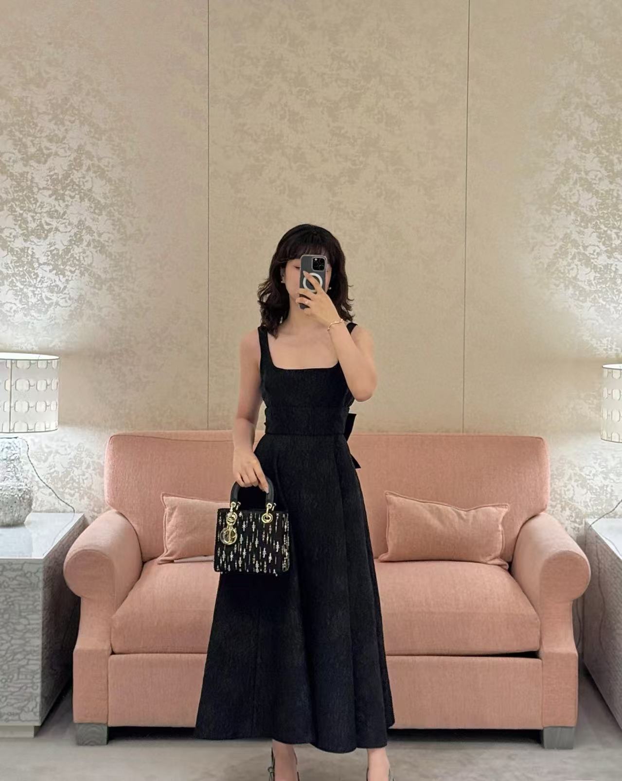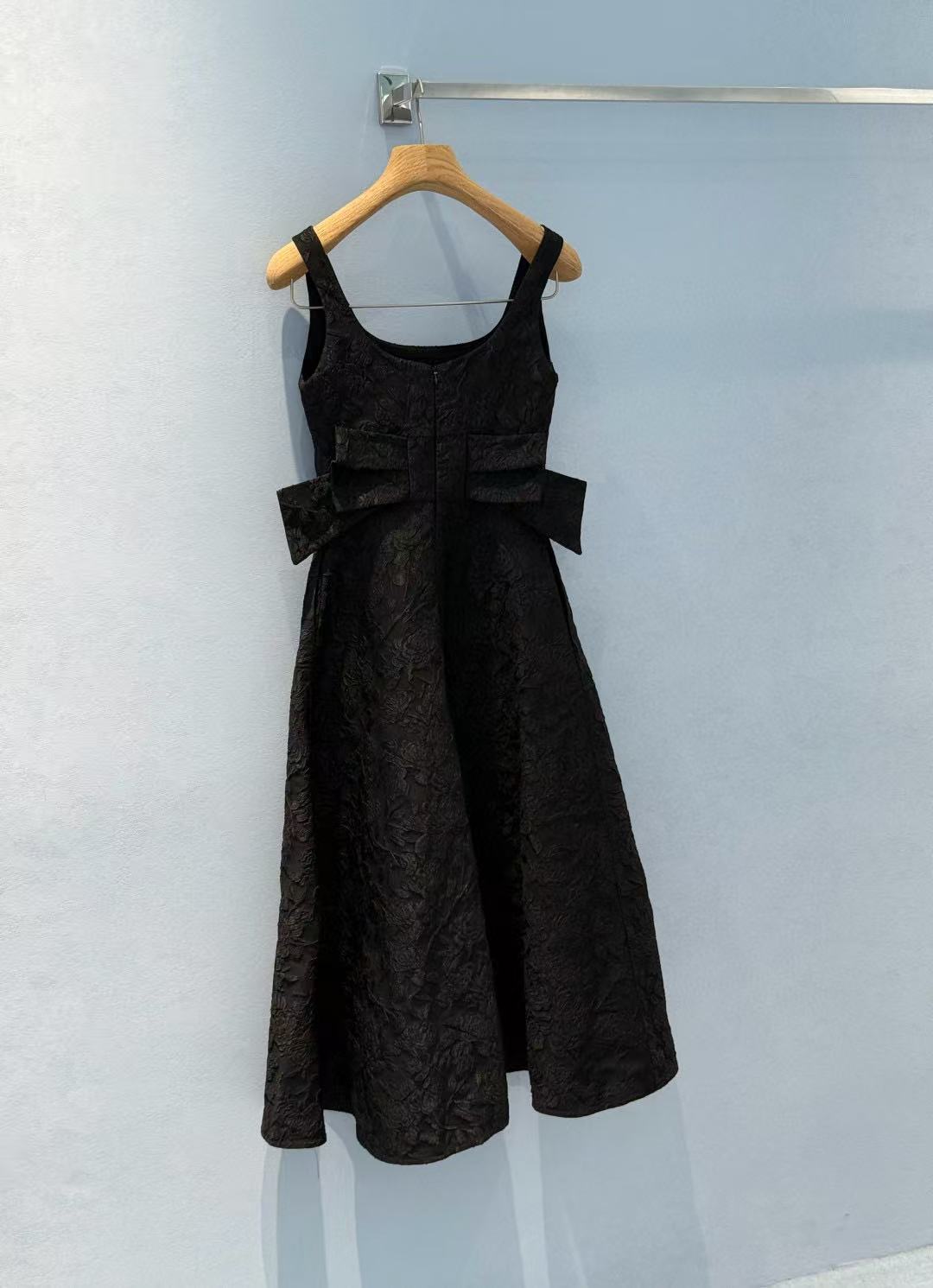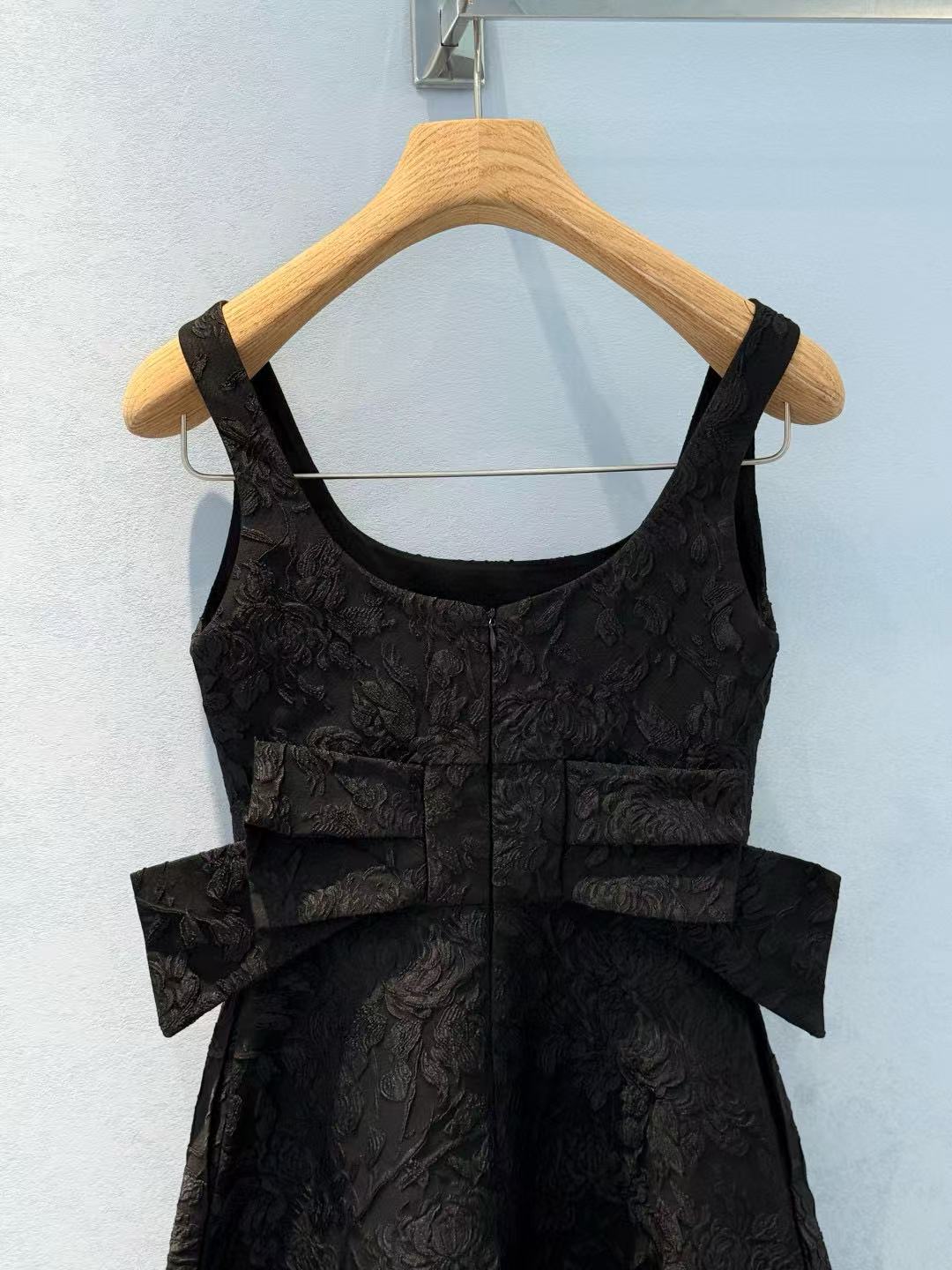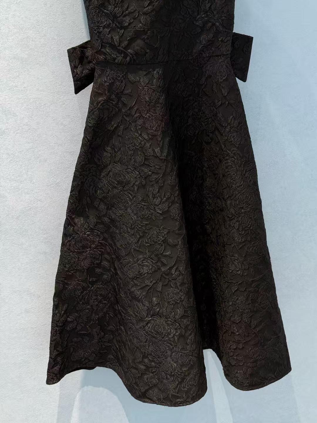 釋赫本式的優雅與高級感,後腰以立體蝴蝶結造型點綴,結合收腰剪裁與大 A 字裙擺,既修飾身形比例,又散發迷人的法式浪漫氣質。