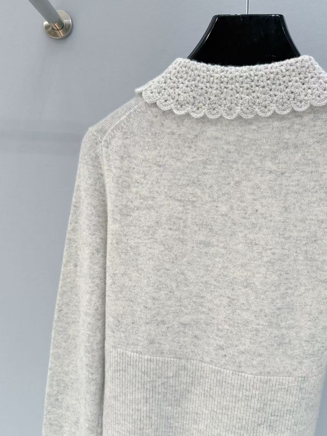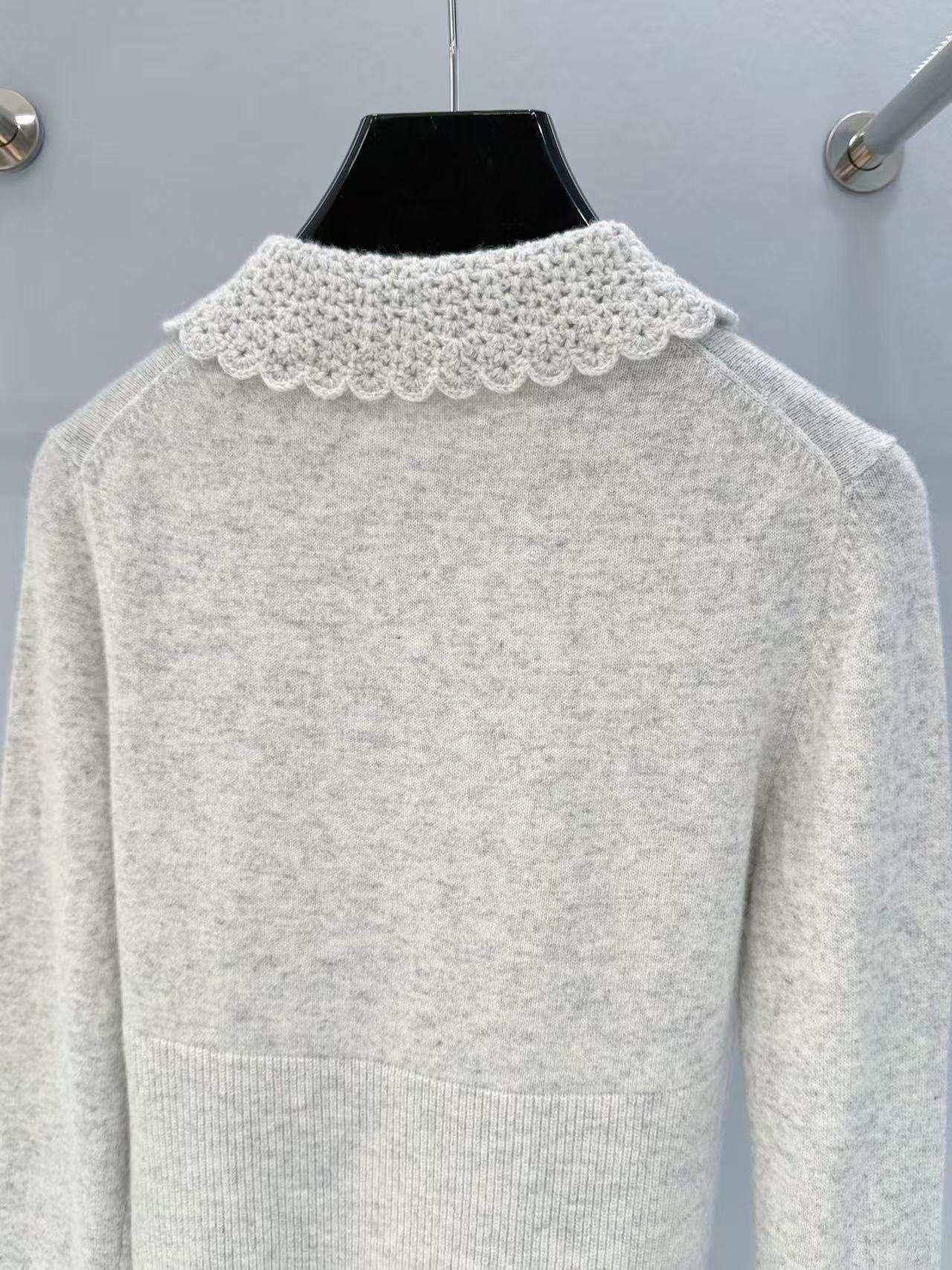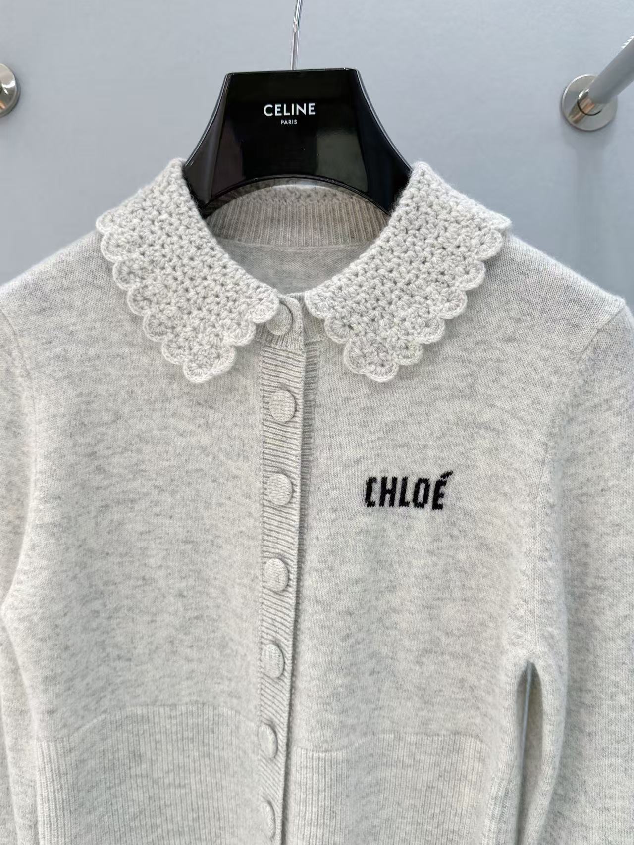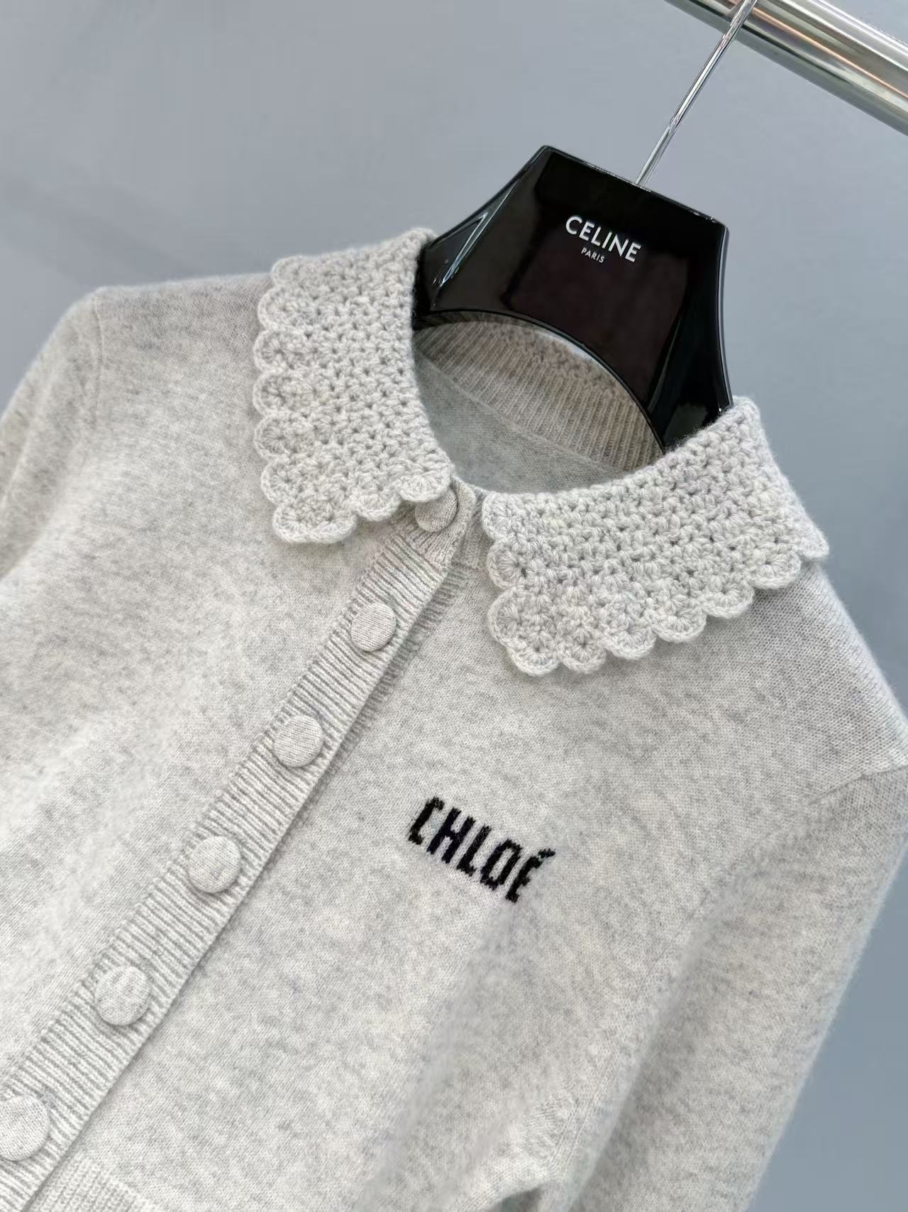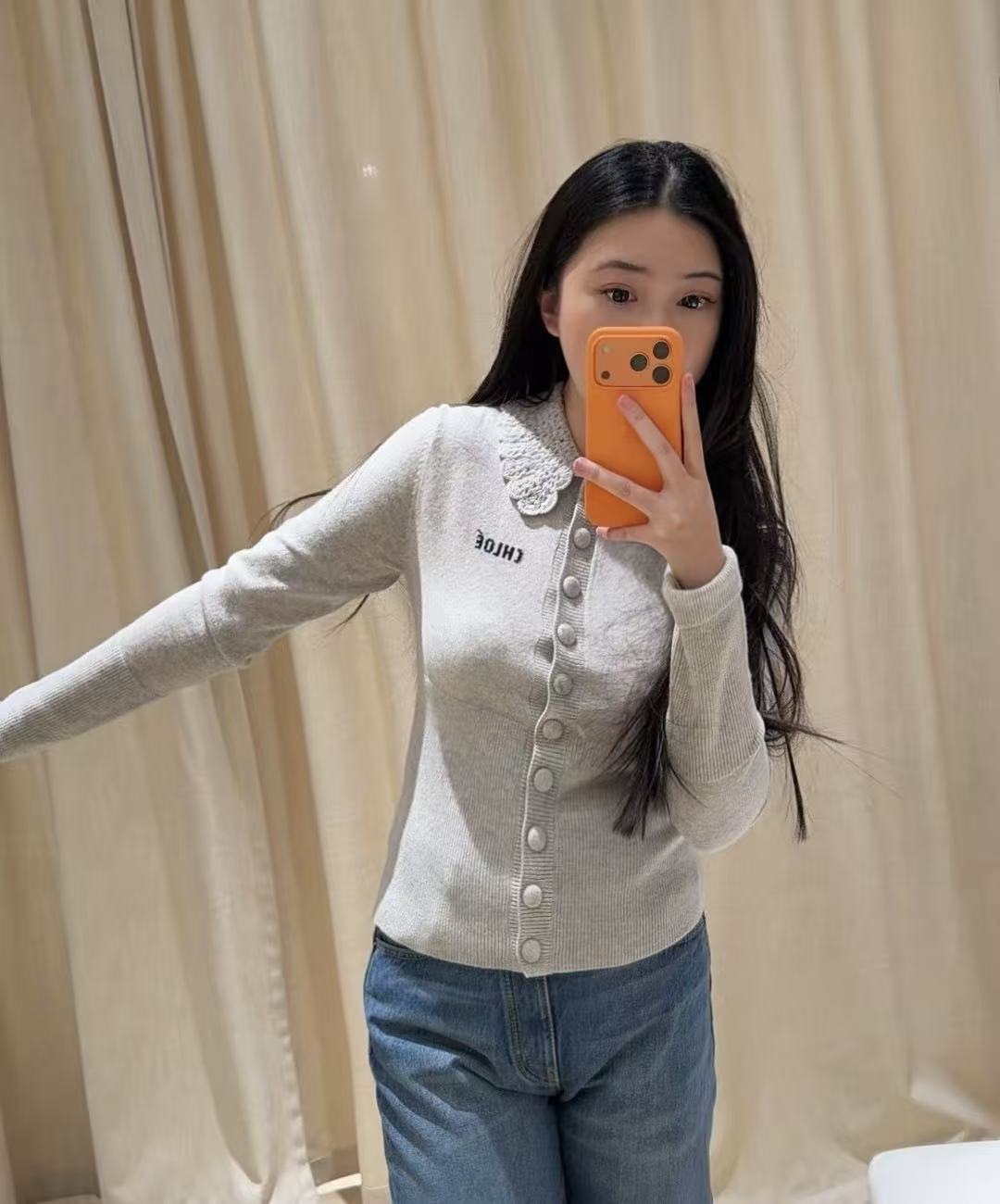 設計上,娃娃領是最大亮點,搭配蕾絲細節增添浪漫氣息,正面還有品牌刺繡 Logo,低調卻有辨識度。