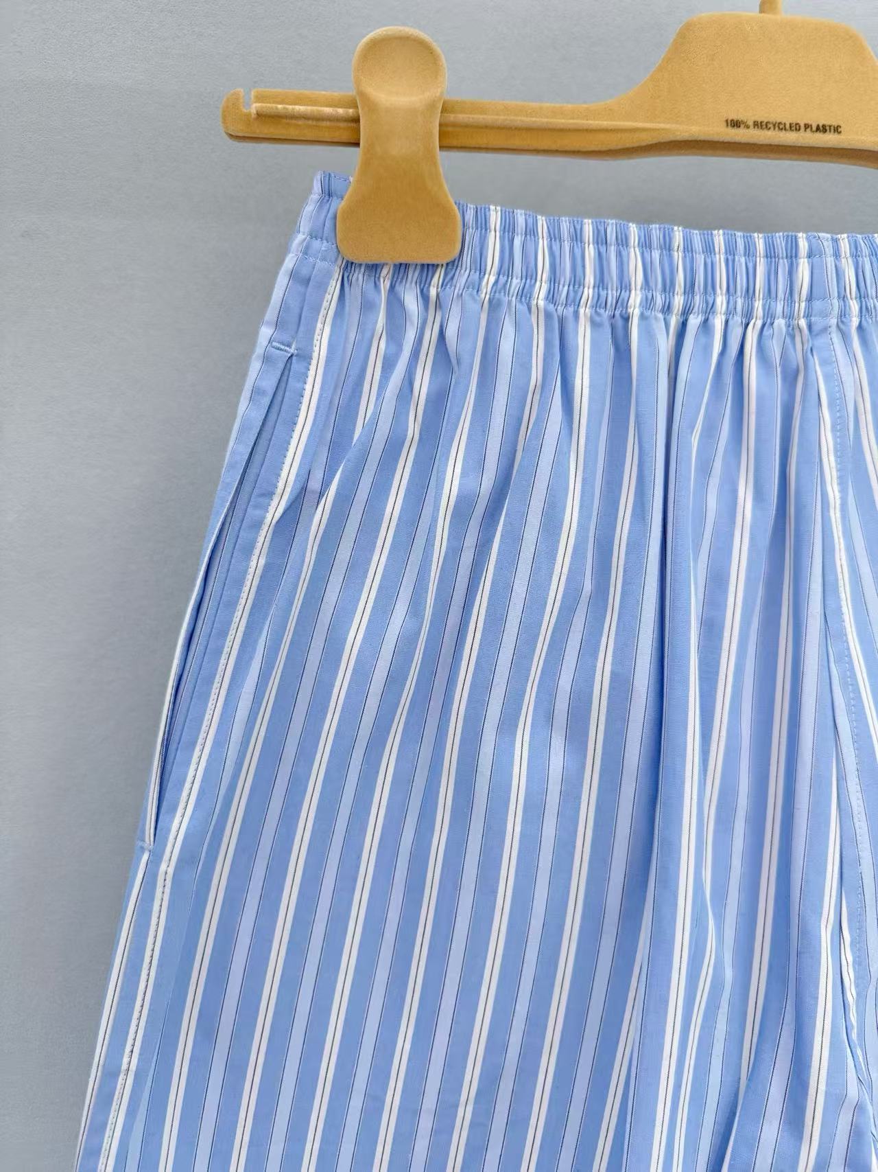 選用色織條紋材質,細緻的條紋紋理帶有層次感。褲身還飾有品牌標識的精緻刺繡,低調中帶點質感。腰頭使用彈力鬆緊設計,活動起來更加自在。