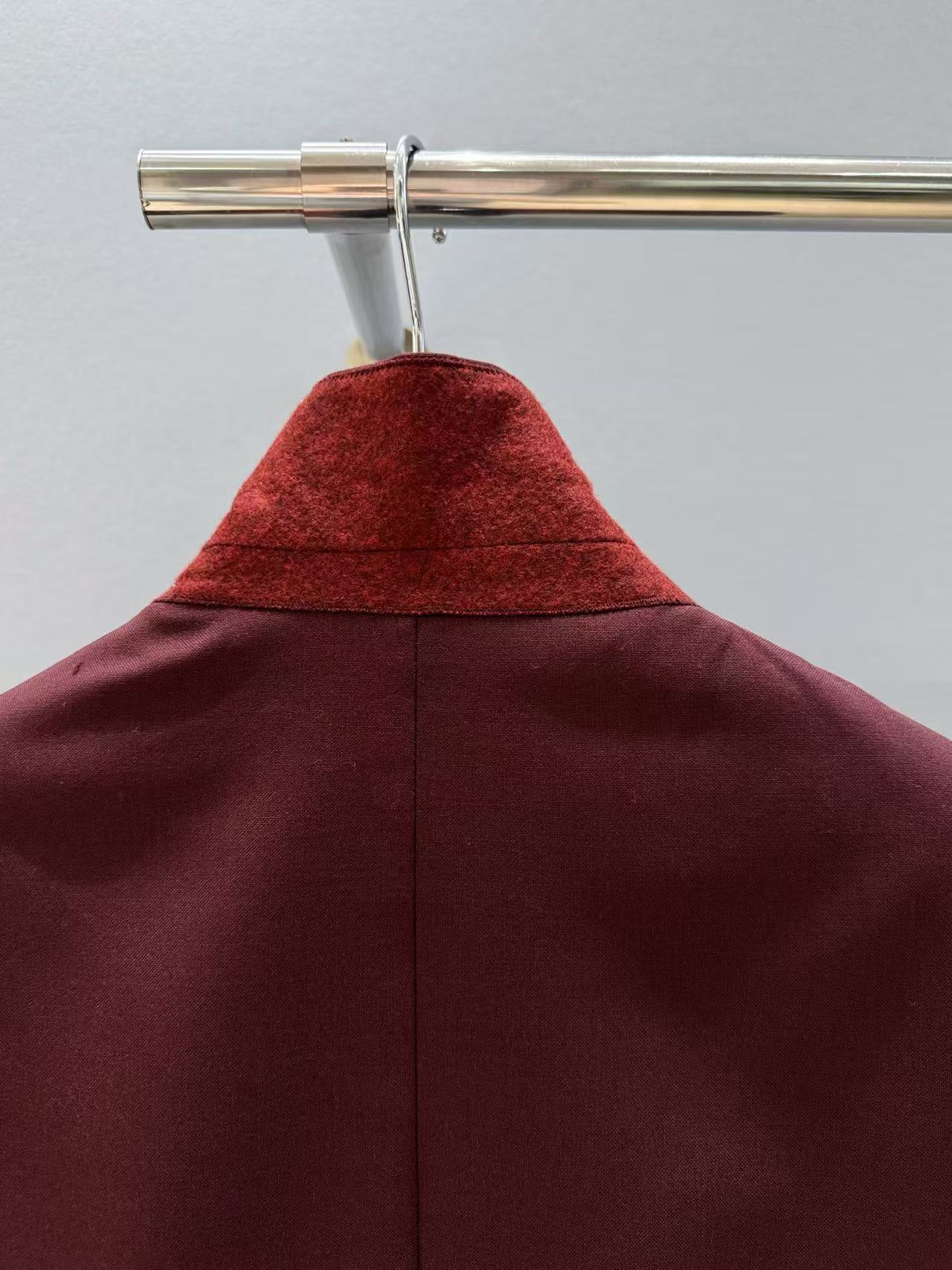 這款西裝一登場,就完美詮釋了所謂的「高級氣場」。正肩廓形設計俐落挺拔,搭配槍駁領與胸前立體剪裁,線條乾淨又極具結構感,讓整體比例更加修長。