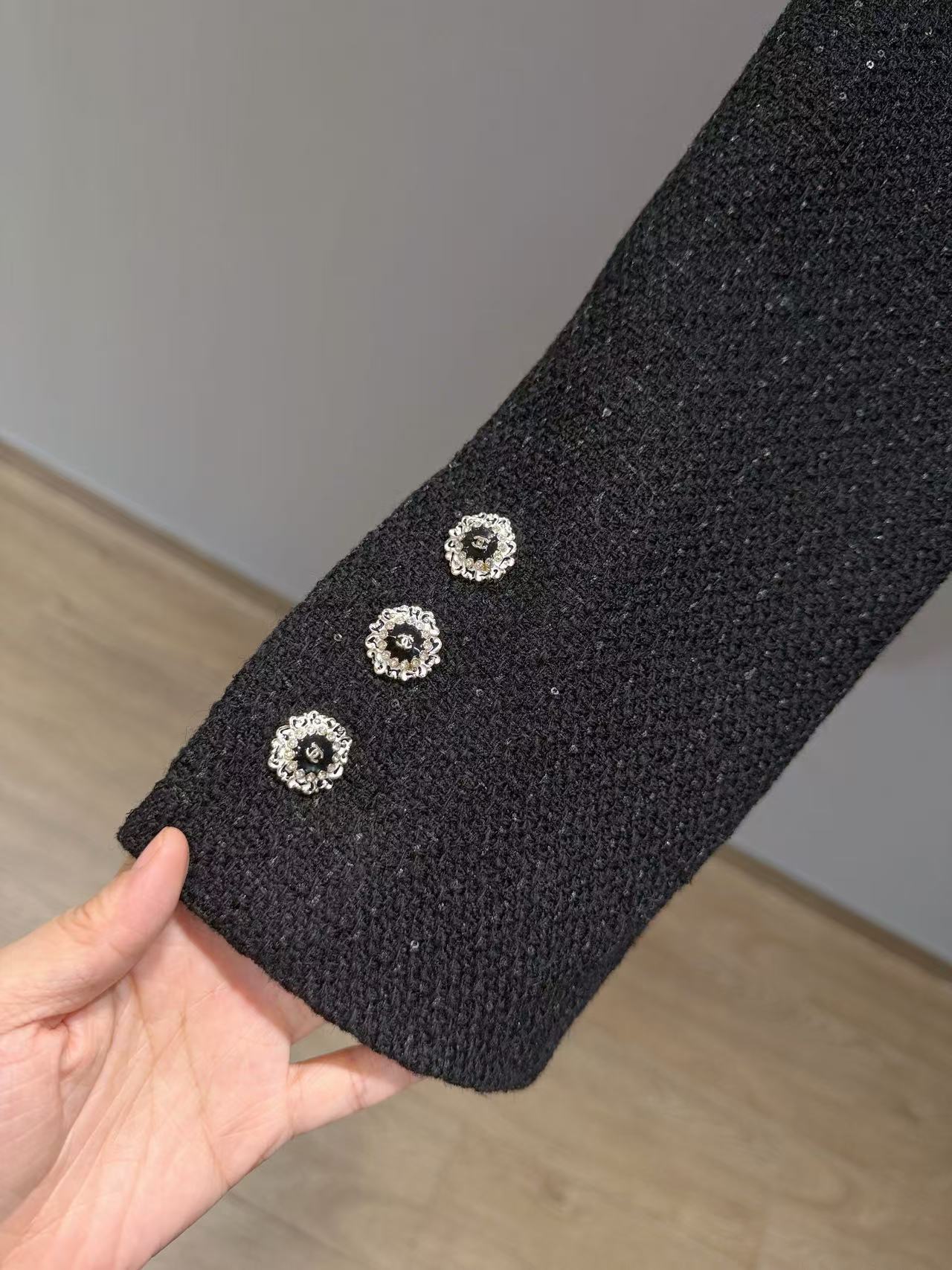 義大利進口粗花呢底布,混織細閃亮片,在炭黑基調裡低調閃耀,光線下像星空一樣美得剛剛好,完全不過分。