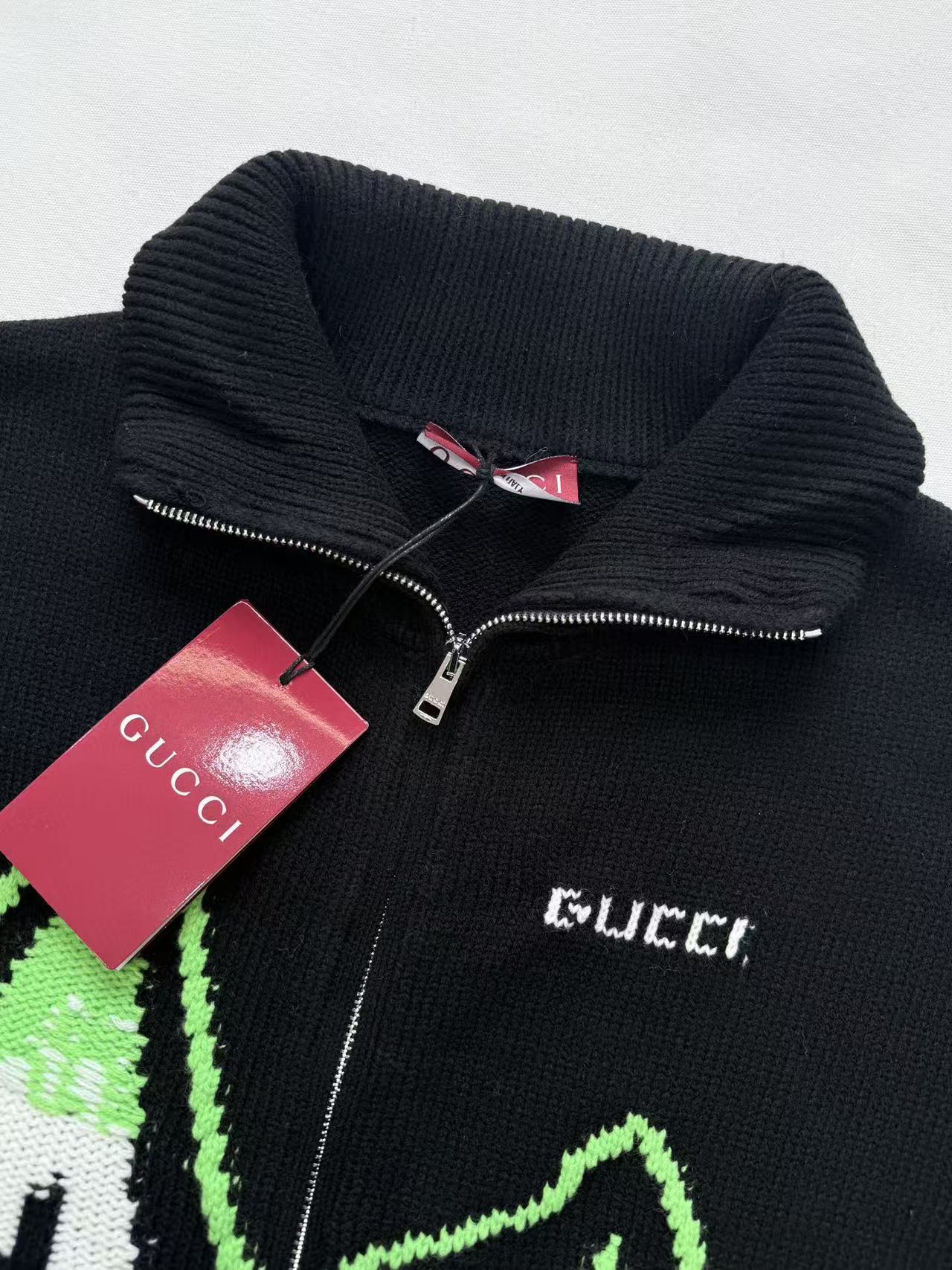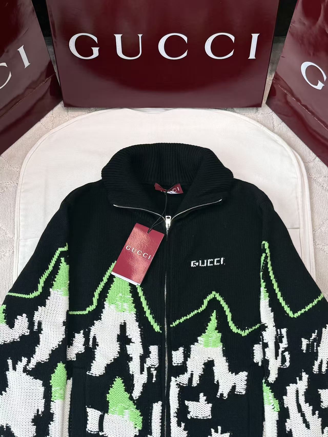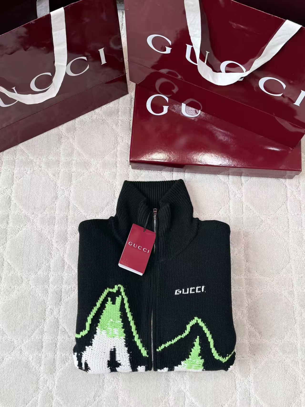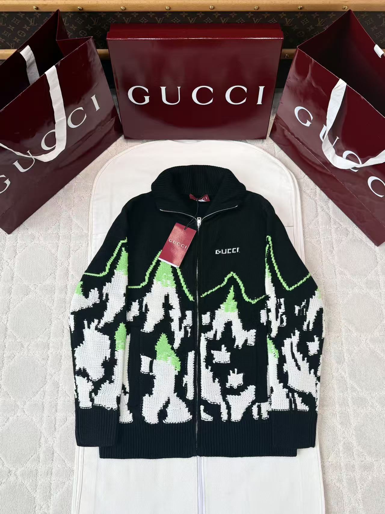 這款外套以細膩的拼色嵌花工藝呈現出一幅生動的山景圖騰,並巧妙融入品牌字母元素,打破了傳統針織衫的單一框架。