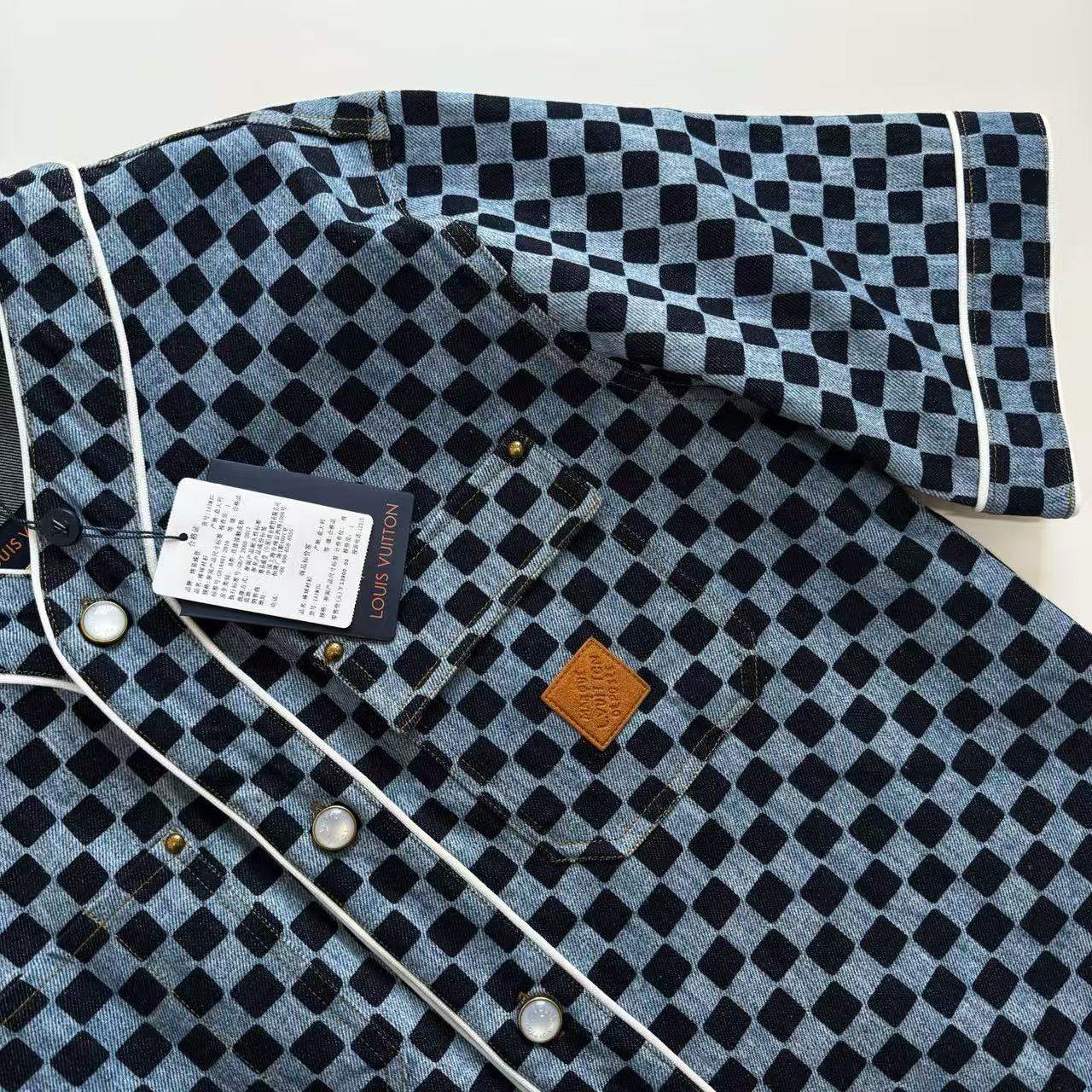 這件襯衫的材質真的非常講究!它使用了獨家訂製的棋盤格提花丹寧布料,將棋盤格和 3D 提花兩種技術結合,讓面料看起來更有層次感。面料還經過砂洗泛白做舊處理,完美營造出復古的質感,而且手感偏硬挺,還不易起皺!