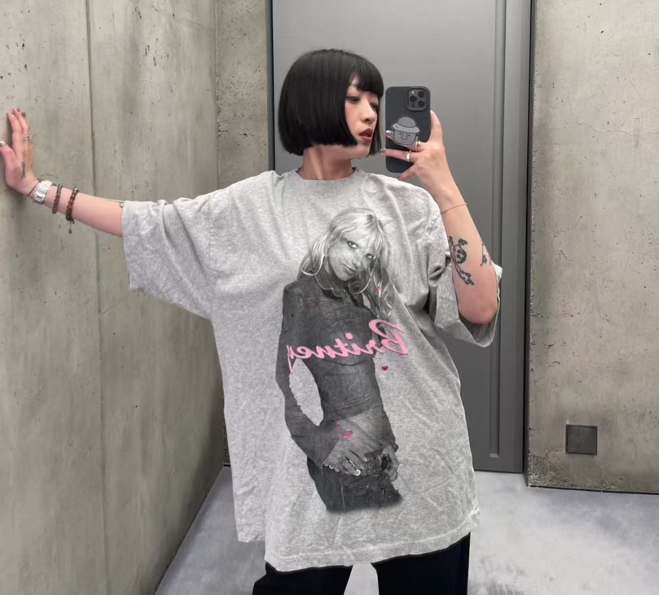 BLCG 攜手流行女王 Britney 打造的復古感人像印花短袖,不只圖像鮮明個性十足,還巧妙融入「龜裂效果」的數位印花工藝,讓整體視覺多了一層粗獷又叛逆的氛圍。