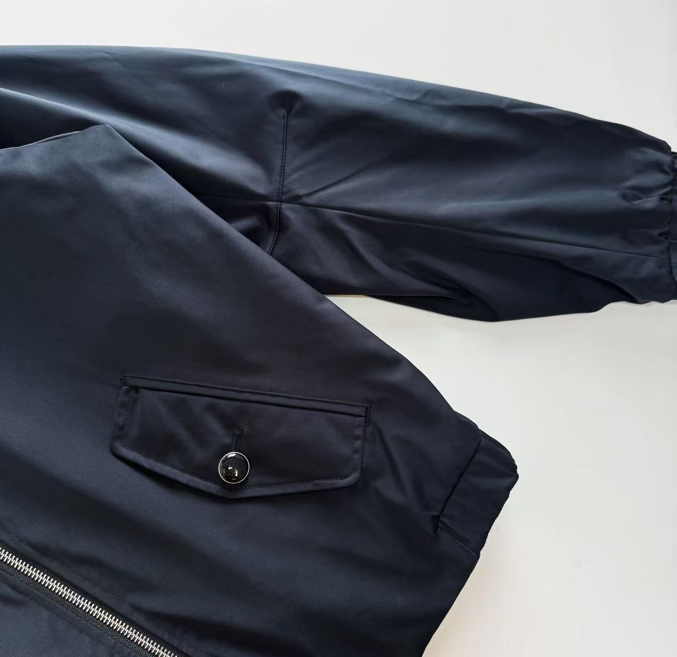 雙面設計聽起來簡單,做起來超級費工。印花得先在半成品階段定位,前後片完美銜接,排版、剪裁一絲不能馬虎;裁片全程紅外線雷射定位+人工手工精修,全身對花對紋,耗損率高到嚇人,但換來的是正品級的精準。拉鍊、豬鼻扣、五金全數開模訂製,重量感跟細節都到位,穿起來有份量卻不笨重。