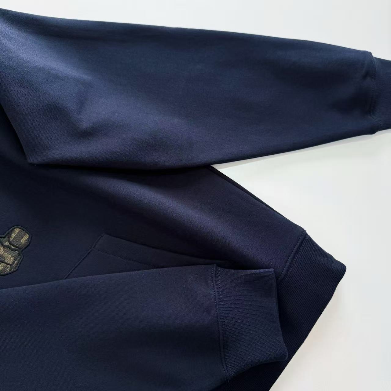 提花大貼片工藝: FF 標誌是先將一塊預先織造好的 FF 提花貼片,透過貼布繡工藝精準地固定於衛衣胸前。這種方式讓 Logo 更有層次和立體感。