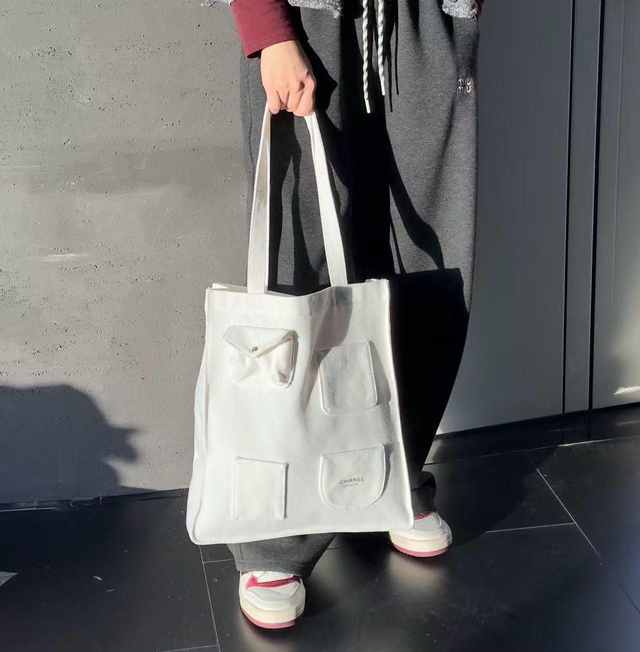 設計亮點:大容量與超強收納力這款托特包將大容量和收納機能發揮到極致,完全是日常通勤和收納的完美幫手:工裝風多口袋設計: 包身直接設計了 4 個不同形狀的外層貼袋,可以輕鬆收納各種隨身小物。