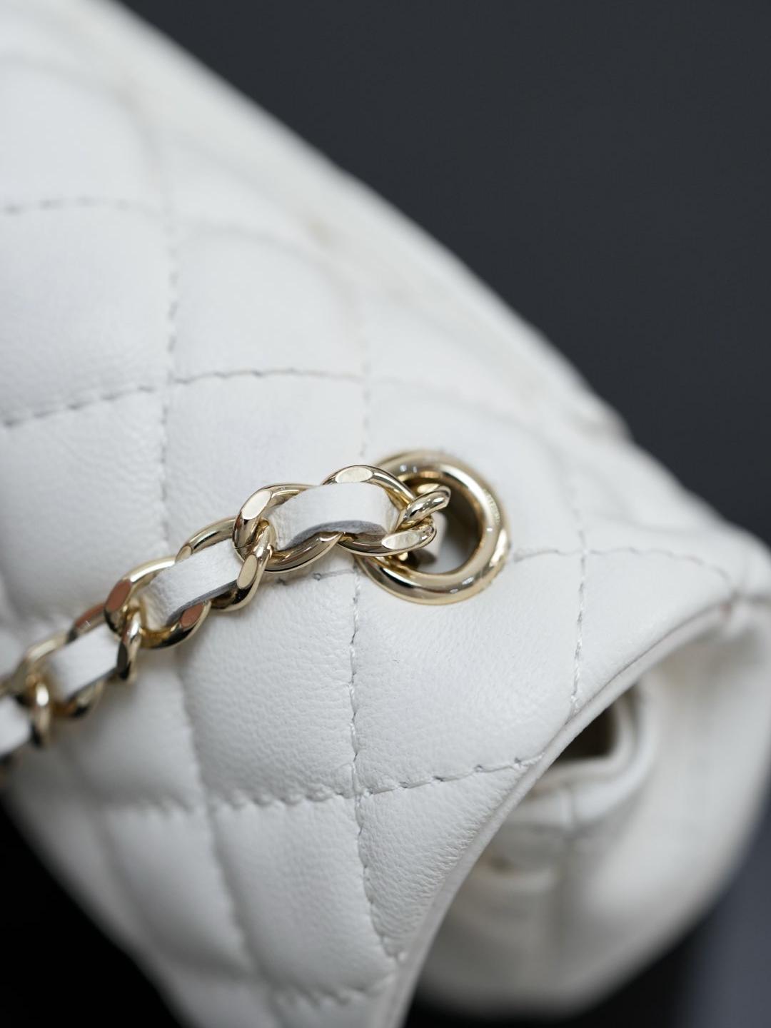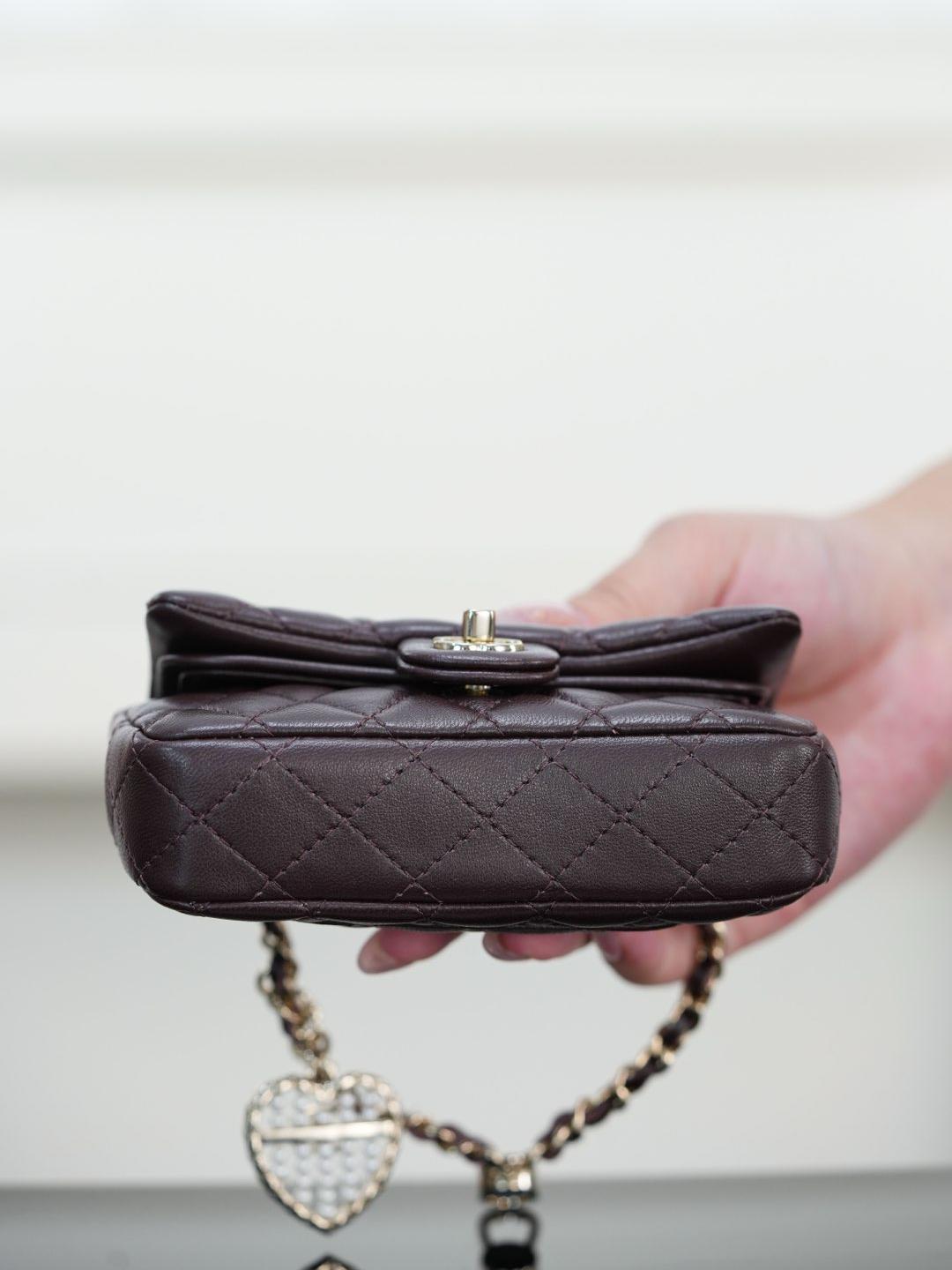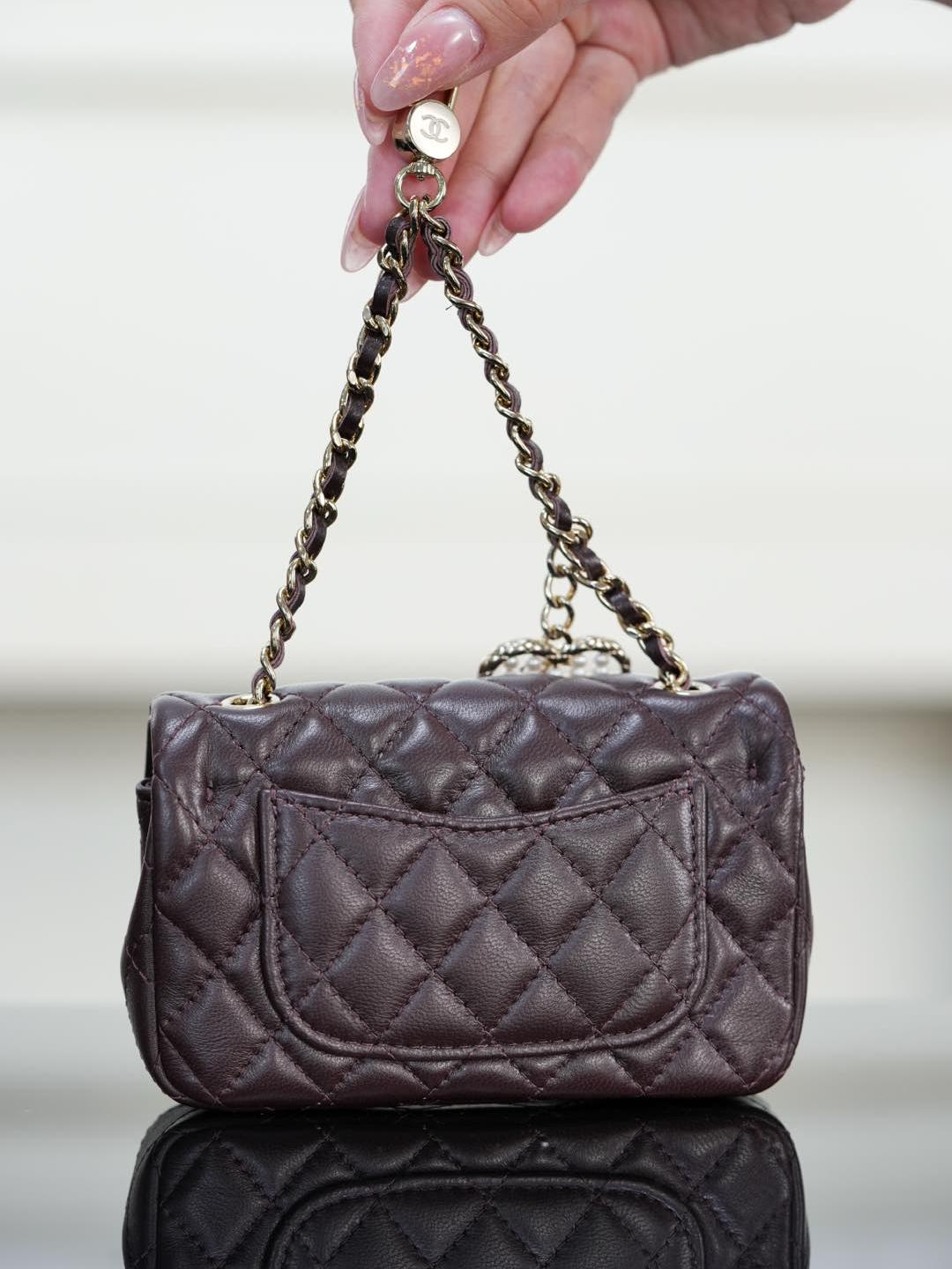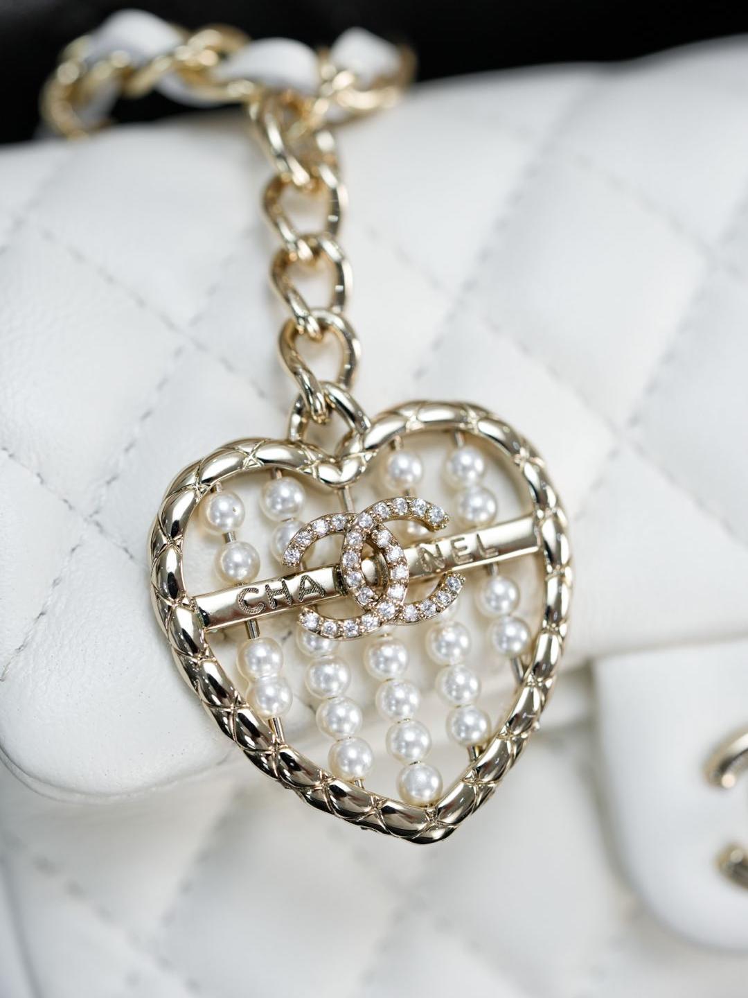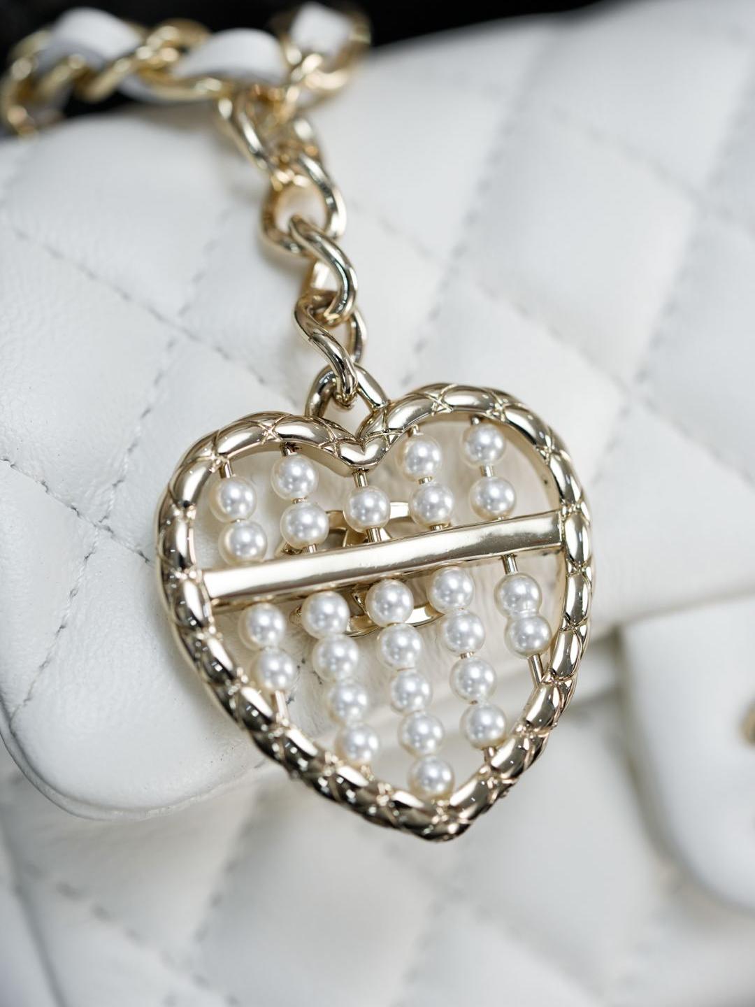 五金部分以經典皮穿金屬鏈條搭配特製裝飾,26 顆珍珠組成心形珠算盤,中央再由施華洛世奇真鑽點綴雙 C 標誌,低調卻極具奢華感。