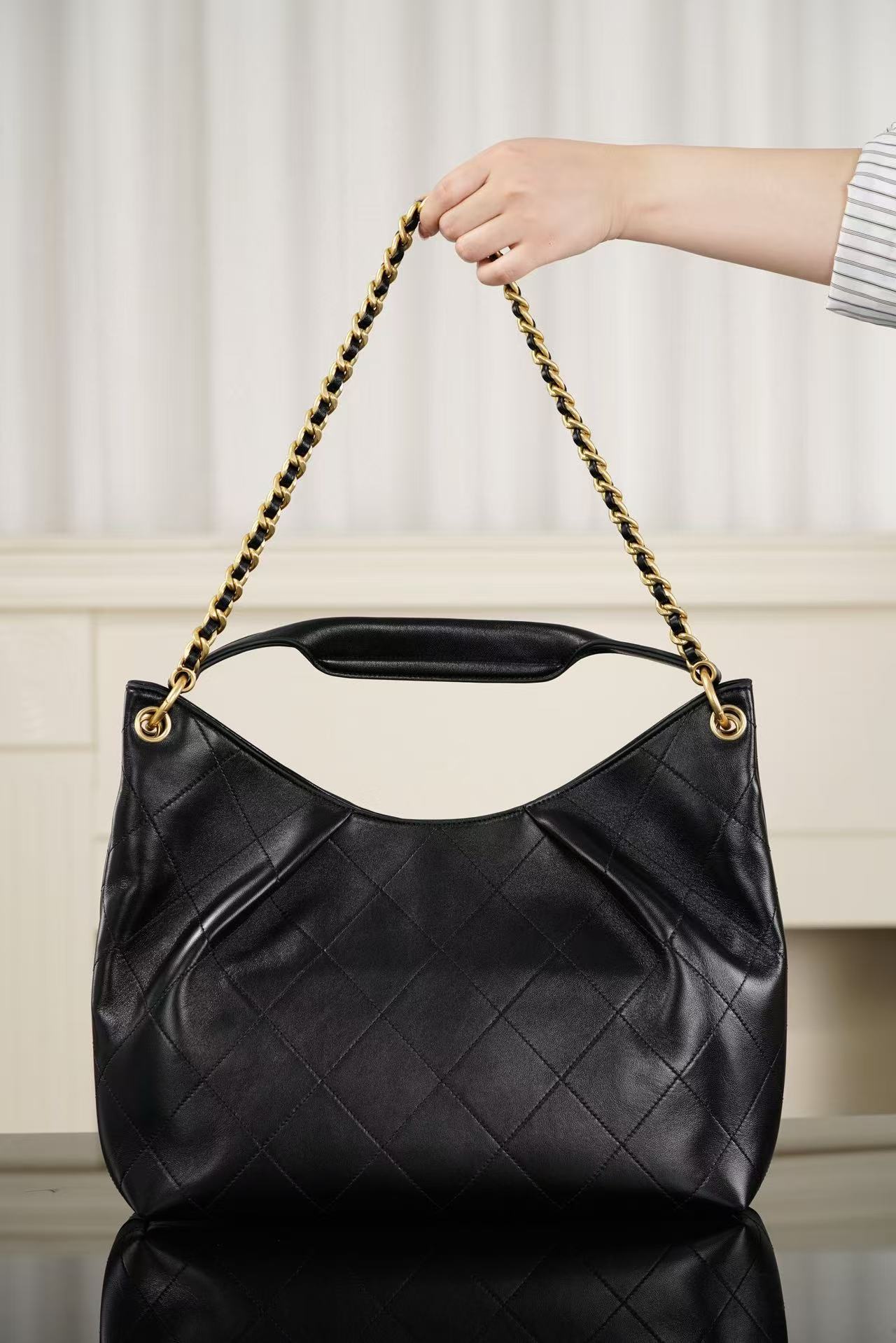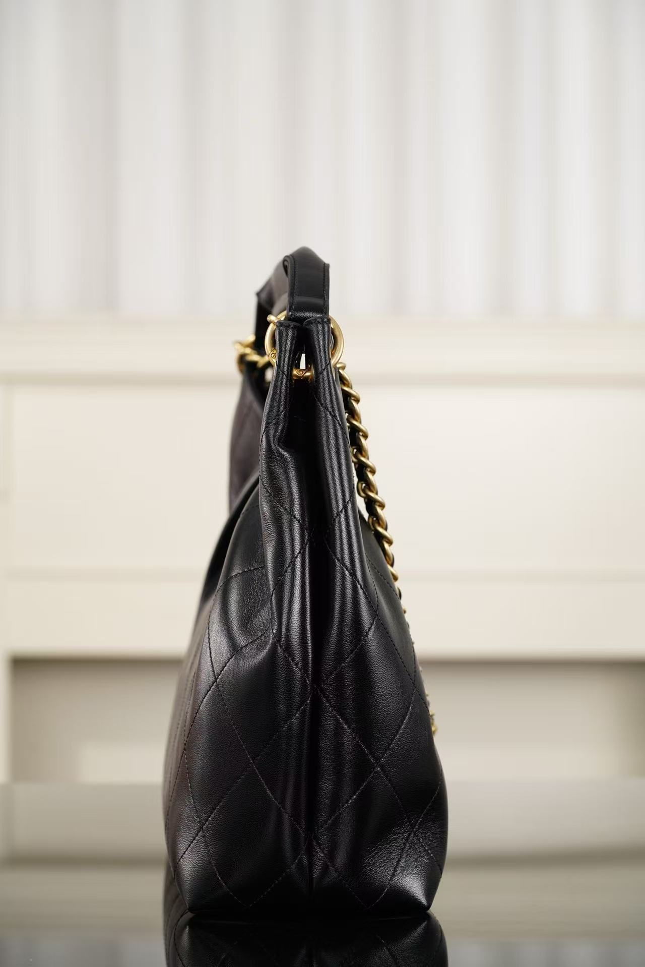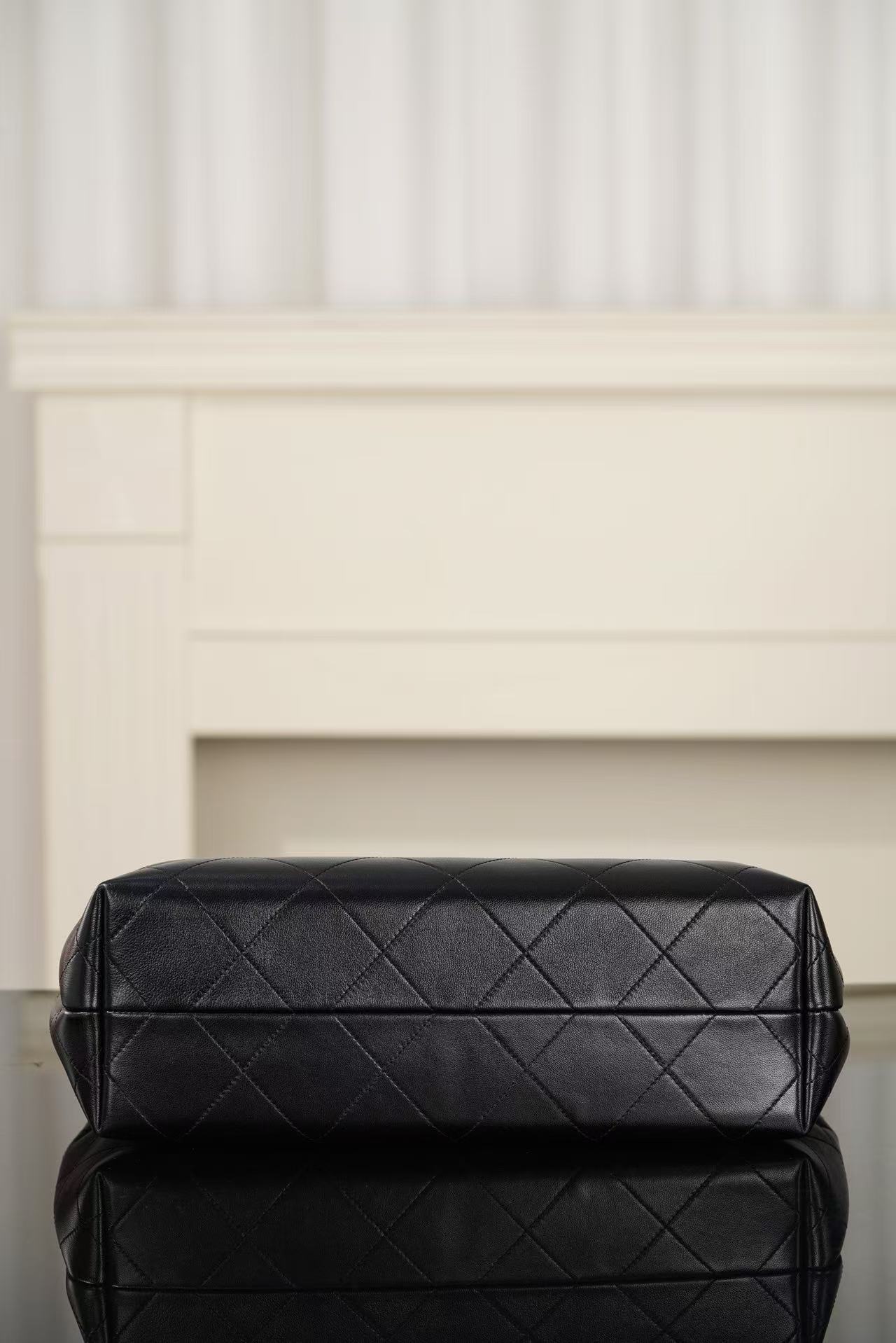 特供高品質細膩小羊皮: 嚴選大面積、無瑕疵的頂級胎羊皮,手感軟糯溫潤且具備絲綢般的微光澤。大號包身需要更強的皮革韌性,這款材質在維持輕盈感的同時,能承受大容量負重後的自然下垂美感。