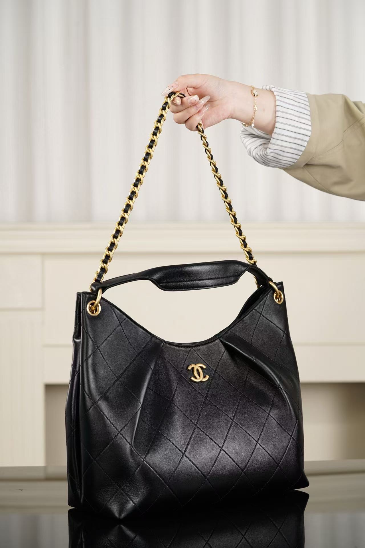 精工黑金鏈條與超大實用空間: 鏈條與手柄的銜接處採用了重金屬真空電鍍工藝,色澤深邃且耐磨。