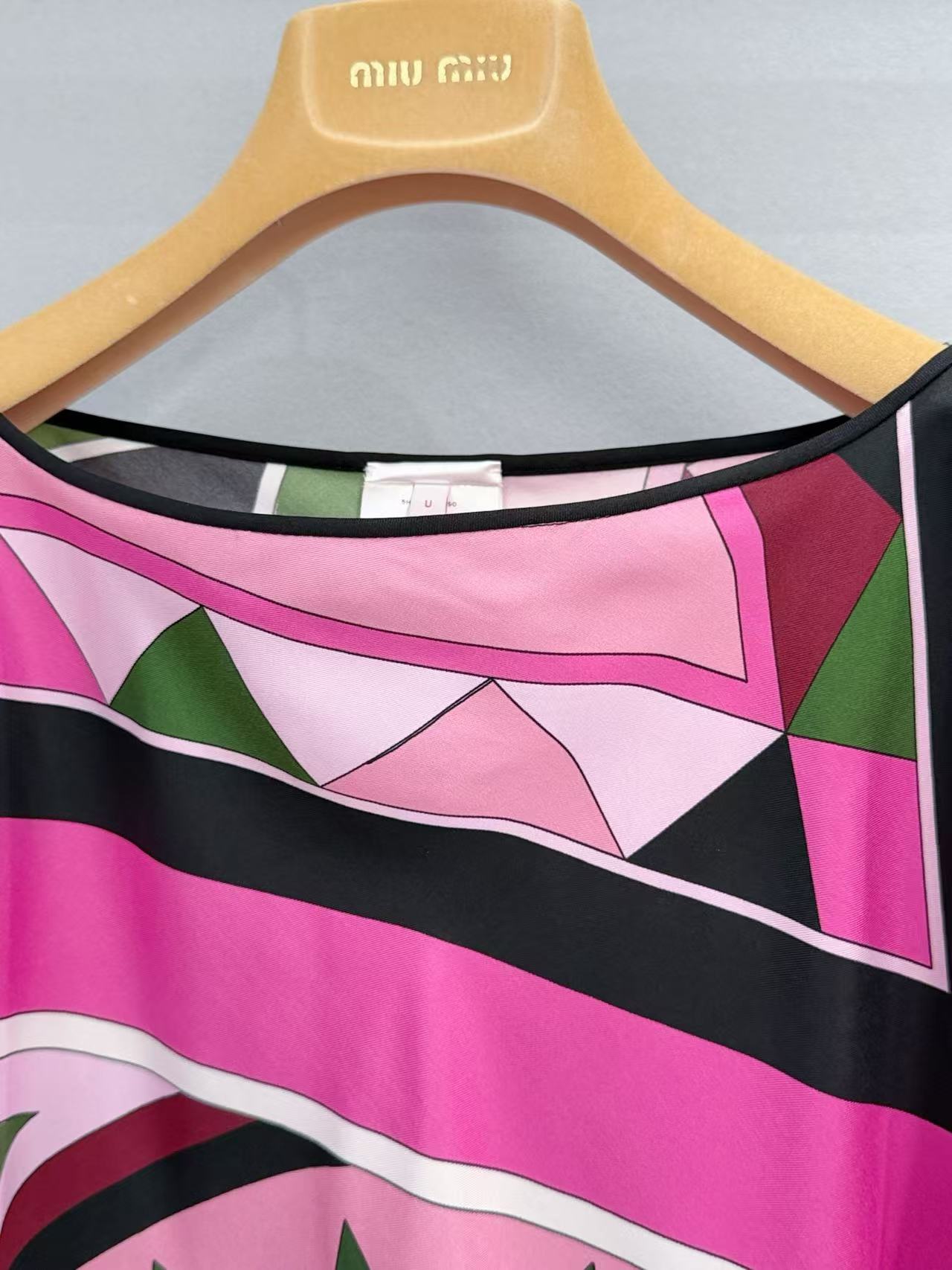 前後片幅採用了精密對稱的漩渦迷幻紋定位印花,色彩鮮明對比,視覺層次極其豐富。搭配妳之前看中的 極簡羊皮人字拖,這種「繁複真絲 x 極簡皮革」的組合,就是最高級的南歐度假 Look。