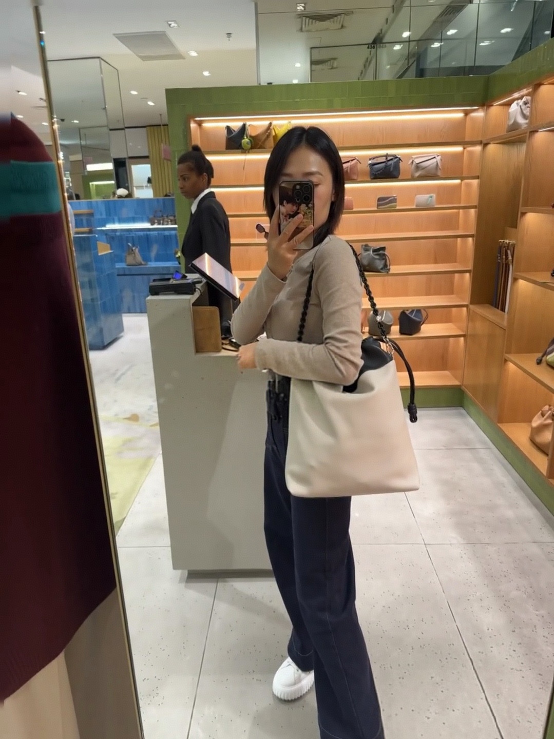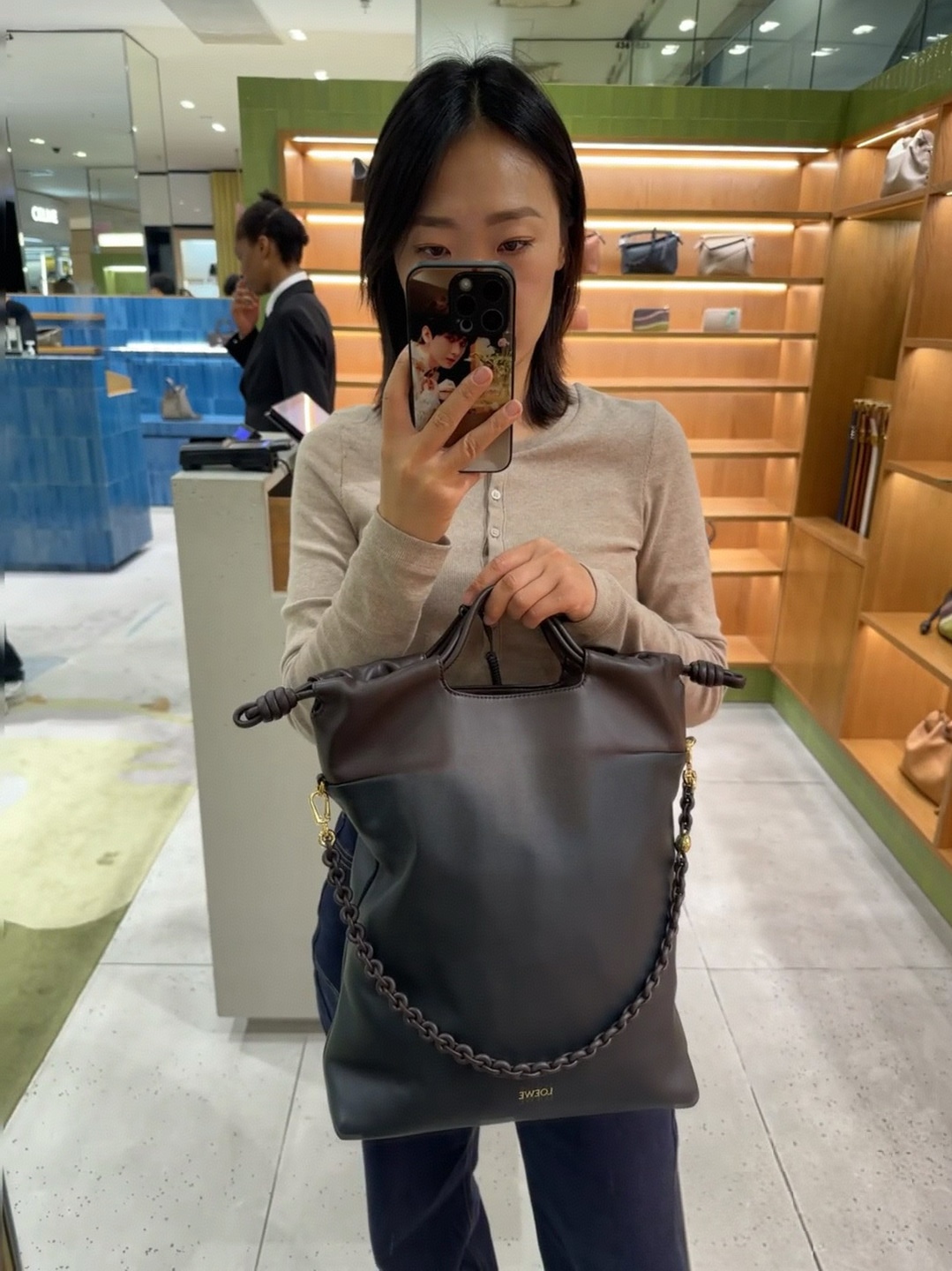 側邊搭配品牌標誌性的繩結細節,低調中帶點設計巧思,慵懶卻不隨便,完全是那種「看起來很會穿搭」的包款。