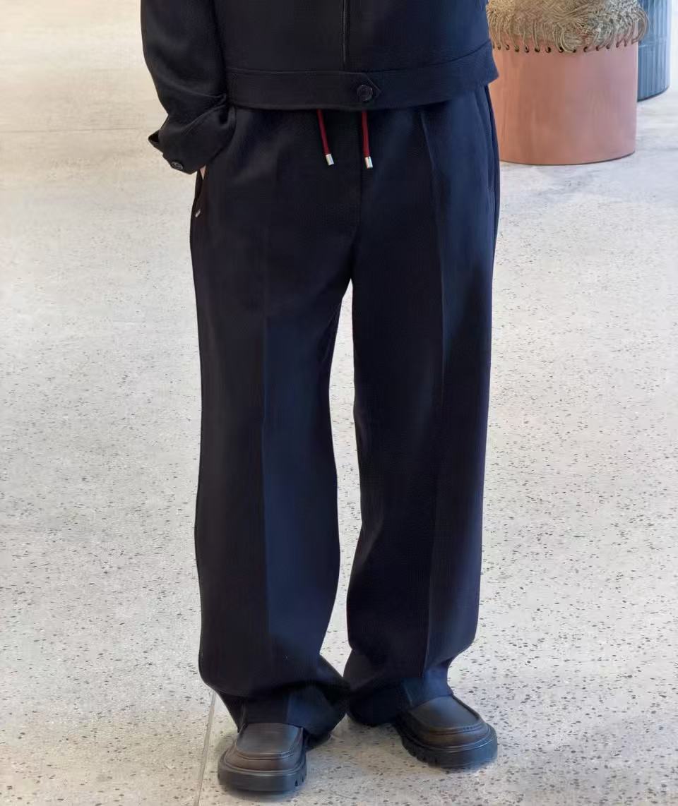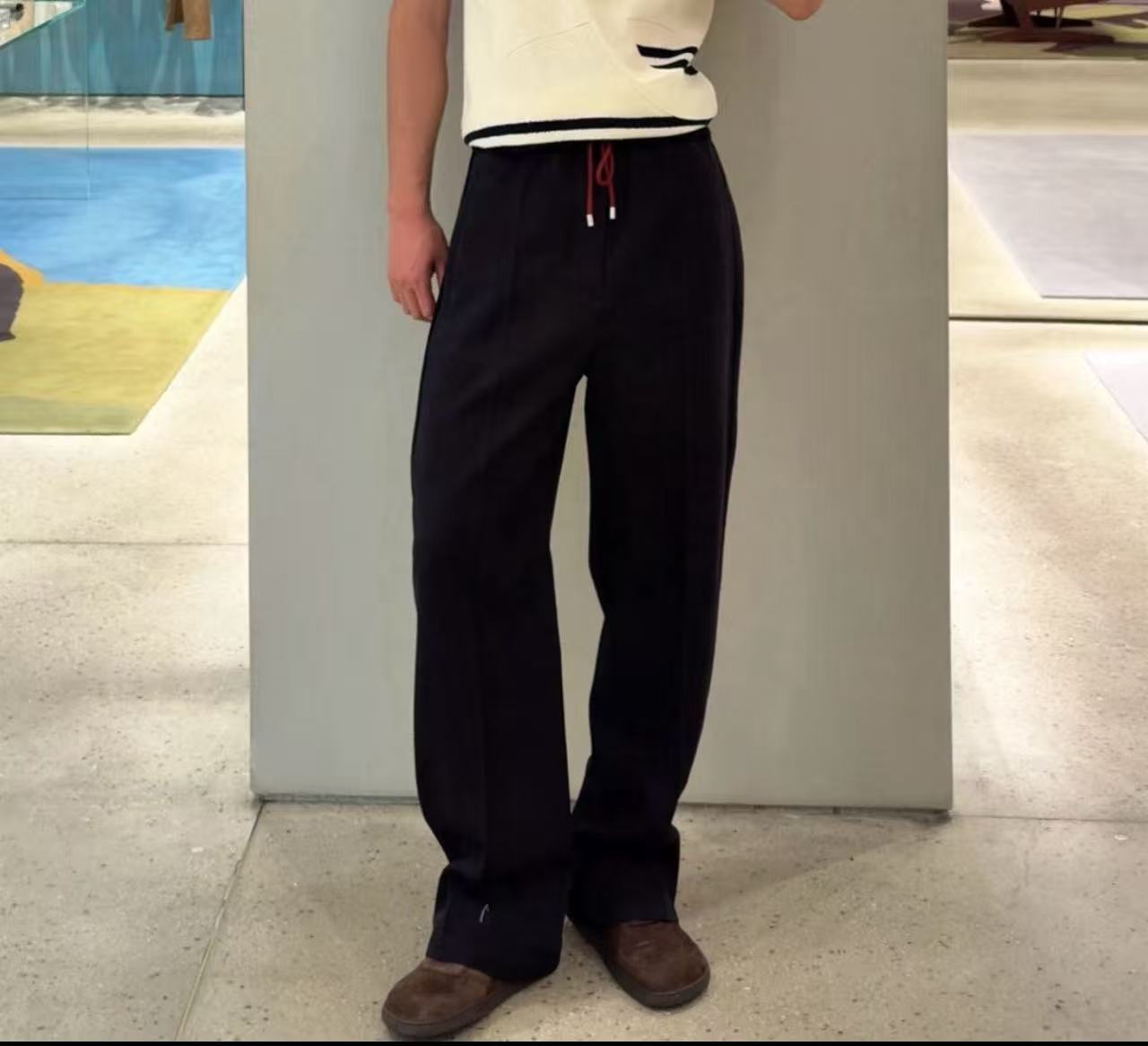 這款長褲在版型與細節處展現了極致的「平衡感」。採用最受推崇的中腰垂直運動版型,不僅能有效修飾腿部線條,更營造出不費力的鬆弛感。腰頭處特別選用紅棕色抽繩與松緊帶設計,在極簡的視覺中點綴出溫潤的層次跳色,讓舒適度與設計感並存。