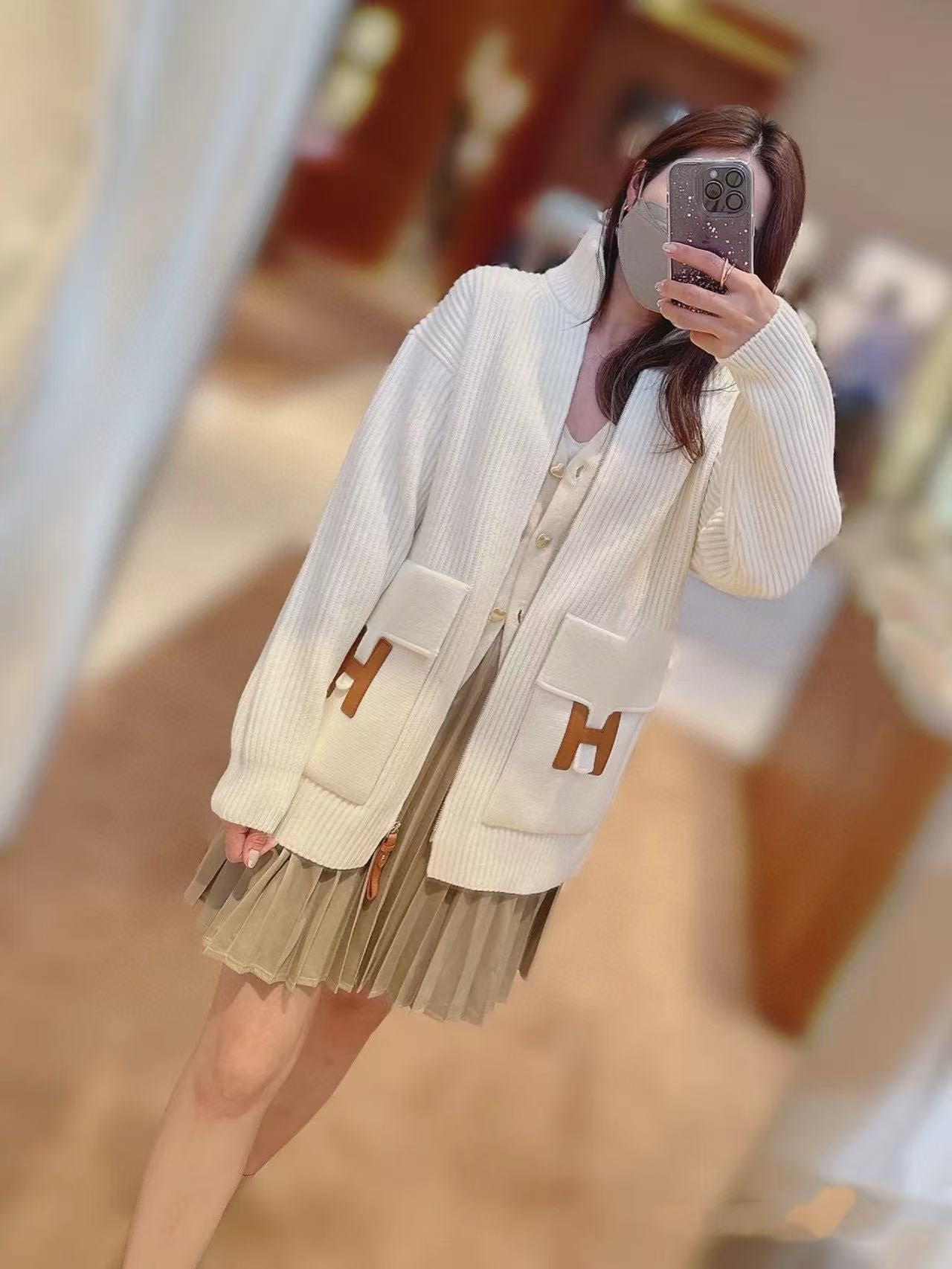奶油白毛呢搭配 棕色皮革 “H” 口袋設計,低調卻極具辨識度,細節之處展現品牌高級工藝。