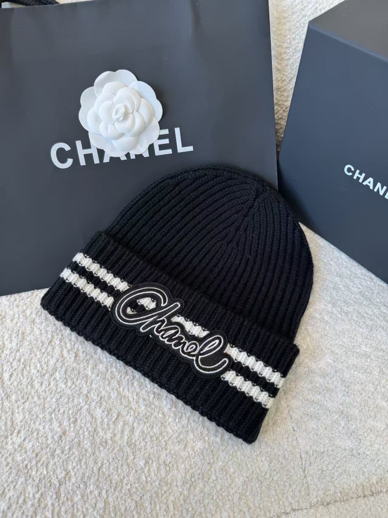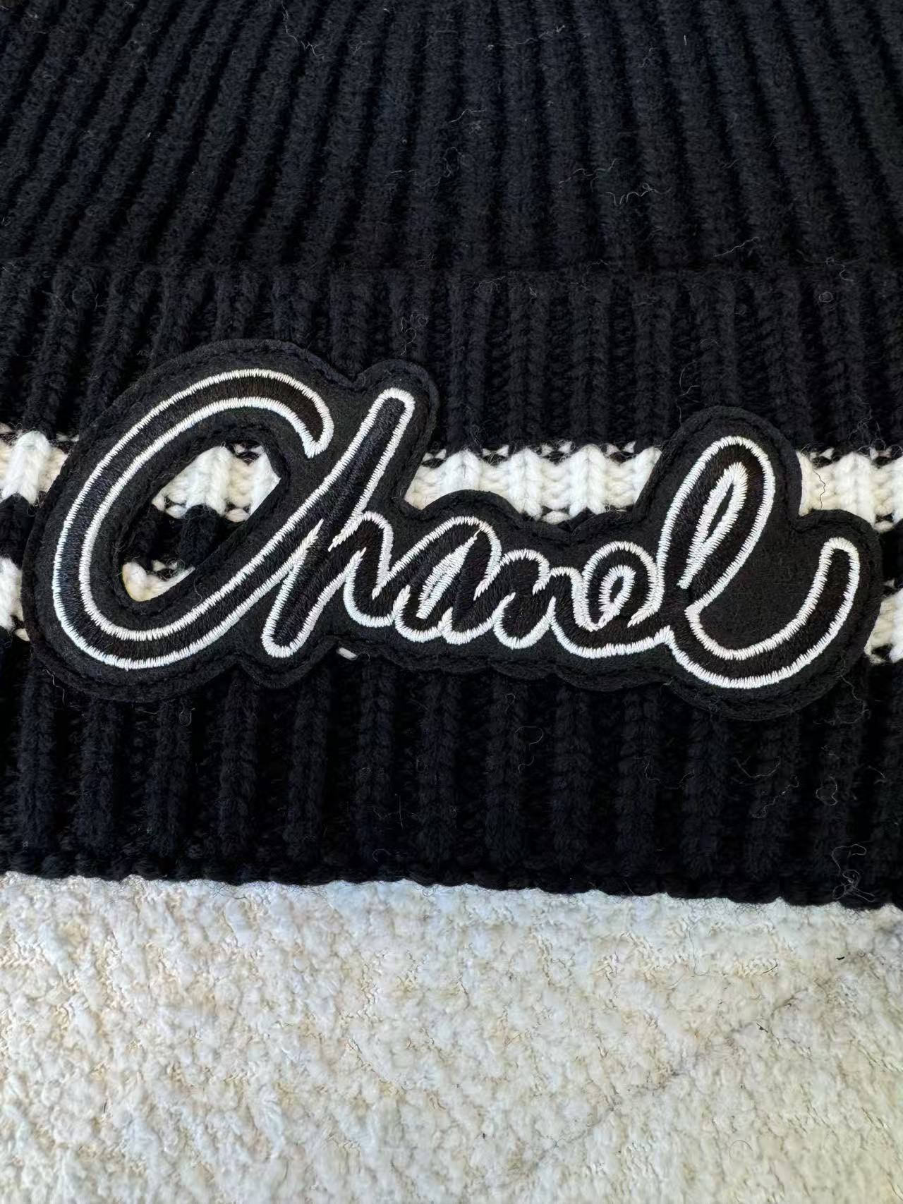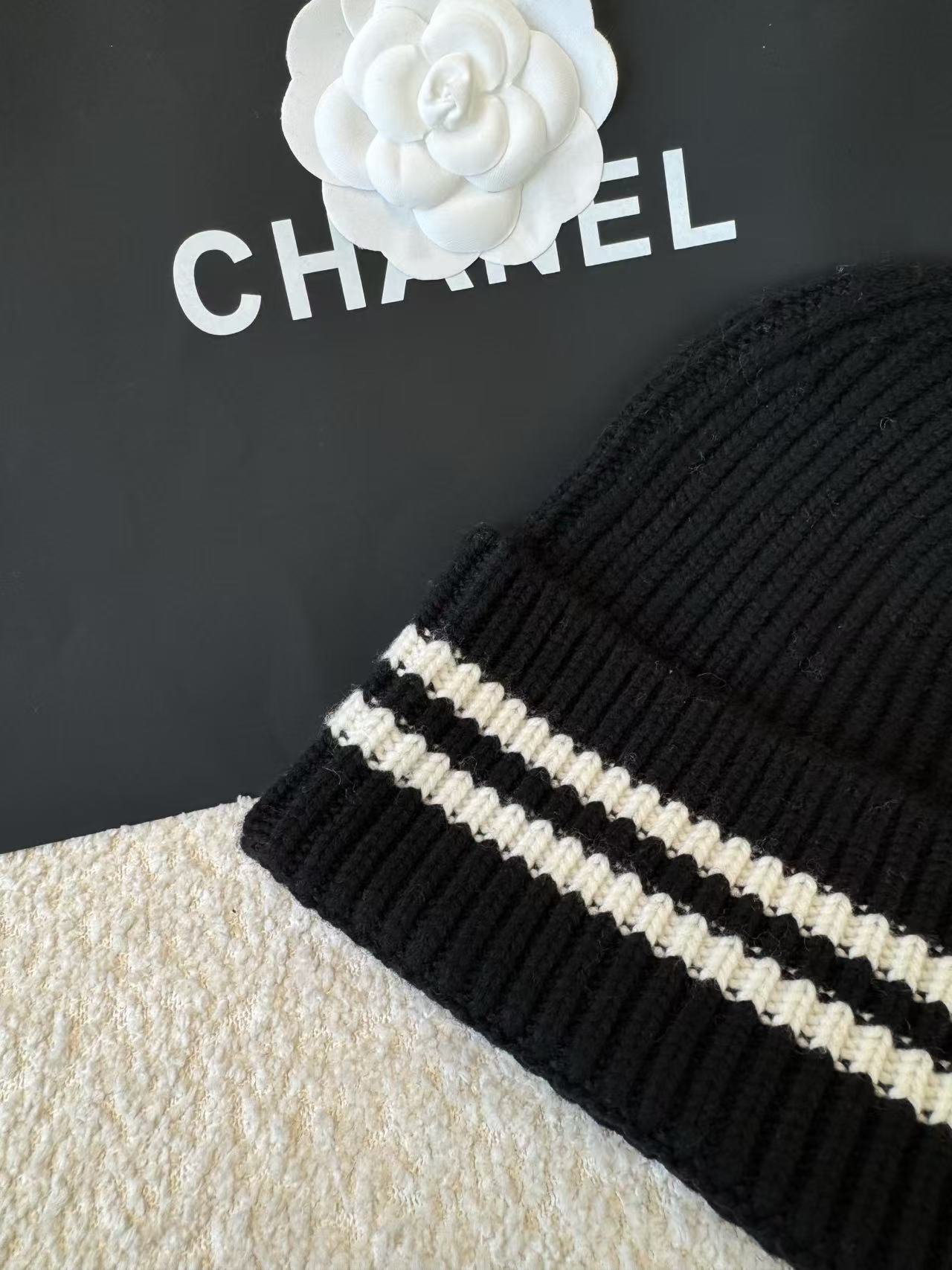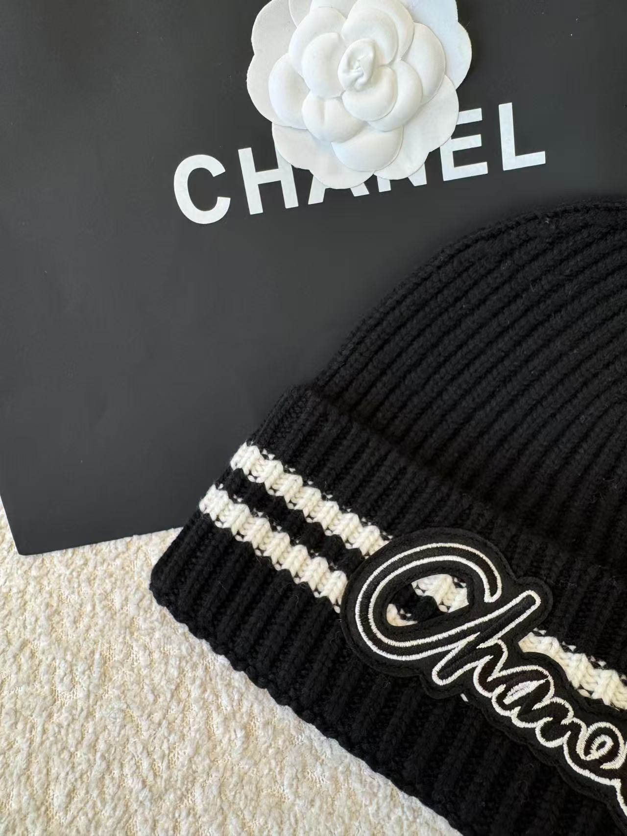 經典黑底毛帽,帽身前面直接繡上白色雙C Logo,兩側再各加一道白色粗細雙槓