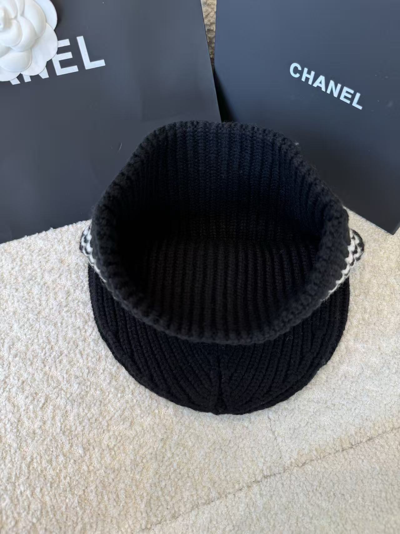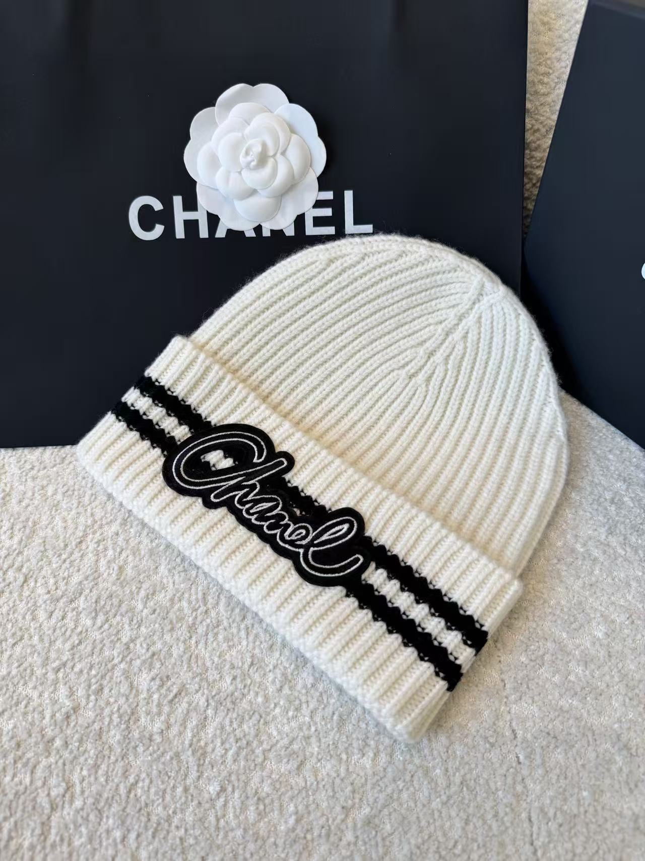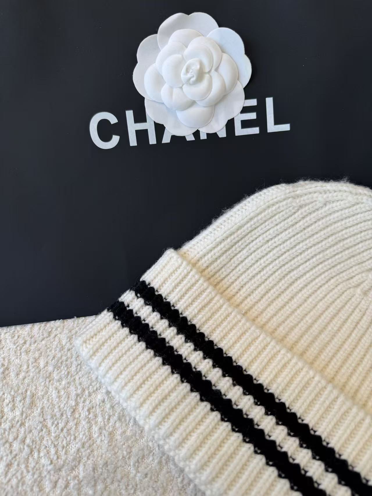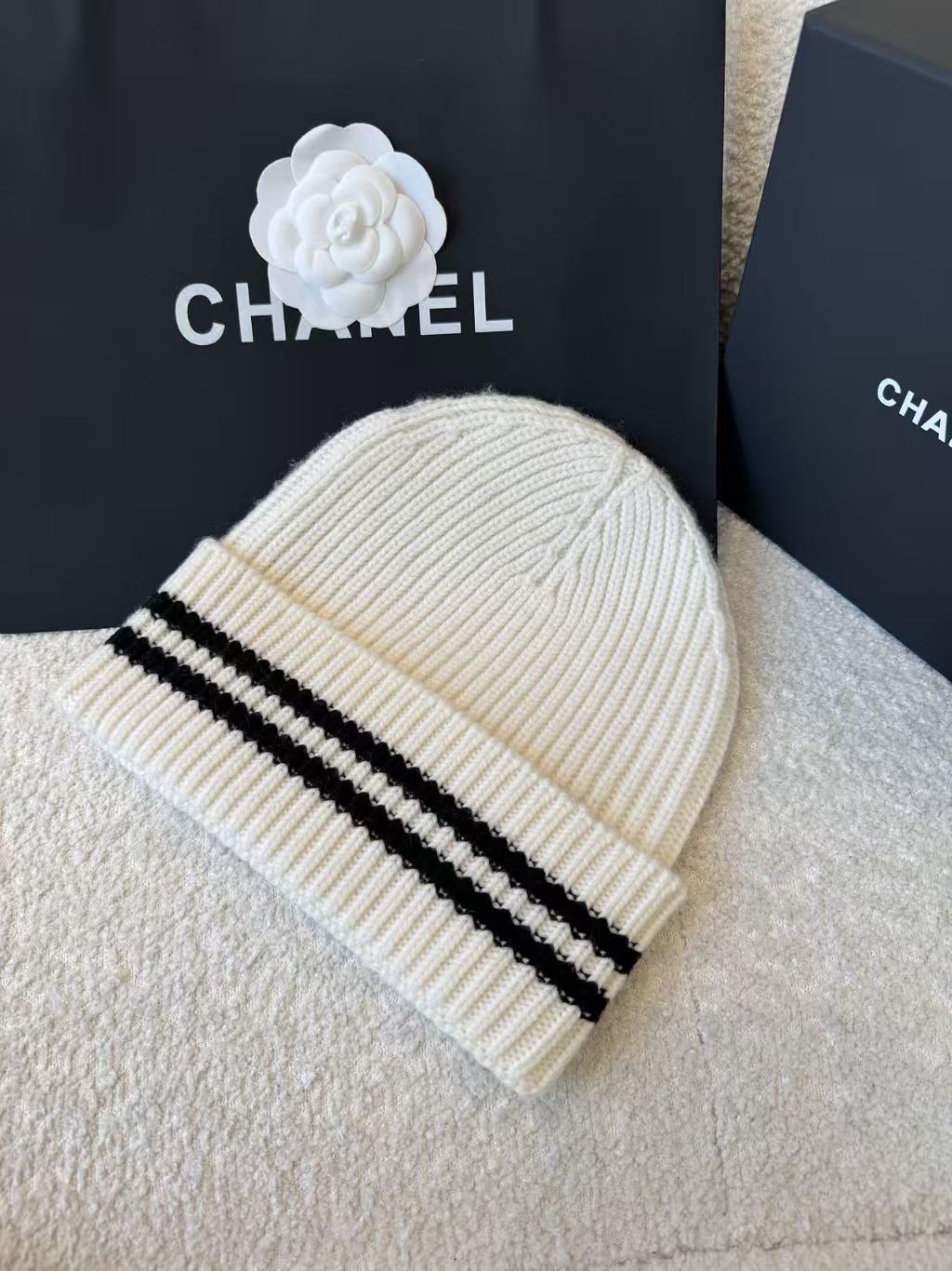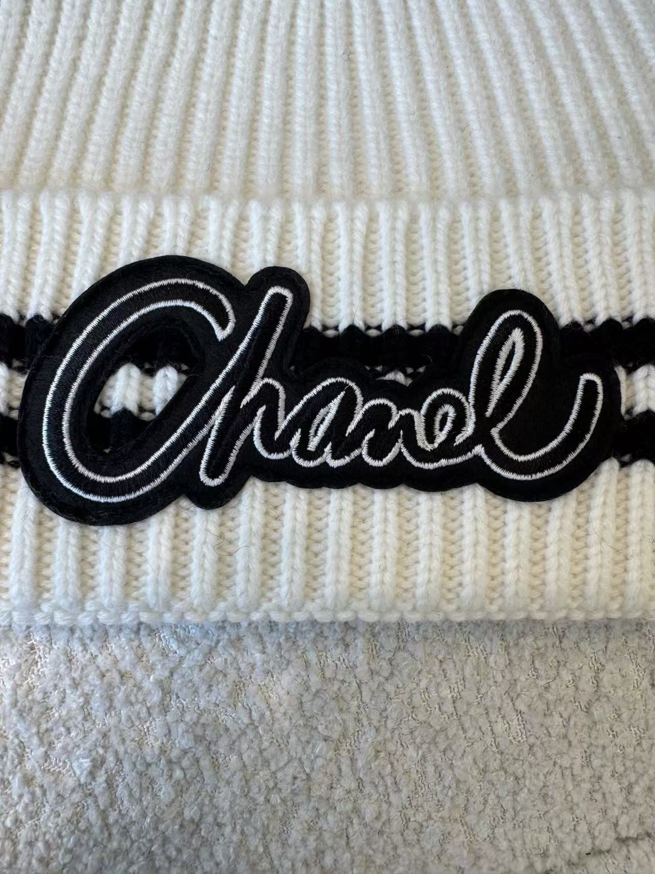 經典黑底毛帽,帽身前面直接繡上白色雙C Logo,兩側再各加一道白色粗細雙槓
