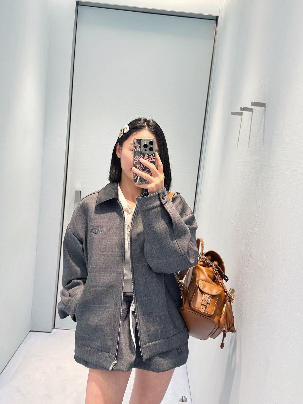 2025秋冬 MIU家 字母貼布繡格紋皮質翻領外套,休閒時髦的秋冬必備!