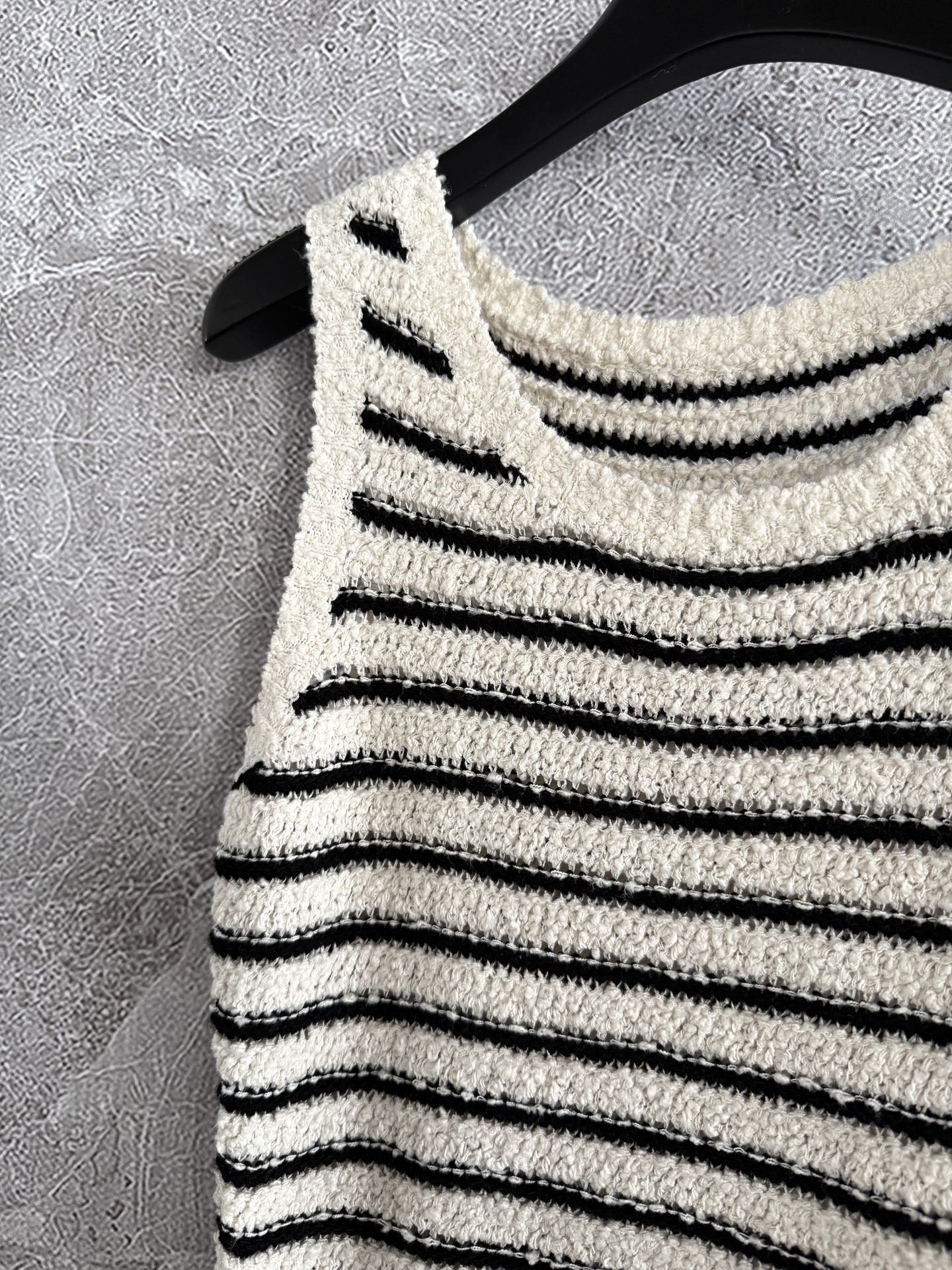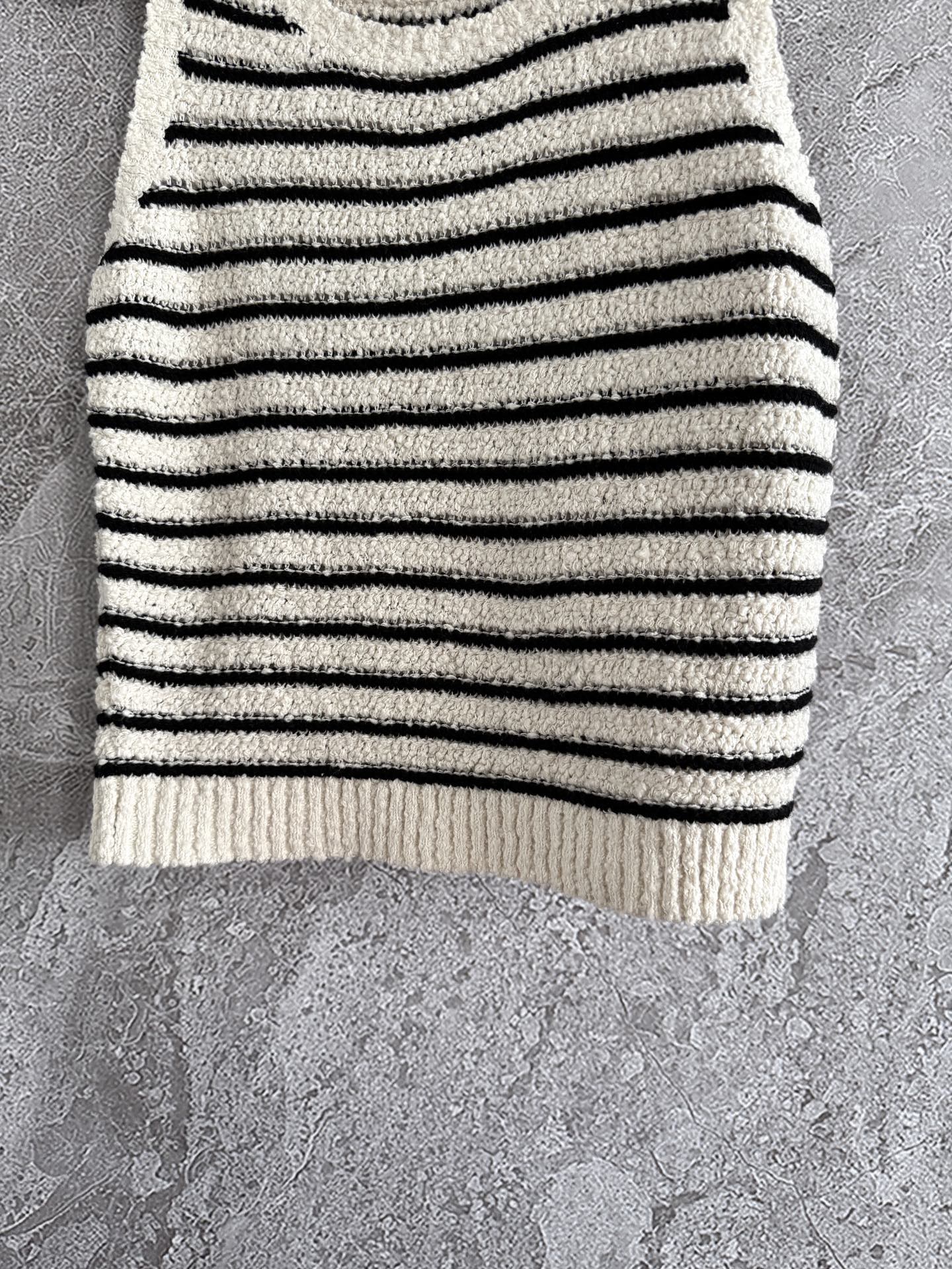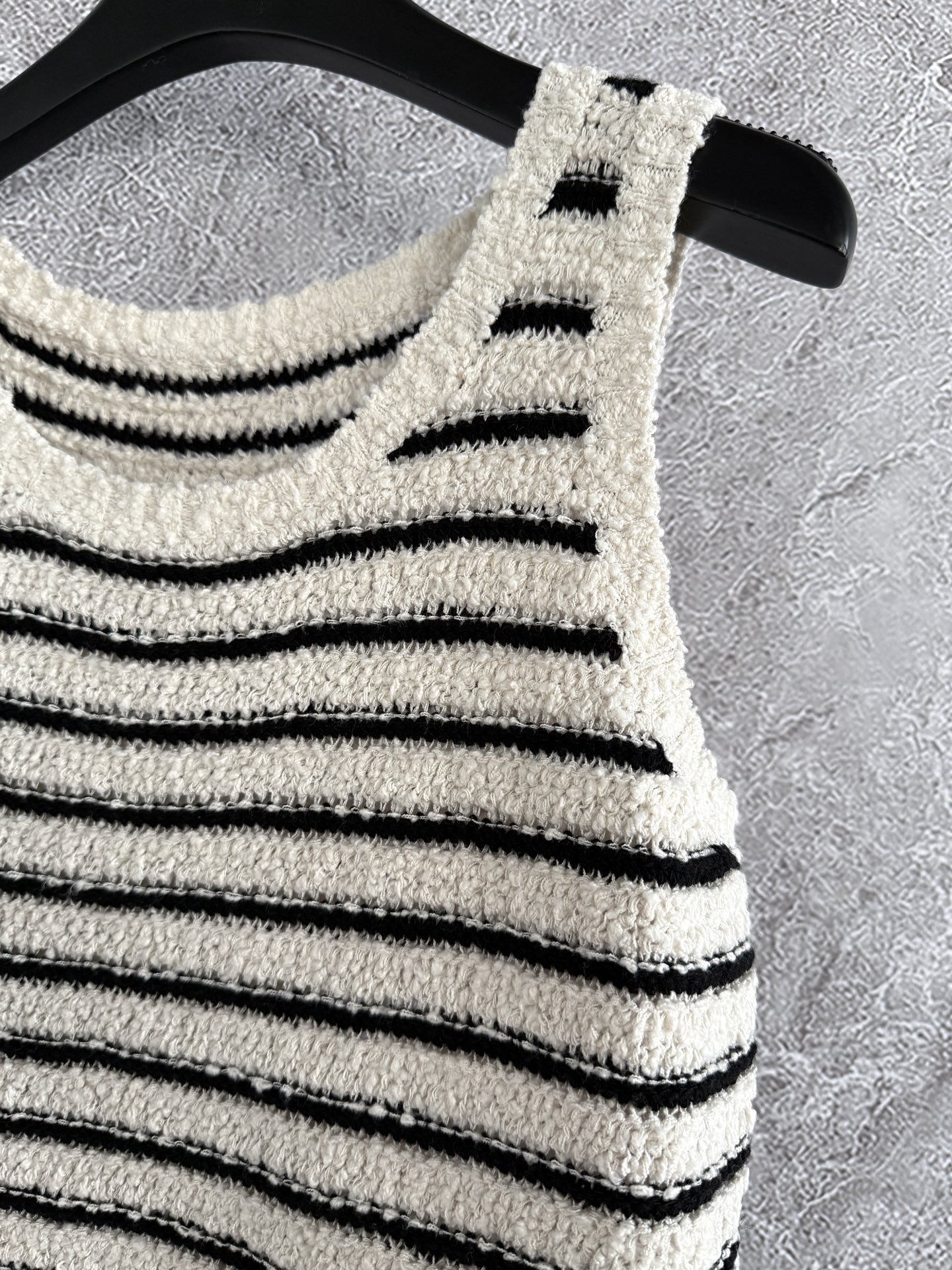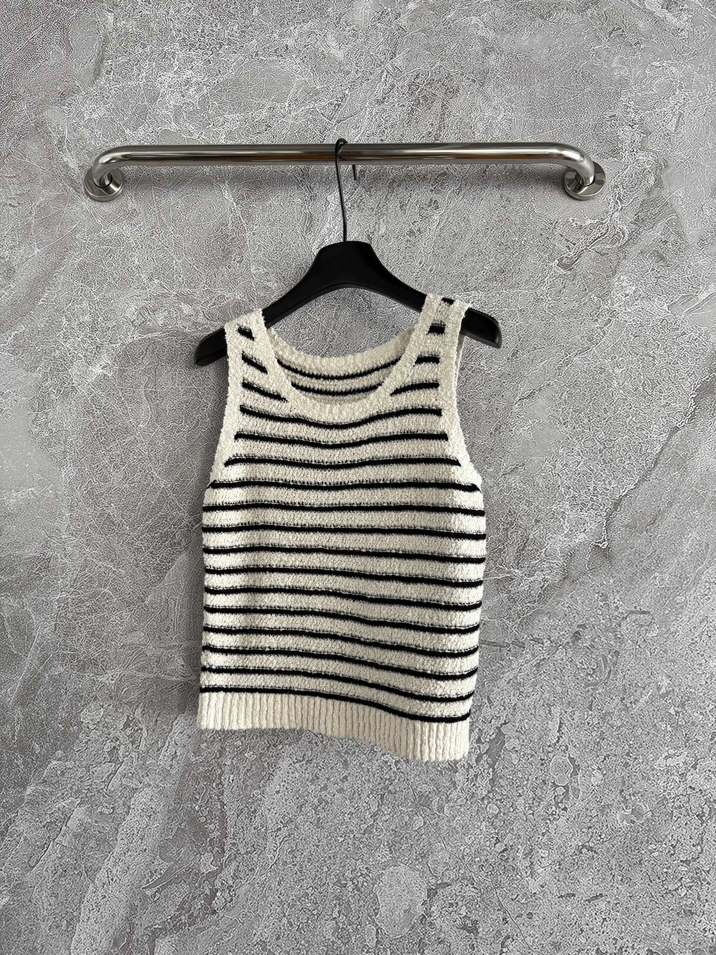 這件條紋背心屬於那種「低調卻耐穿」的單品。版型設計上沒有過度浮誇的細節,反而是靠著質地與氛圍取勝,正因如此,它的穿搭利用率極高。
