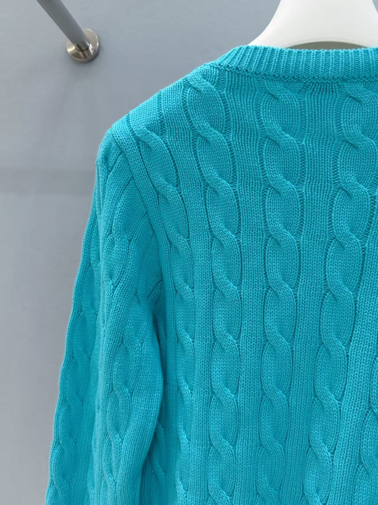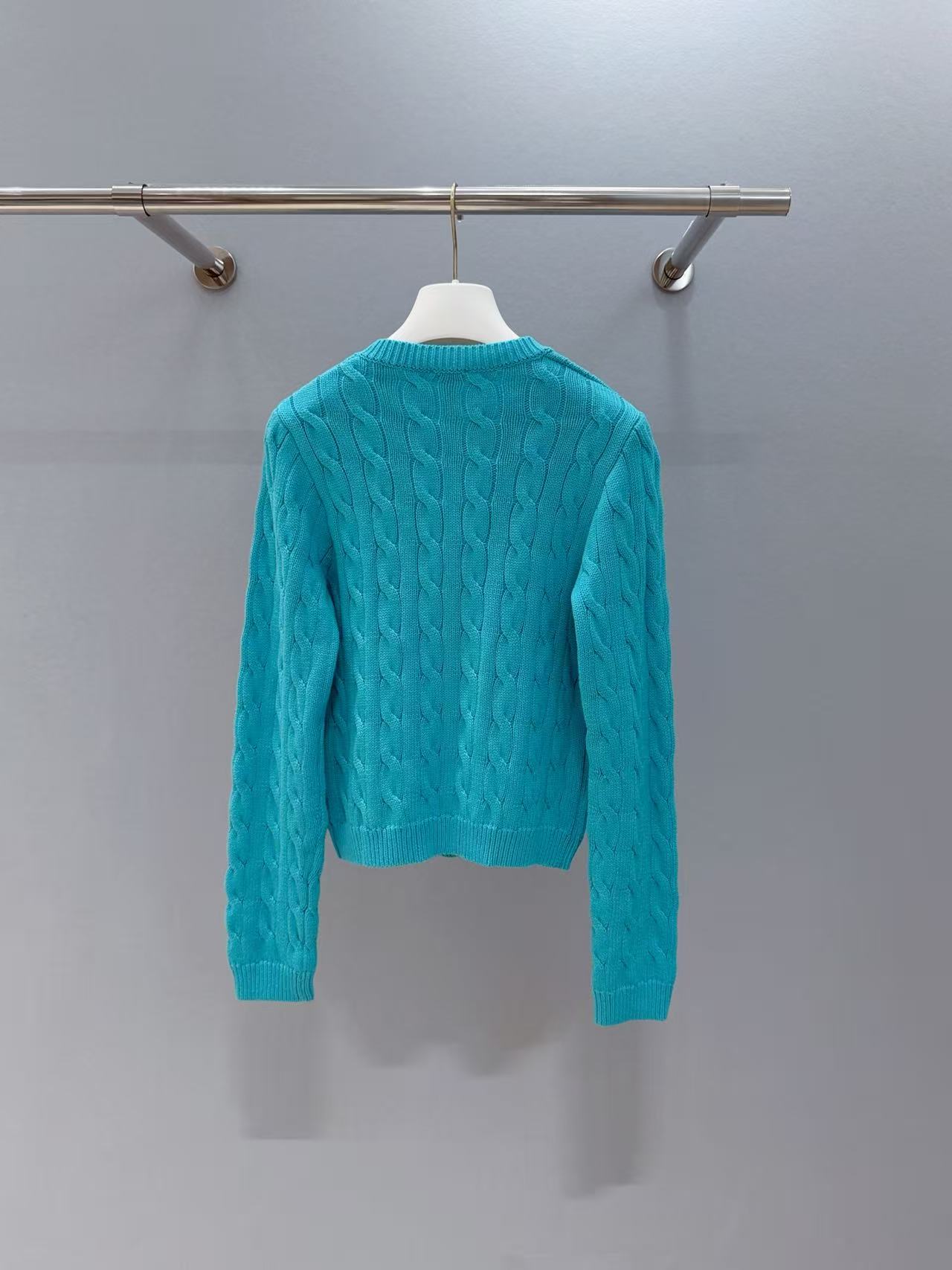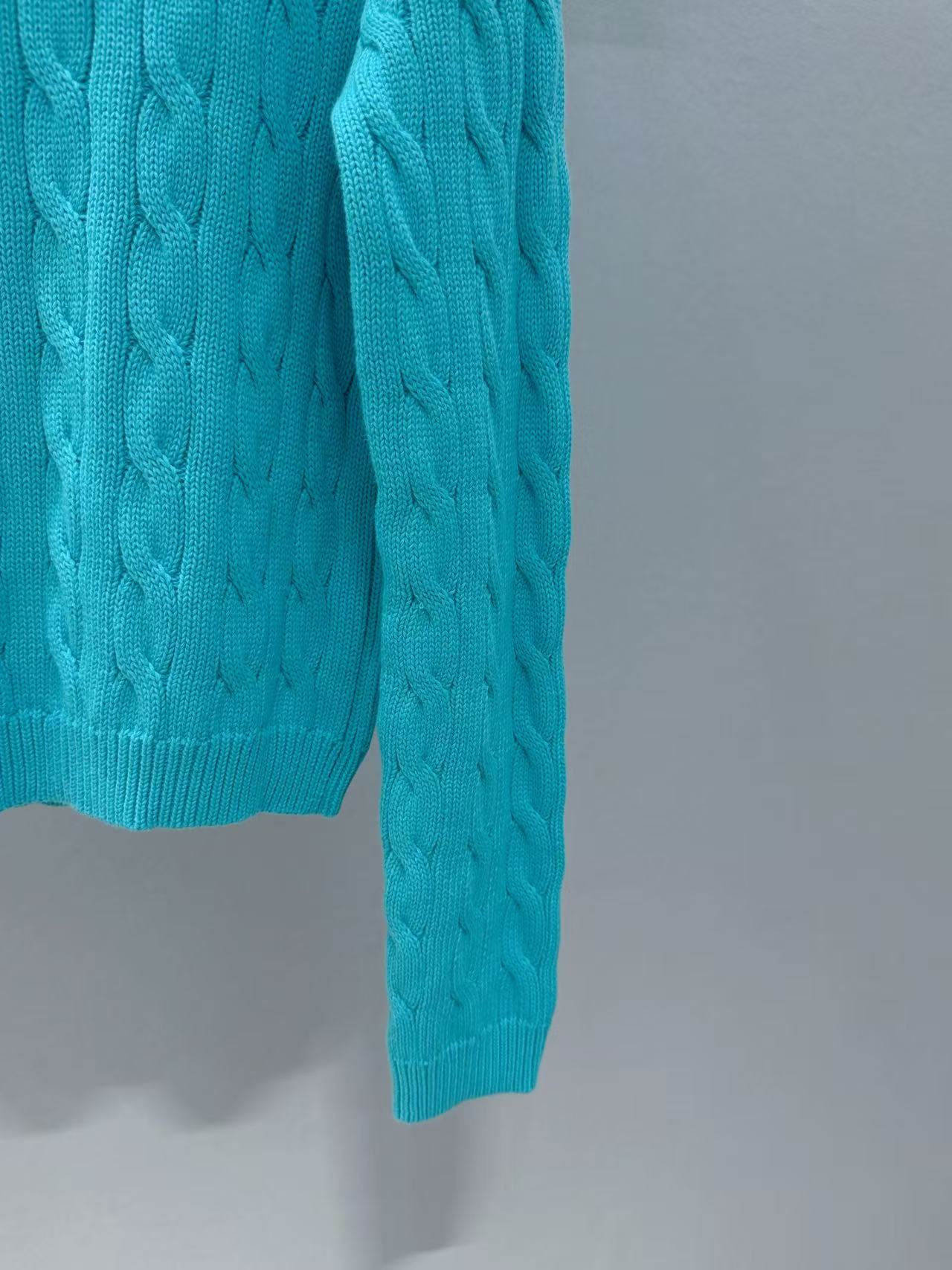 麻花紋理以精湛針織工藝呈現,立體感十足;胸前微標刺繡低調奢華,湖藍色調清新脫俗。