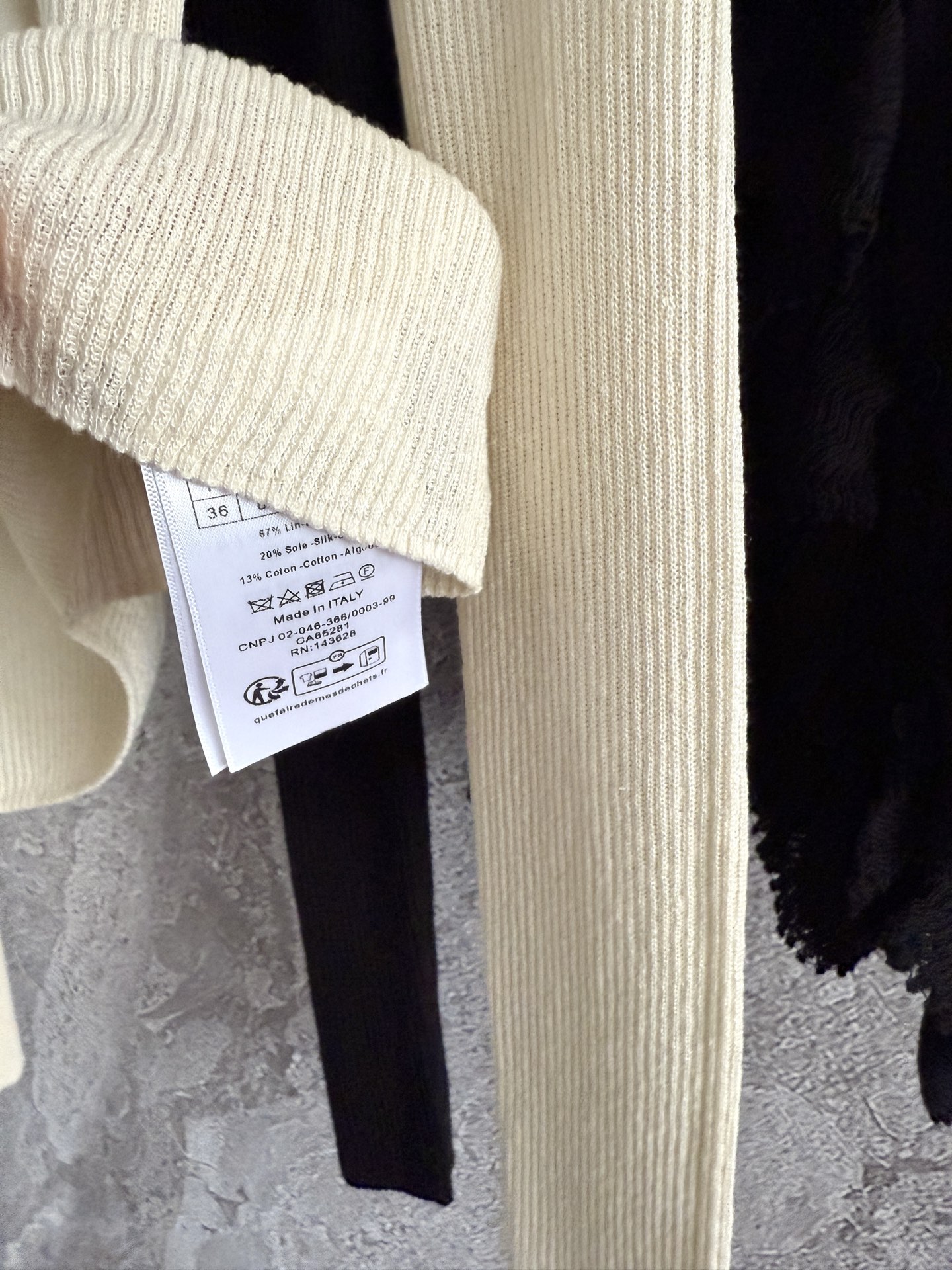 採用亞麻混紡螺紋針織材質,兼具針織的彈性與亞麻的清爽透氣特性。穿起來不悶熱,肌膚觸感細膩親膚,適合春夏或初秋單穿,也能在寒涼時節作為內搭。
