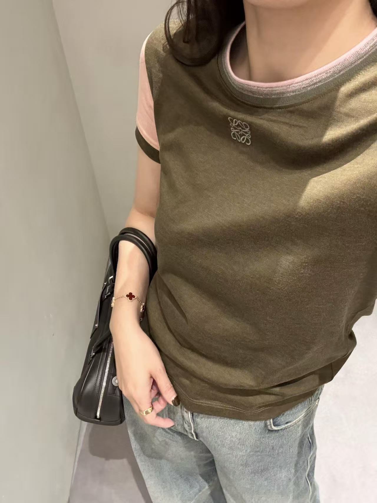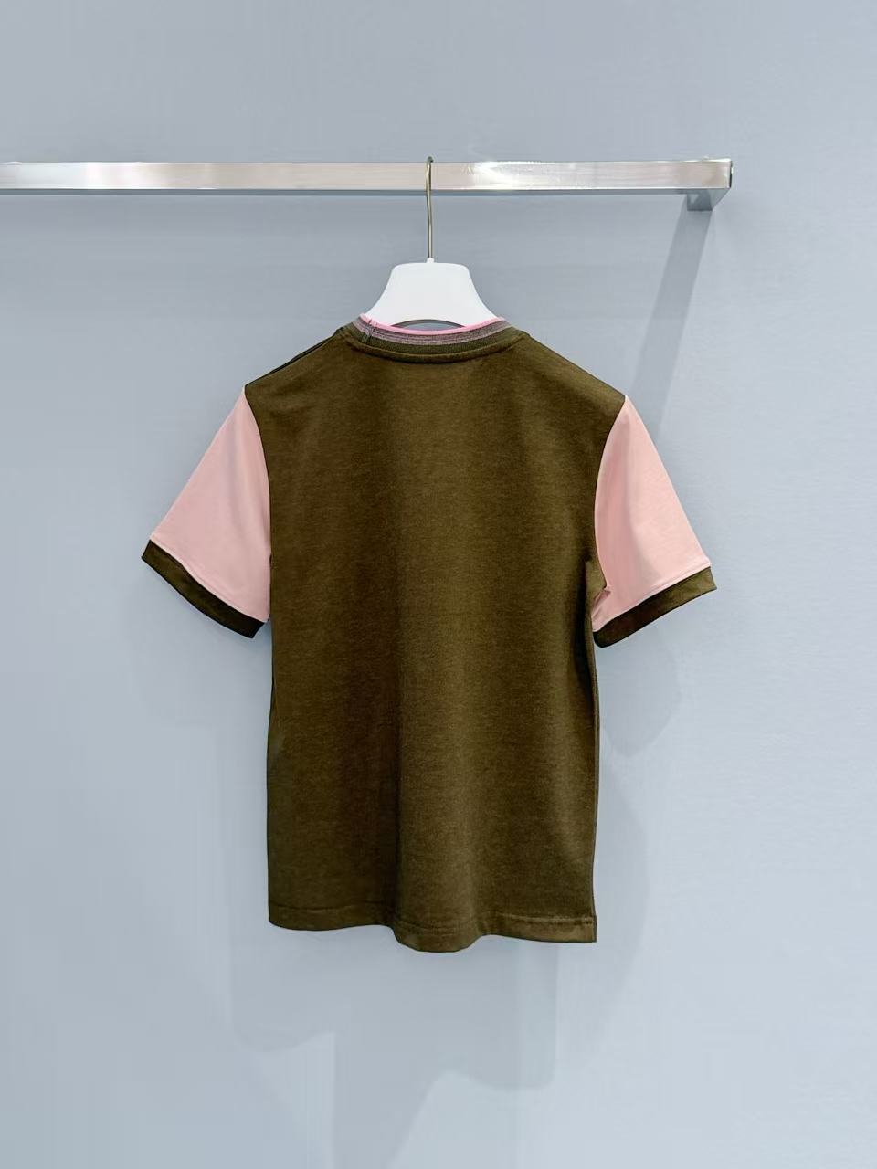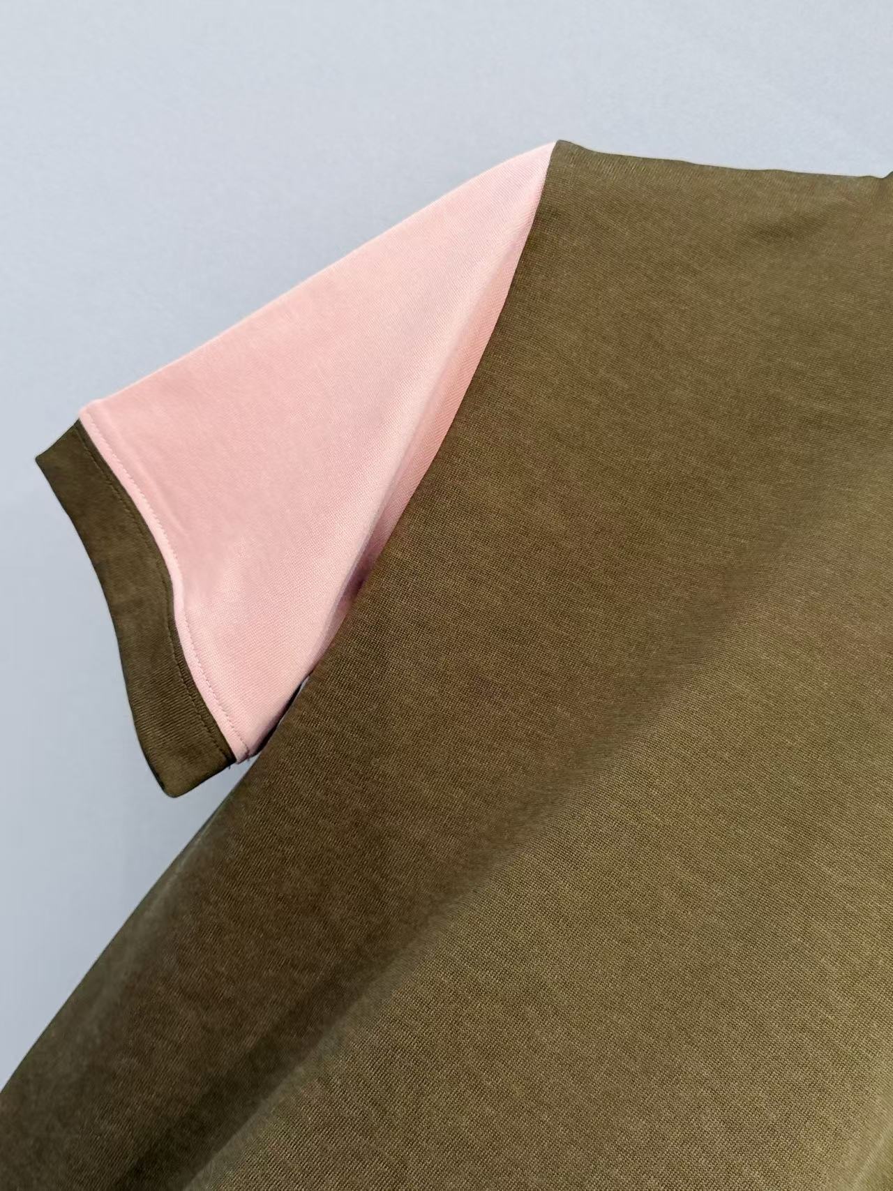 主體的卡其綠結合袖口的櫻花粉,打破了單色 T 恤的沉悶,讓整個人看起來既有質感又充滿活力的律動感。