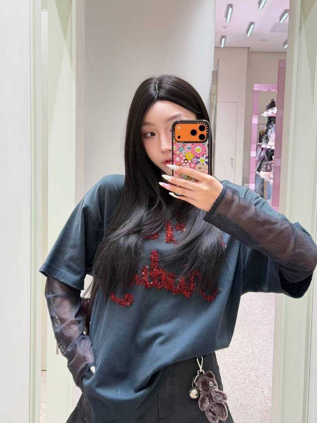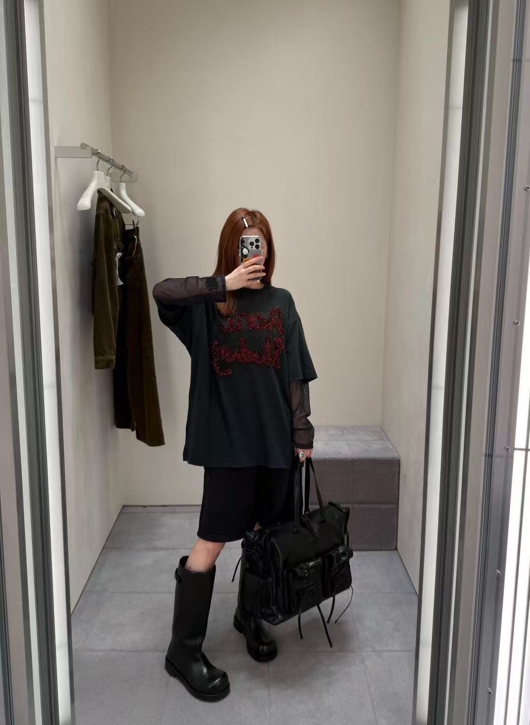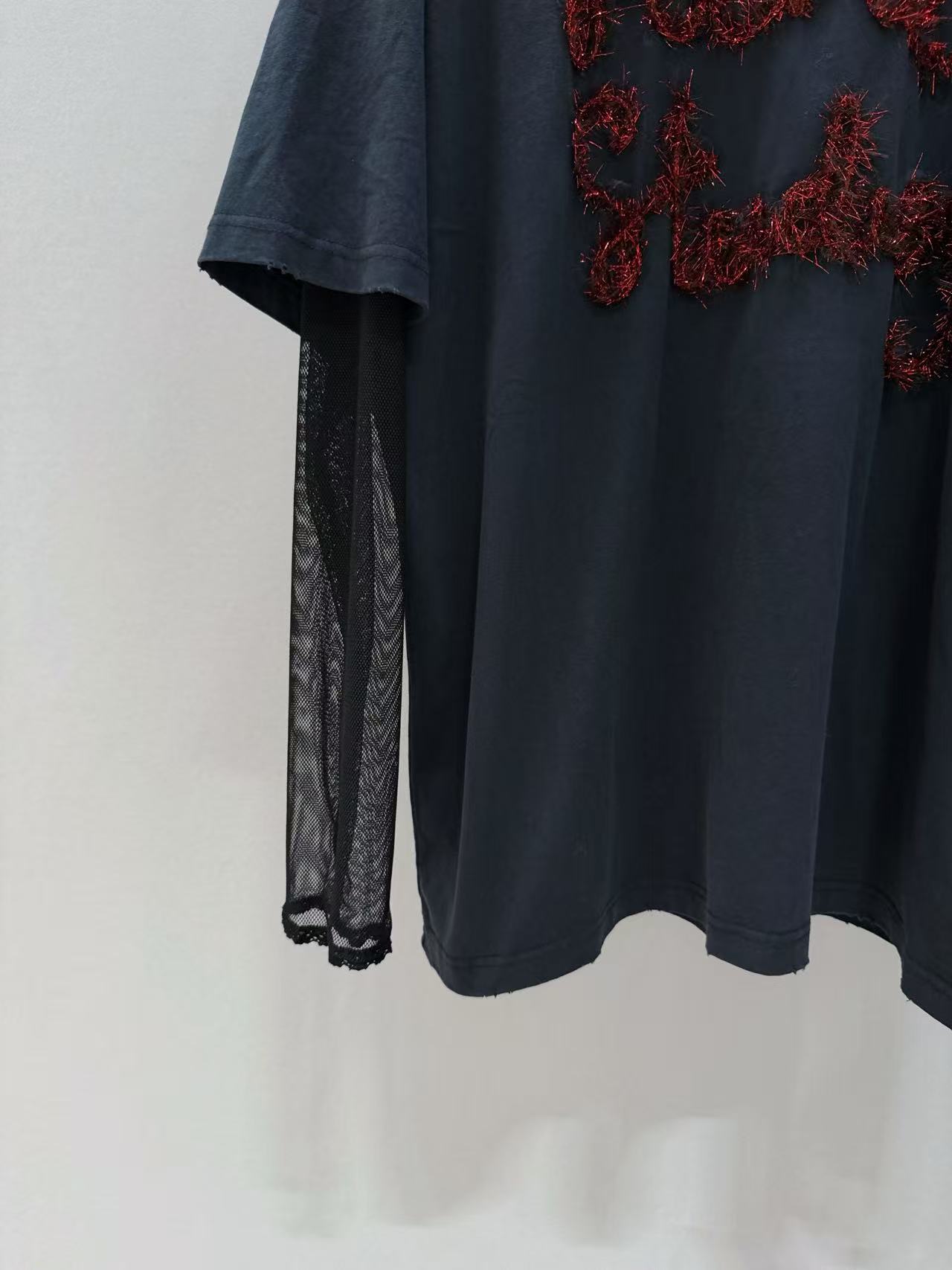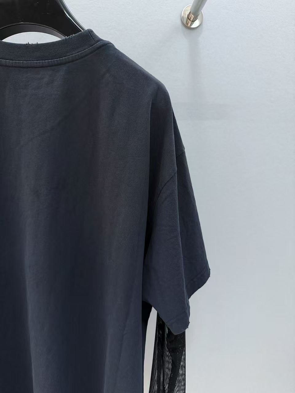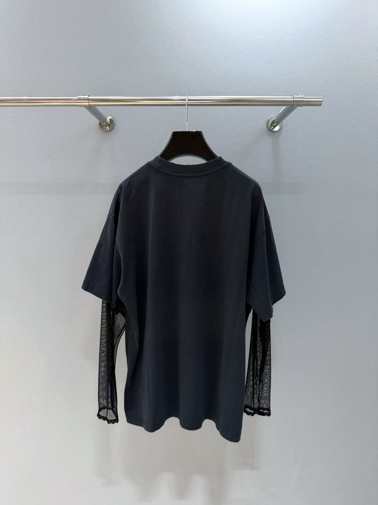 網紗袖疊穿設計 深灰色基礎袖身外覆半透視黑色網紗,打破單調的同時,創造出虛實交疊的摩登層次,提升整體造型質感。