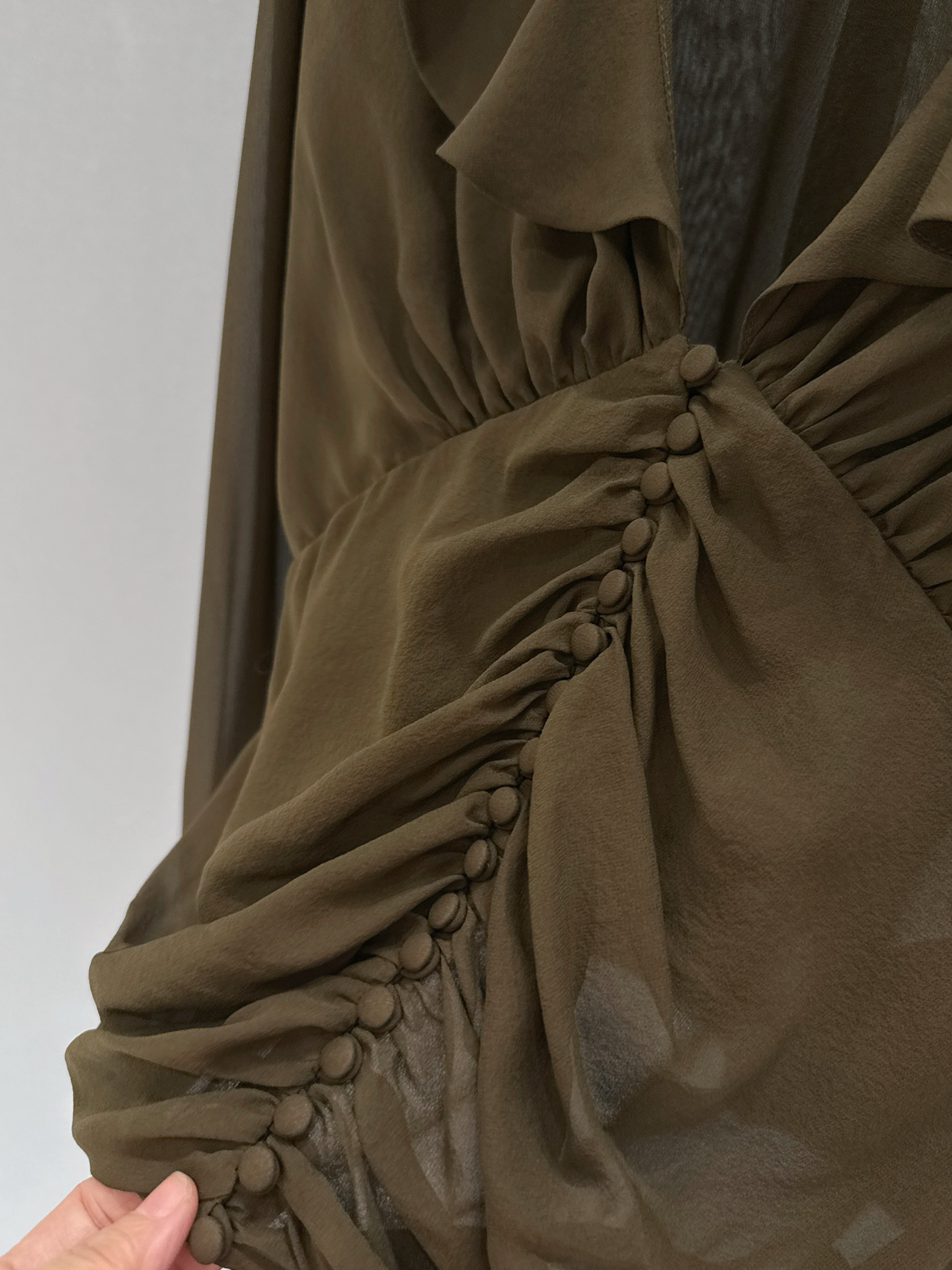 設計亮點:荷葉邊V領、排扣收腰、法式復古