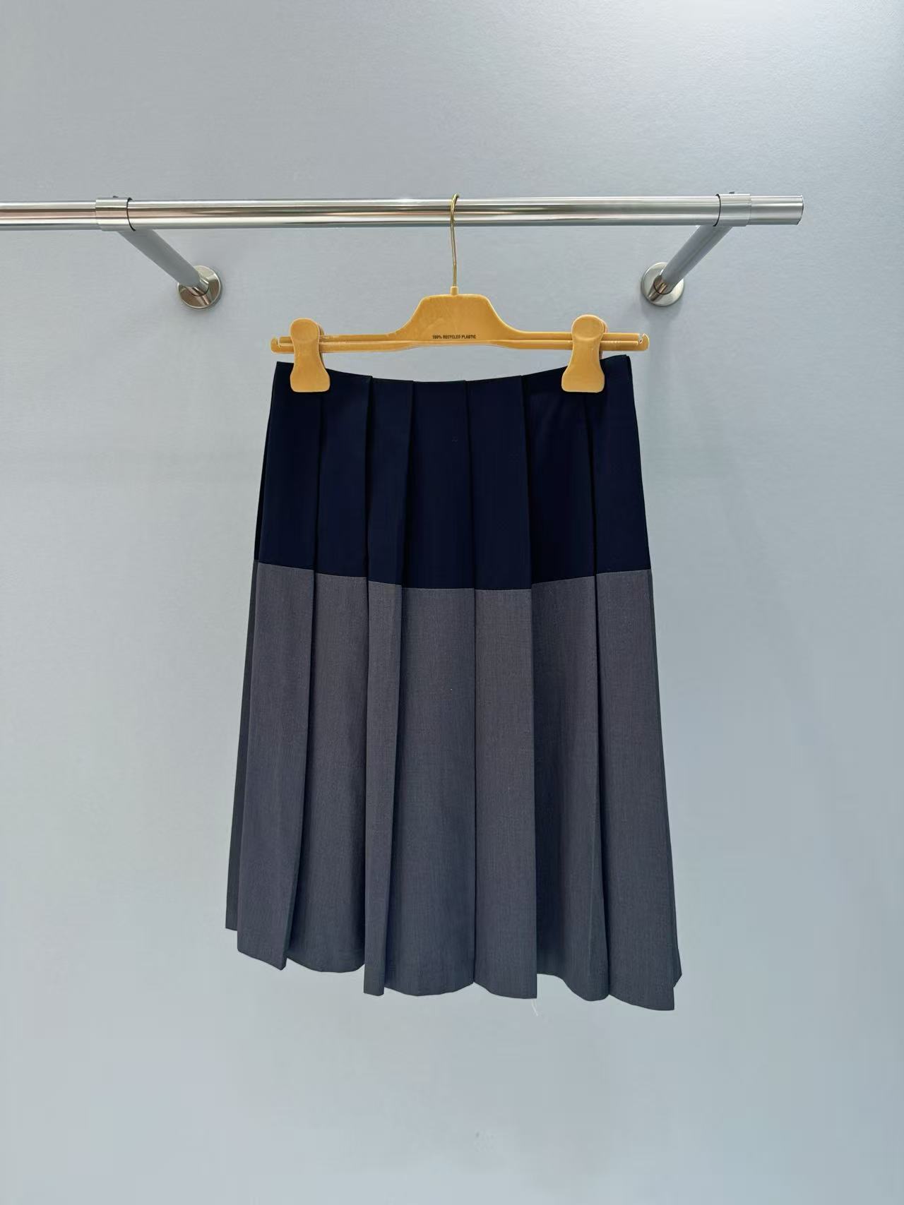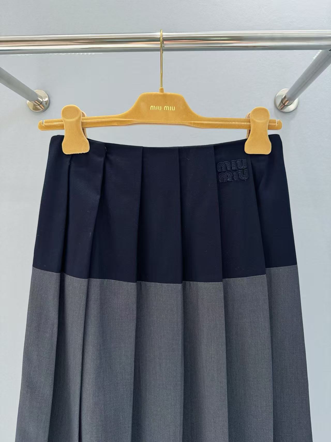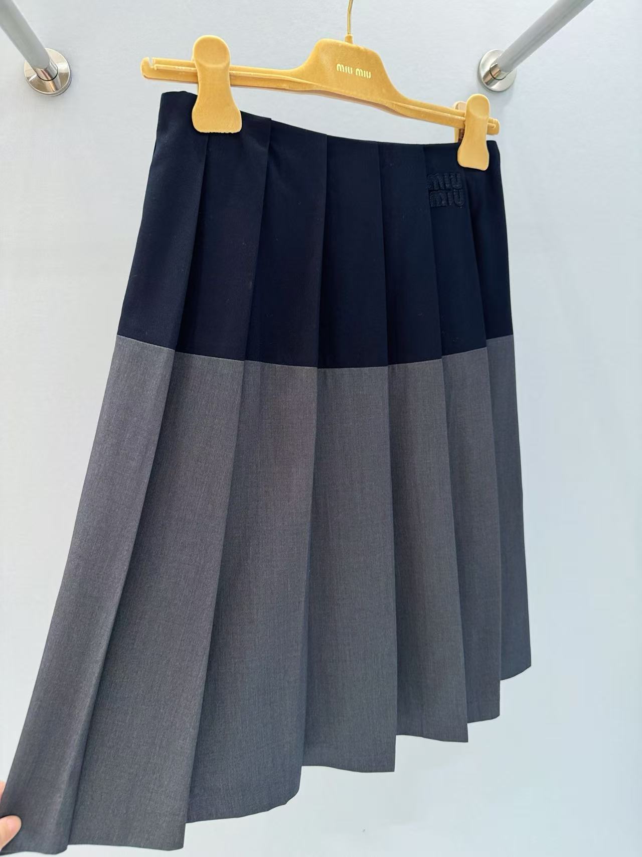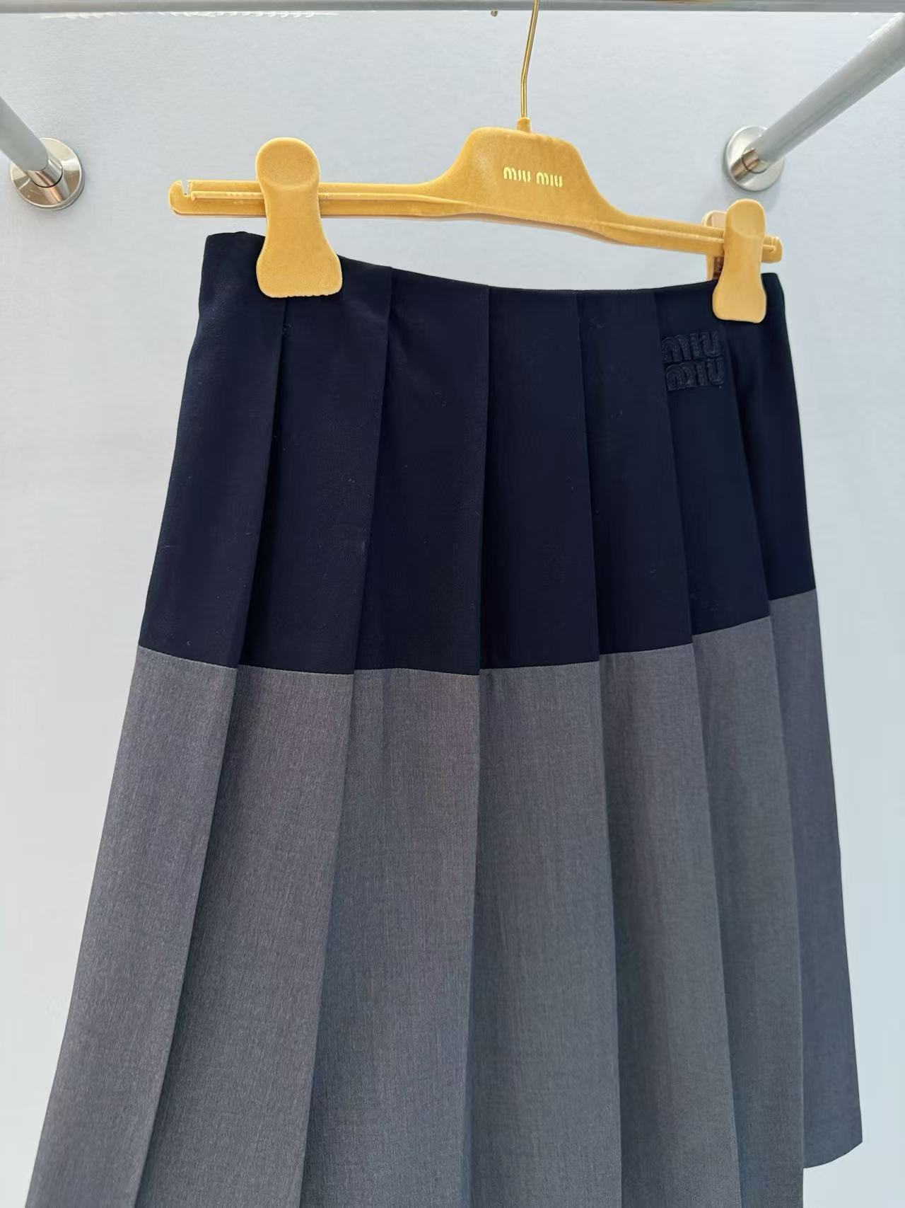 2025春夏 MIU家 深灰拼藍百褶短裙:英倫學院風的時尚必備!