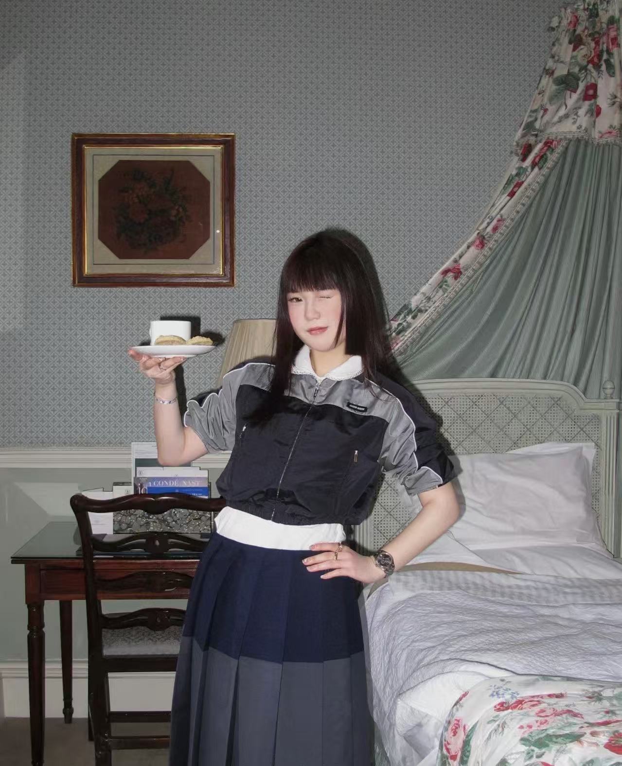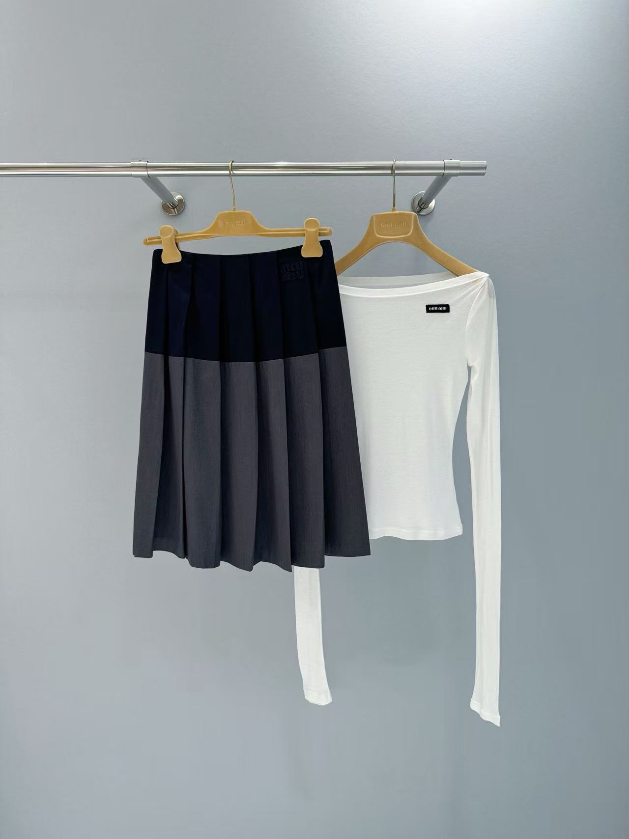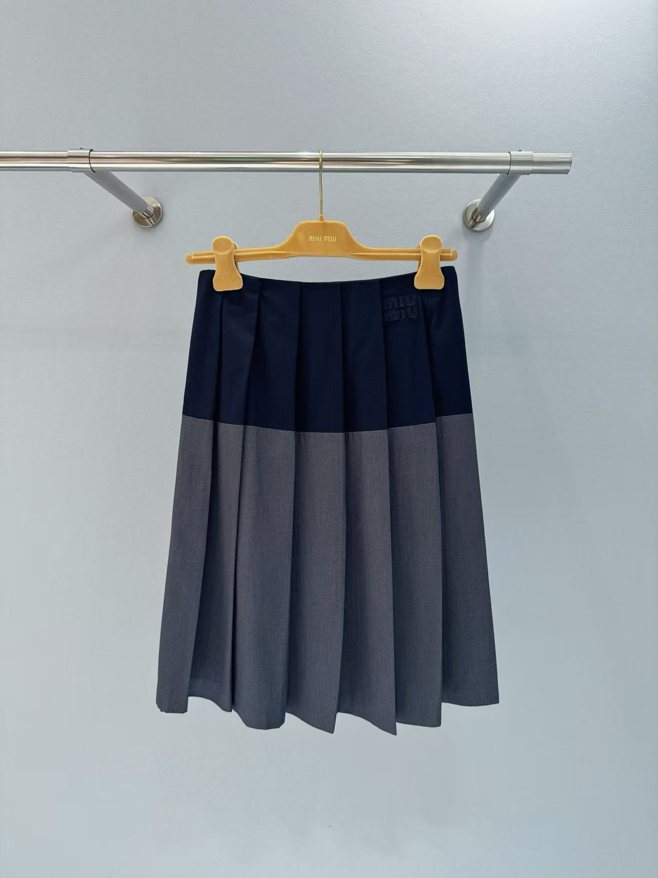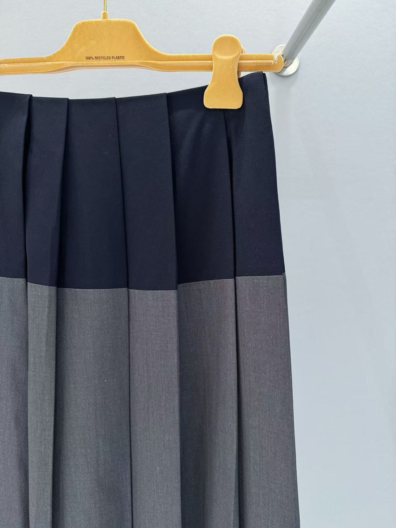 2025春夏 MIU家 深灰拼藍百褶短裙:英倫學院風的時尚必備!