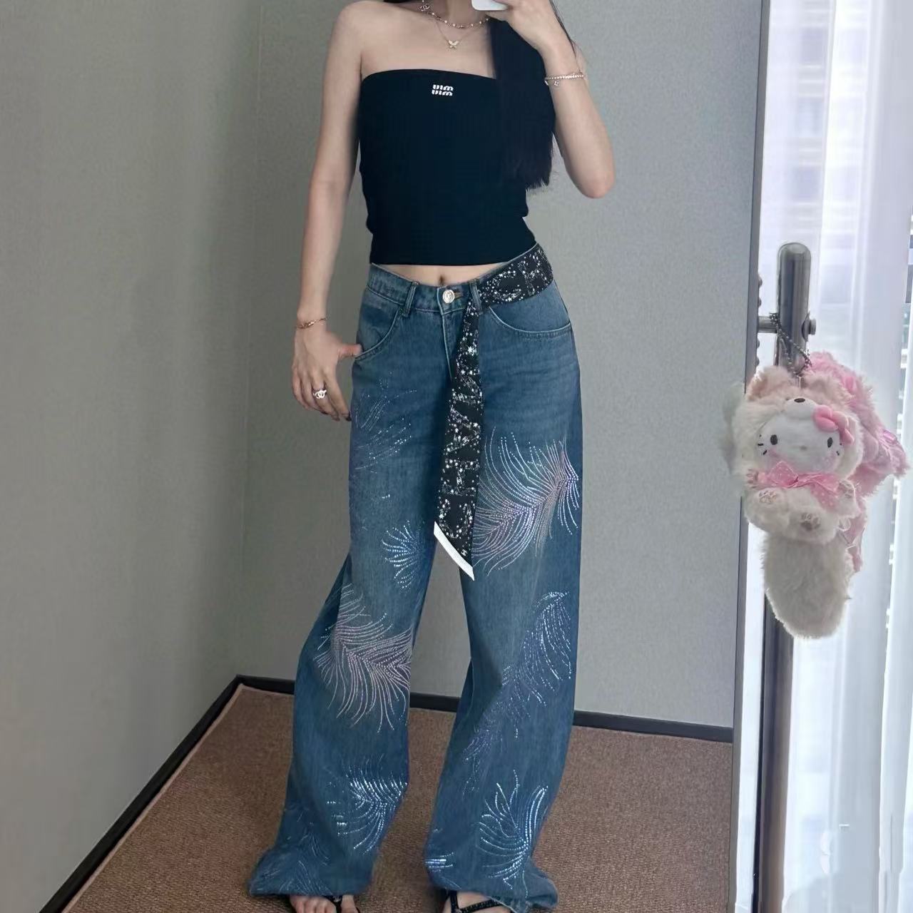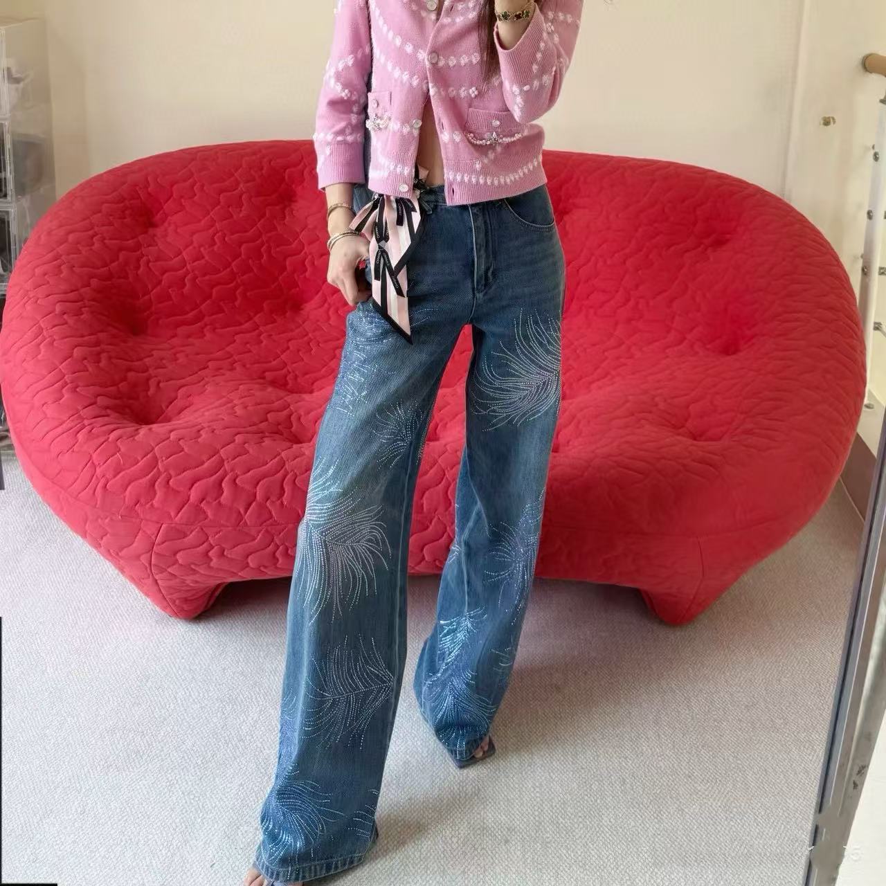 2025春夏新品 C家 羽毛燙鑽闊腿牛仔褲