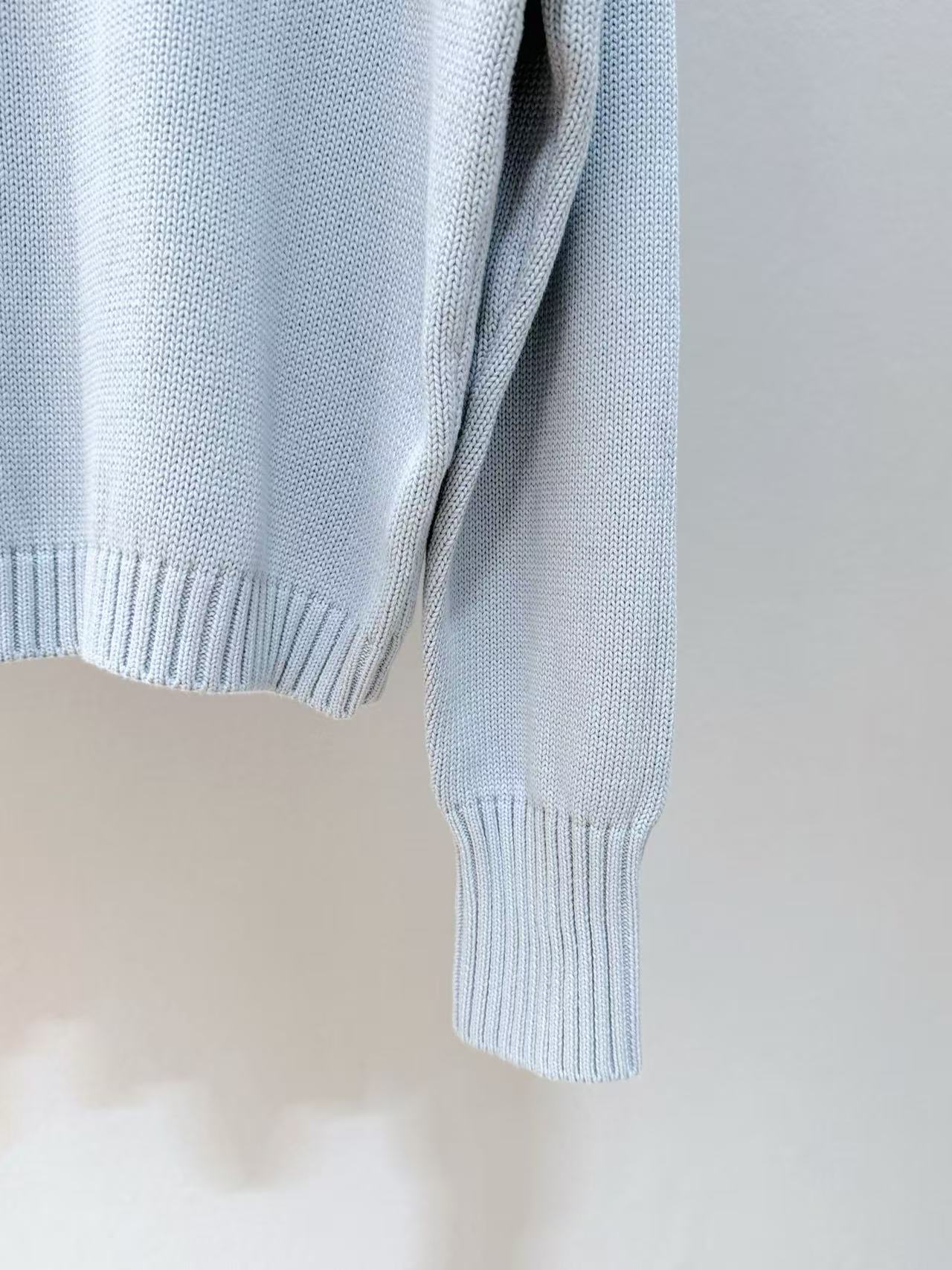 使用 100% 定染棉紗線,輕便柔軟,帶著自然呼吸感,不像挺硬毛衣會顯壯。手感舒適、透氣度佳,上身既有輕盈感又保有版型立體感。