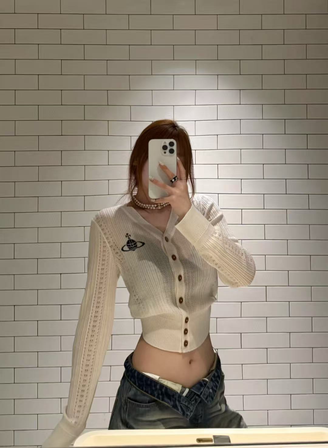 整件以標誌性土星徽標提花圖案點綴,獨特又不張揚,V 領開衫版型更能完美修飾脖頸線條,顯瘦效果滿分,