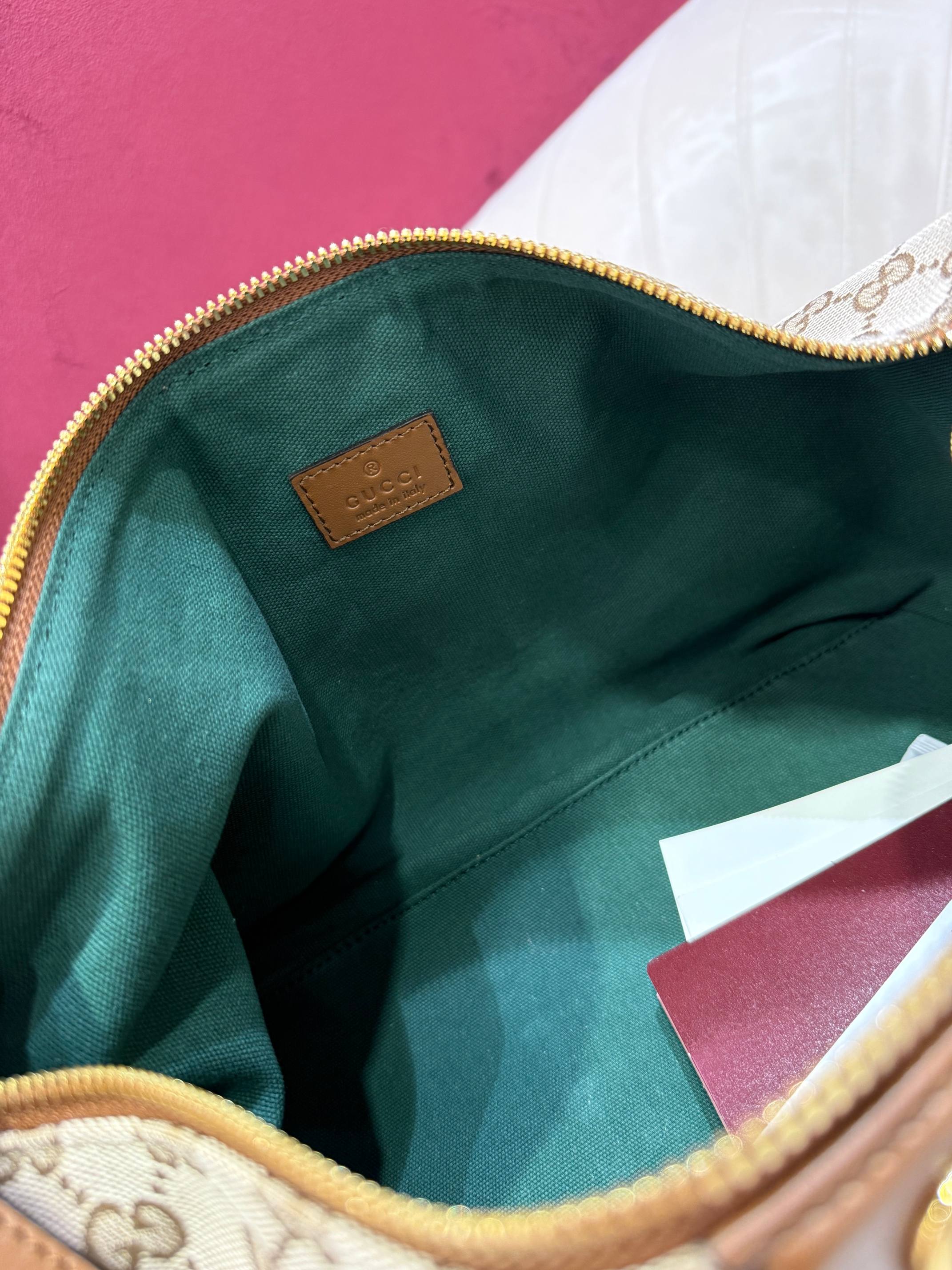包身採用米色與棕色 GG 帆布,搭配棕色皮革滾邊,耐看又耐用。