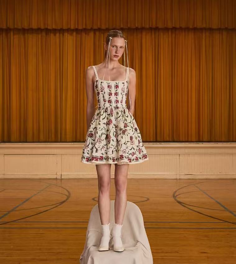 工藝釘珠與印花: 肩膀處手工感十足的釘珠細節,搭配品牌標誌性的 Granadilla 花卉印花,呈現出極具辨識度的早春視覺。