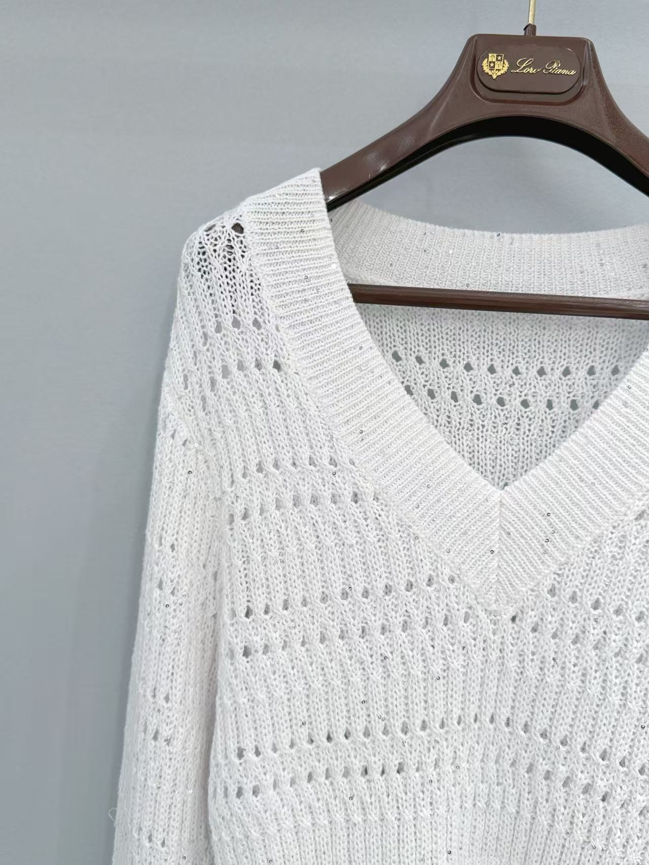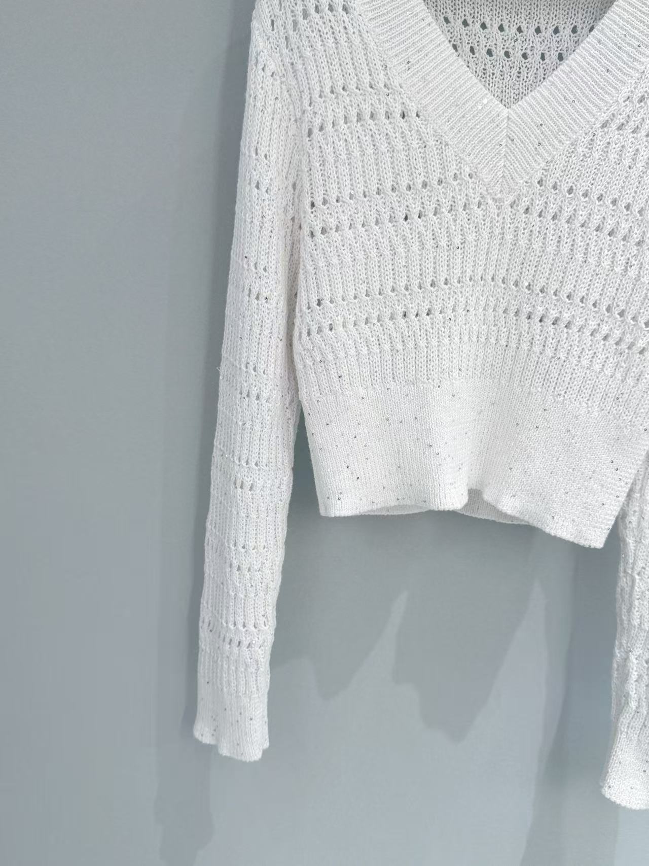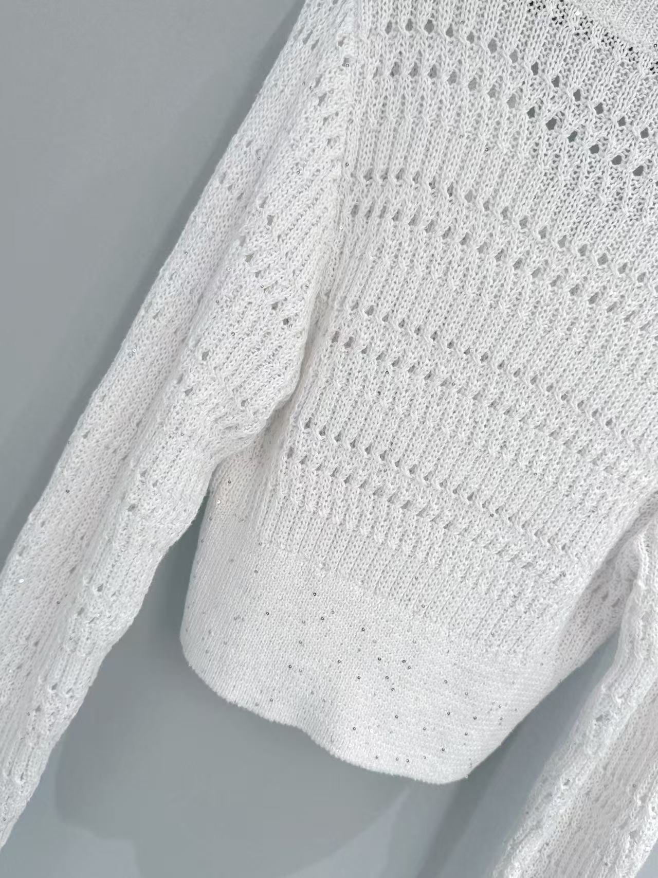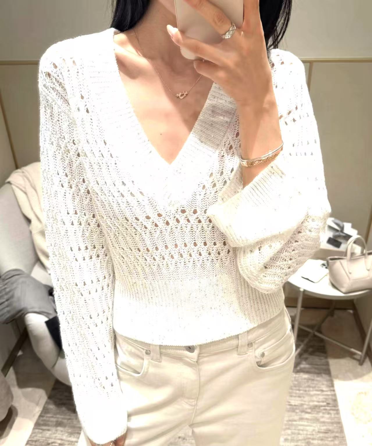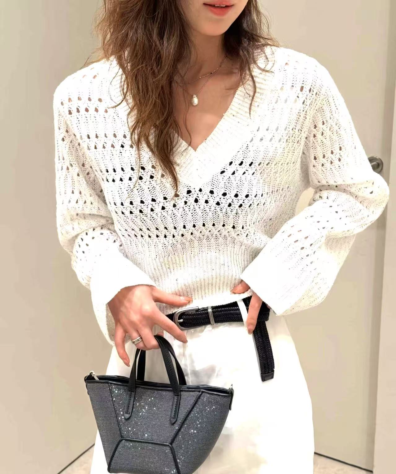 經典的 V 領剪裁,是修飾頸部線條與臉型的神隊友,視覺上瞬間顯瘦。鏤空織法不僅增加了視覺上的通透感,更讓整件毛衣顯得輕盈且充滿呼吸感。