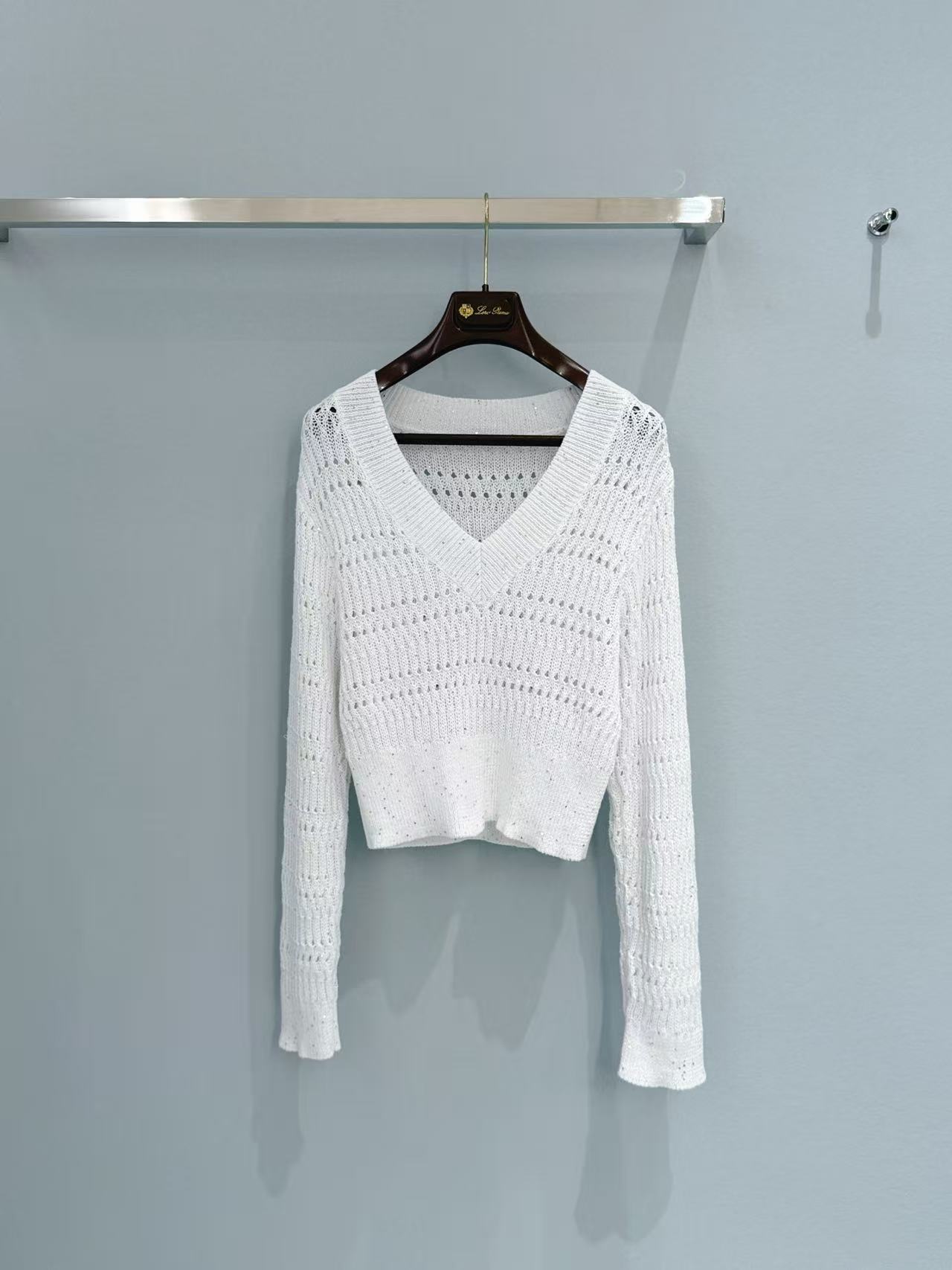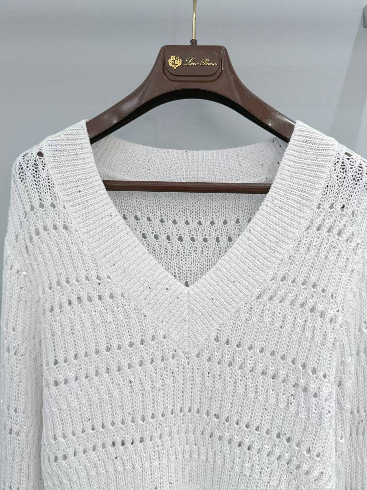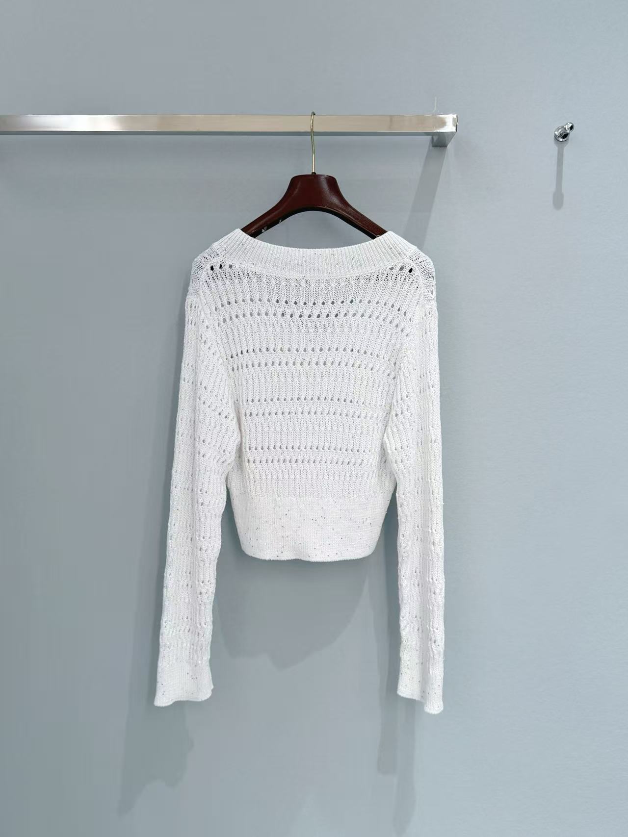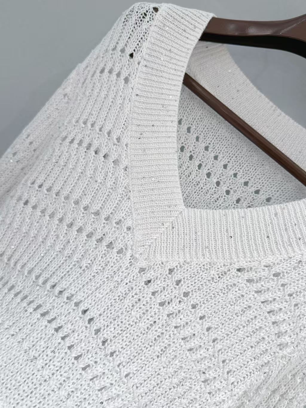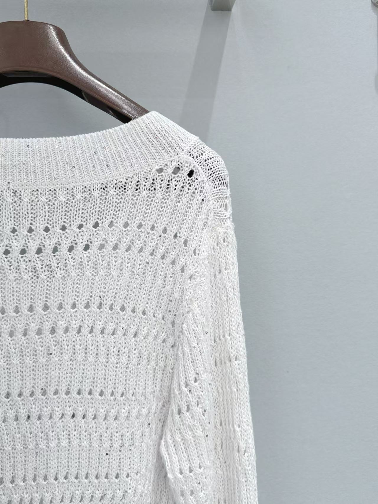 經典的 V 領剪裁,是修飾頸部線條與臉型的神隊友,視覺上瞬間顯瘦。鏤空織法不僅增加了視覺上的通透感,更讓整件毛衣顯得輕盈且充滿呼吸感。