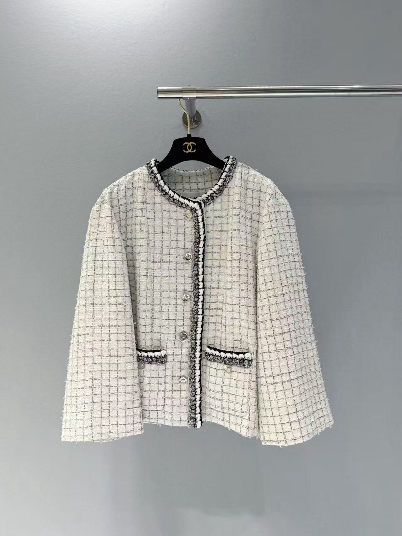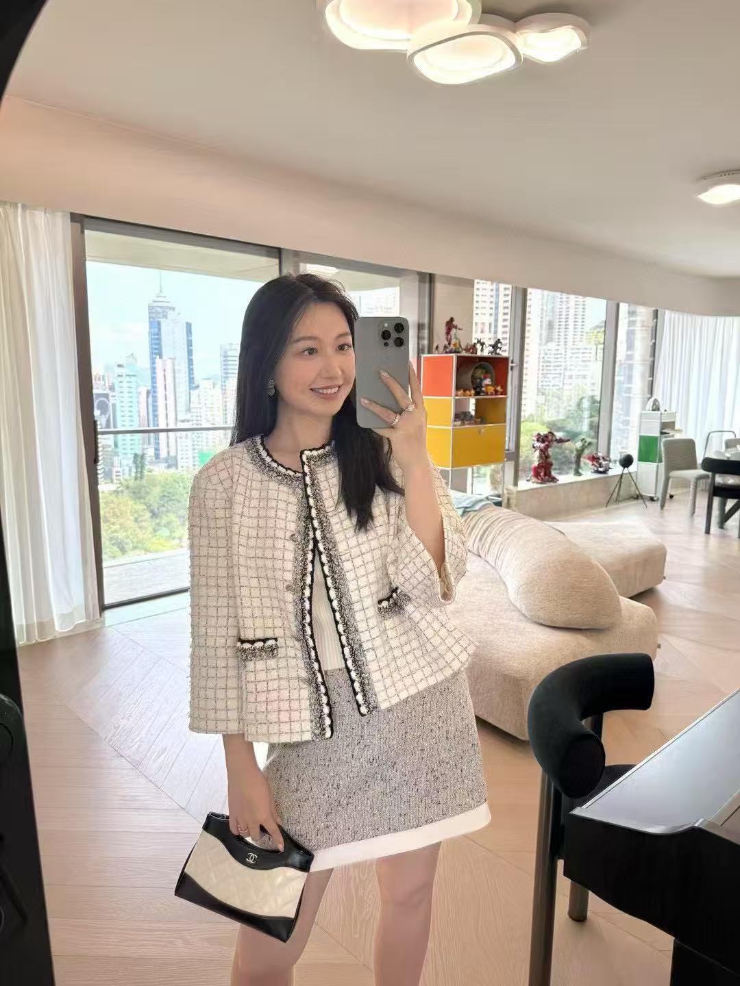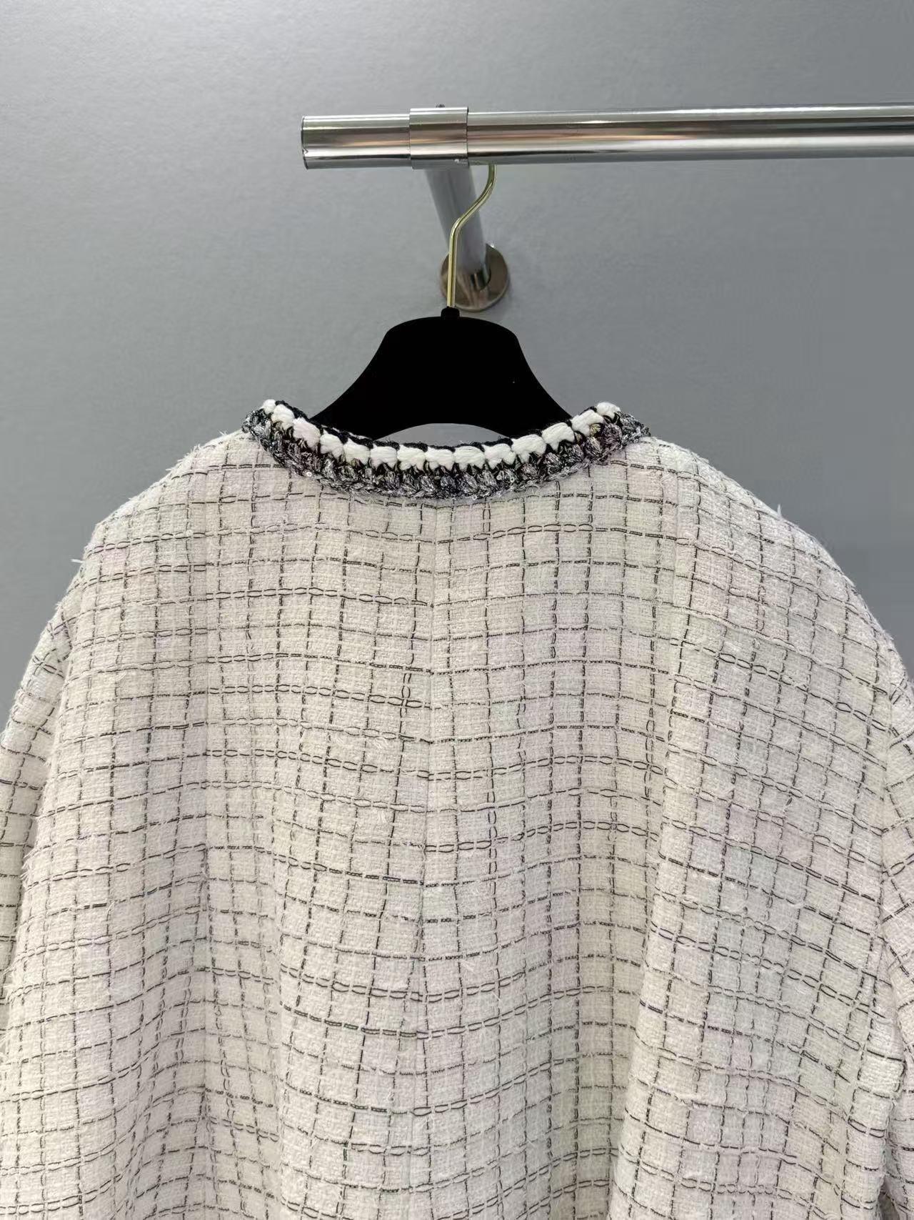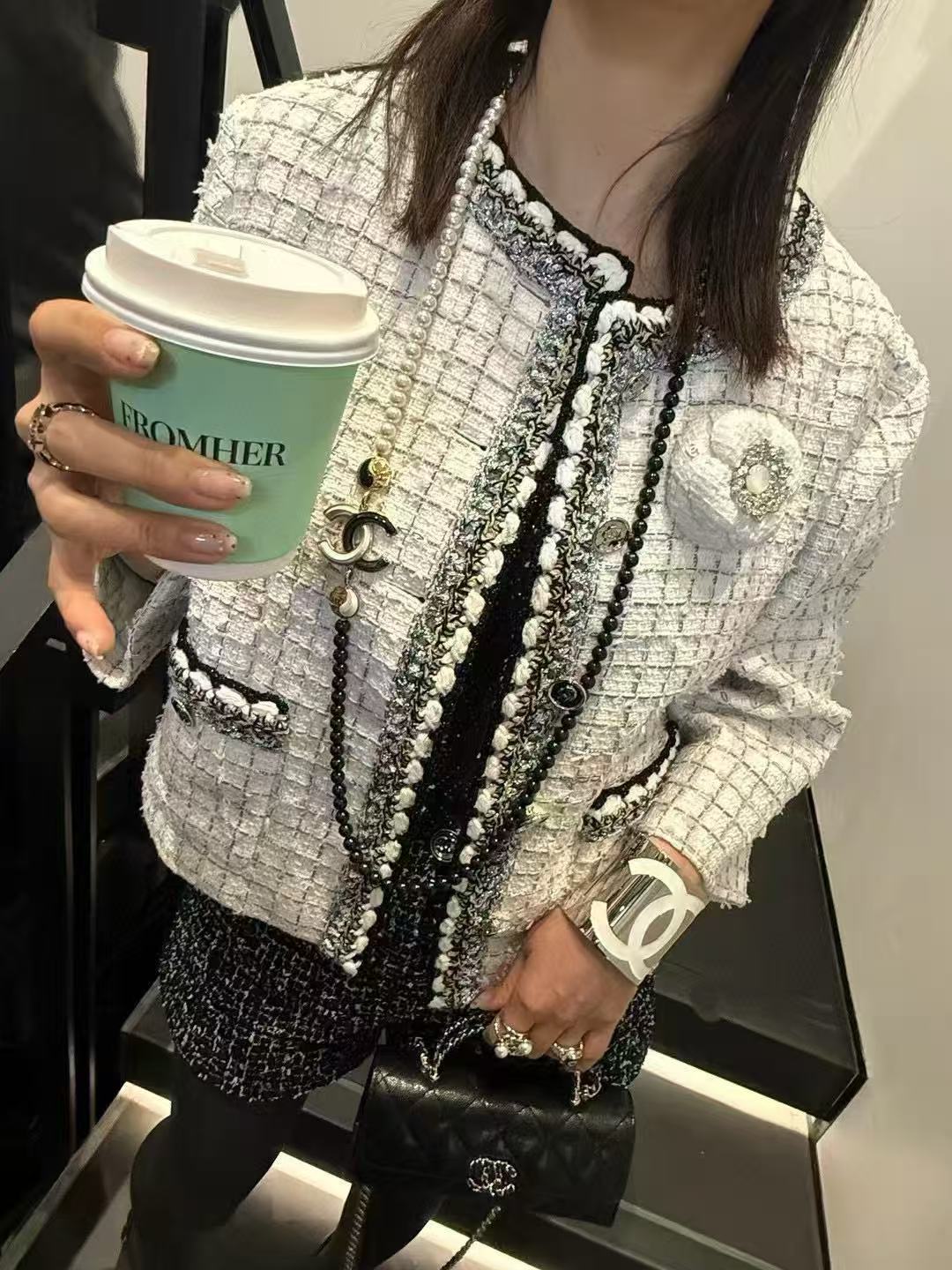 對稱式口袋加上深色波浪狀捆邊,層次感瞬間拉滿;胸前點綴重工製作的雙C襟扣,細節裡就藏著滿滿的高級感。