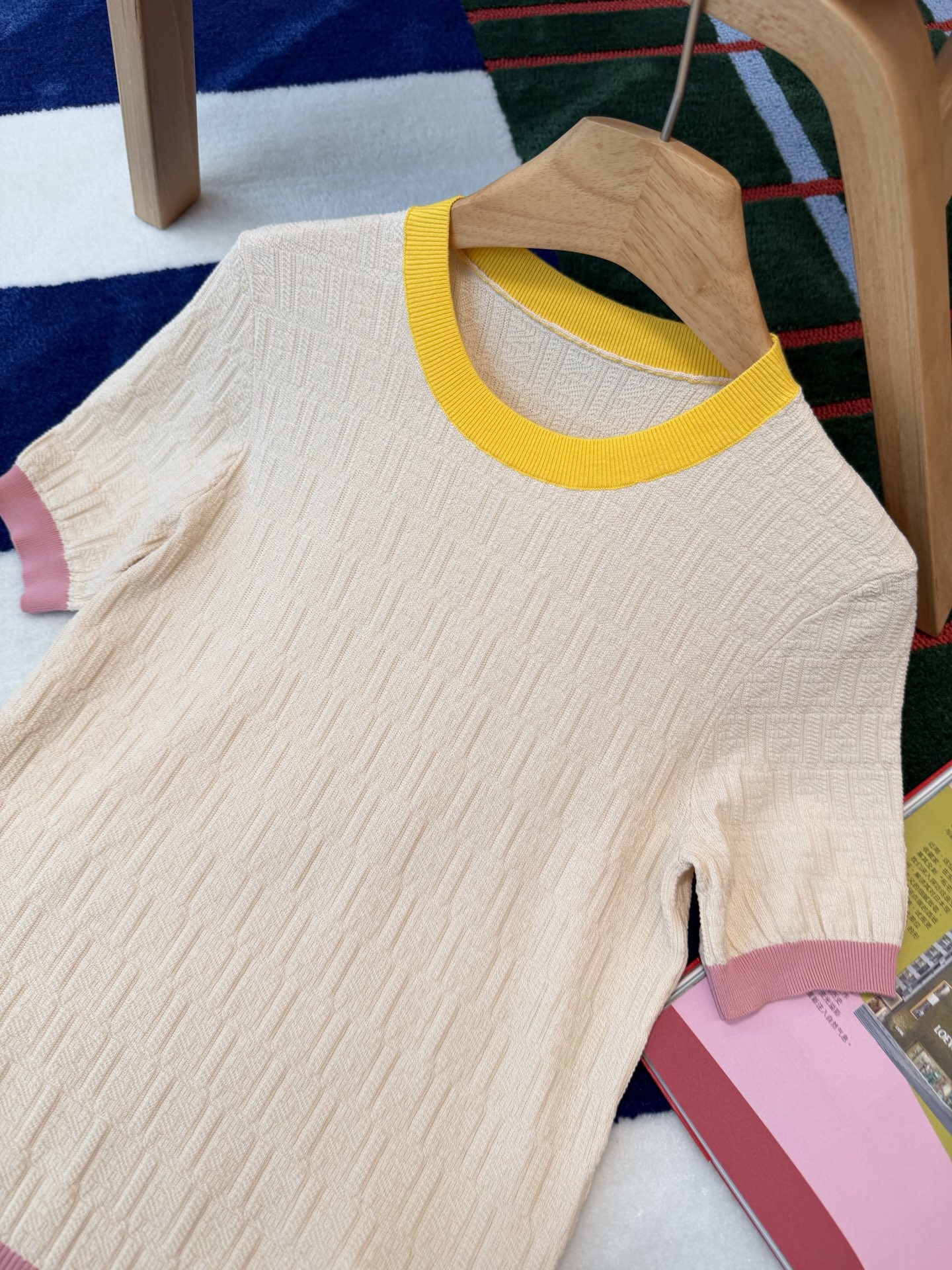 這件屬於那種「看似簡單,但穿上會默默被稱讚」的類型。整體設計走極簡路線,卻透過細膩的撞色搭配,讓視覺更有層次感,輕鬆穿出溫柔又帶點高級的氛圍。