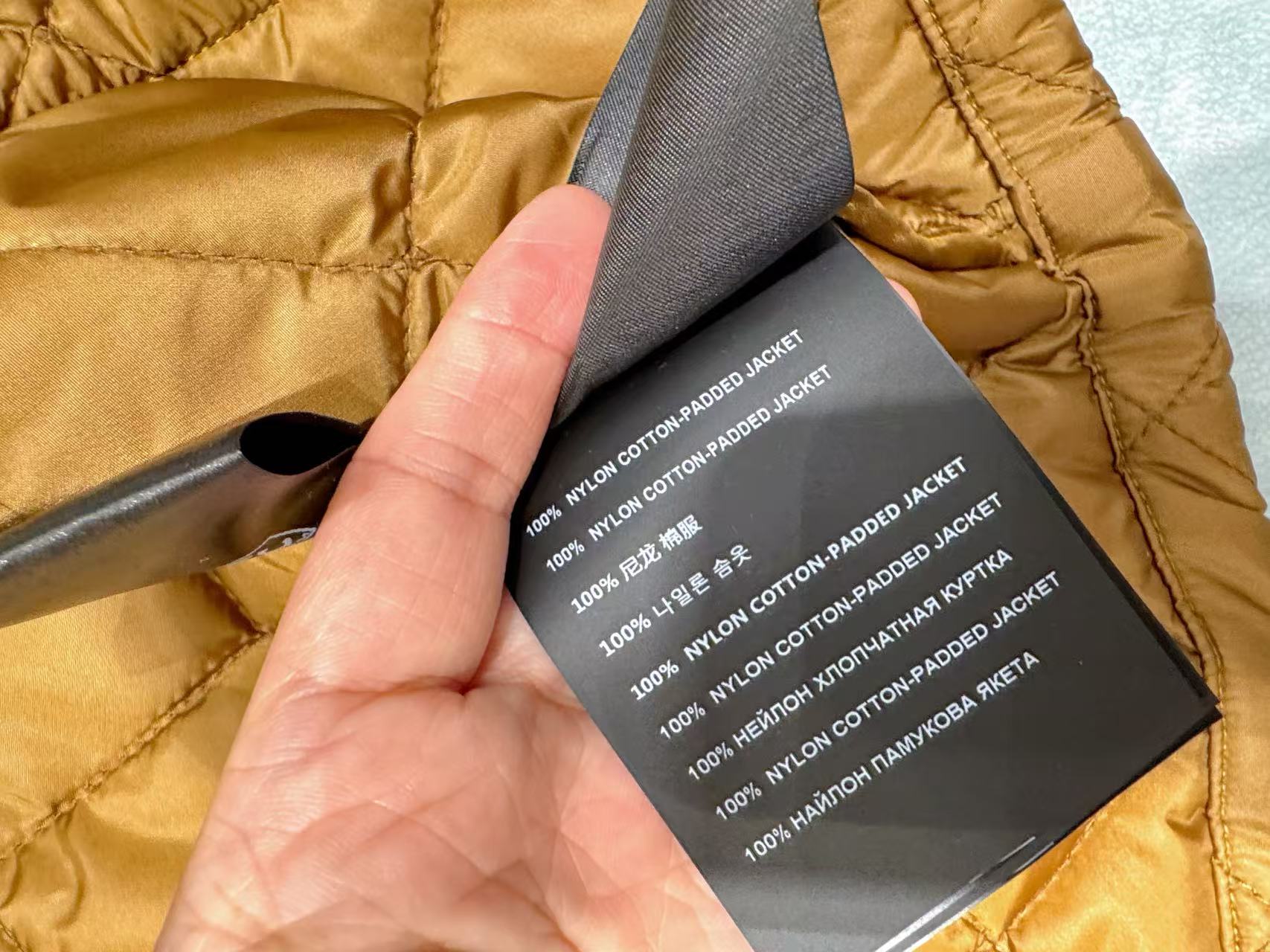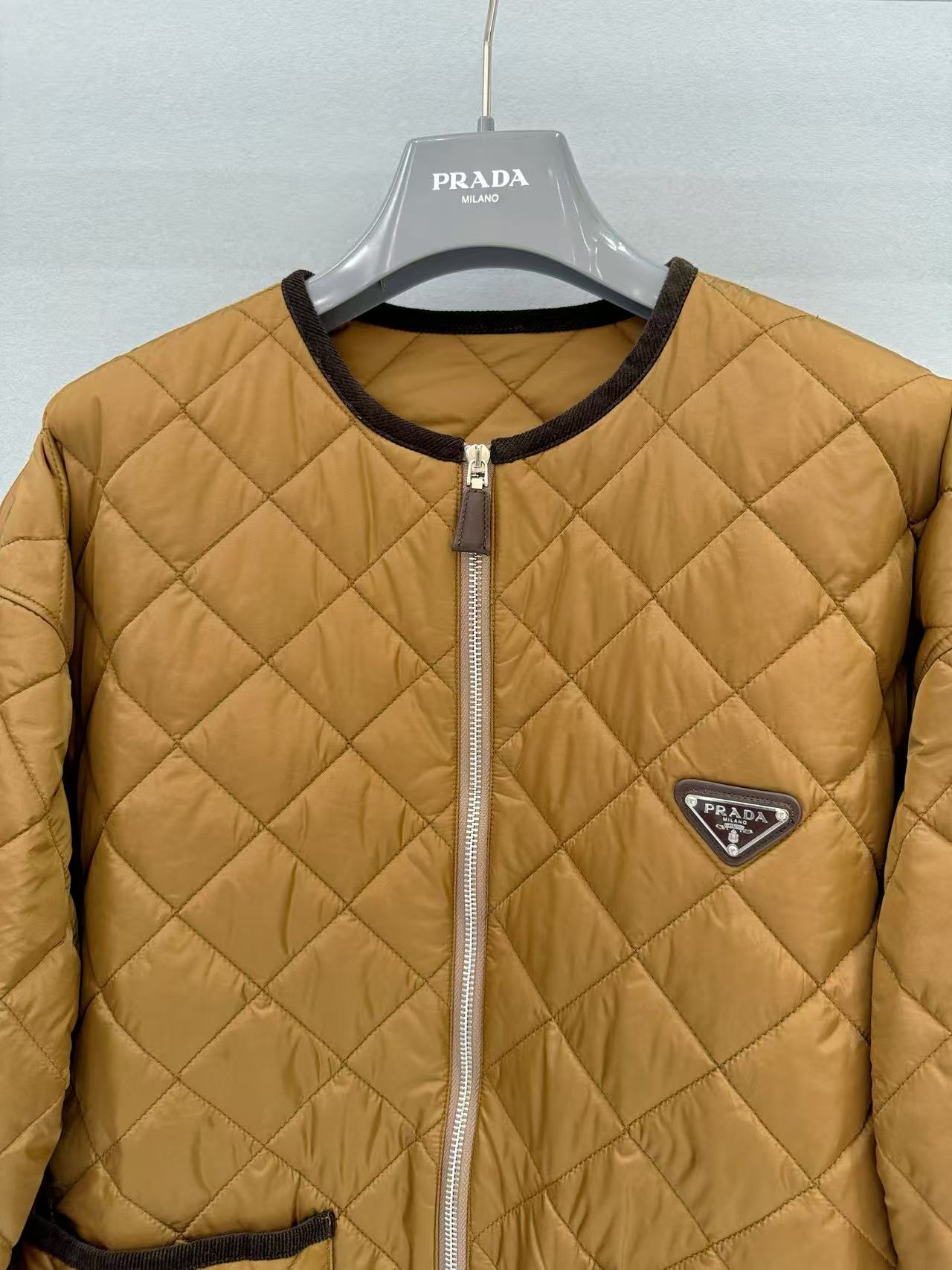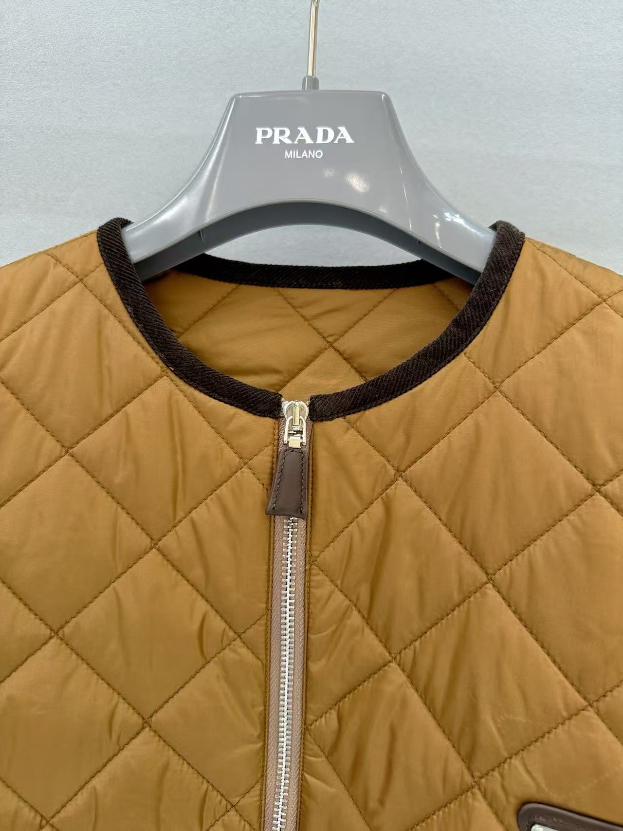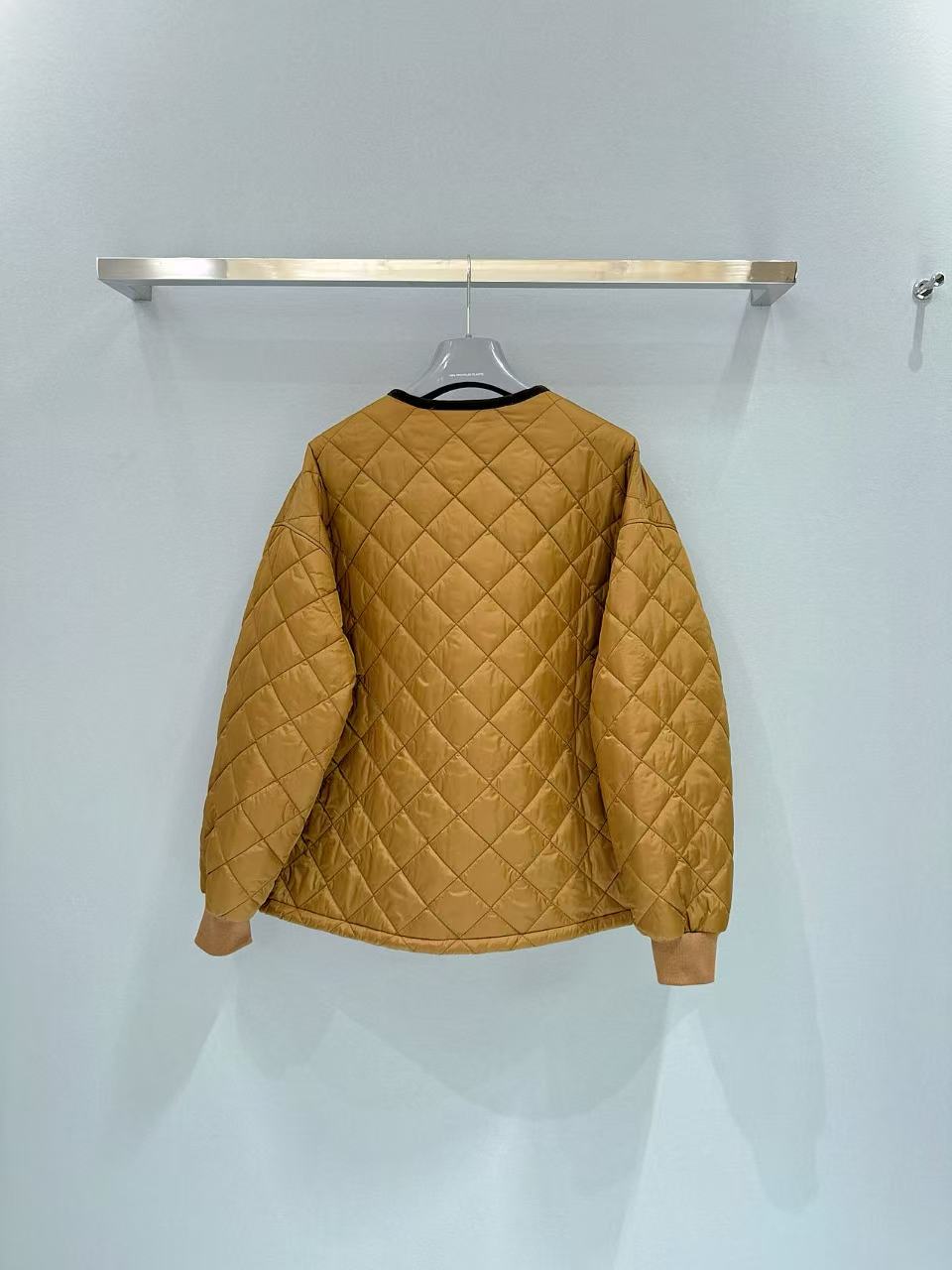 這件圓領棉服外套乍看簡約,但細節非常有誠意。焦糖色的菱形車縫設計帶出復古質感,經典雙口袋與三角標作為點綴,整體看起來既耐看又有辨識度。