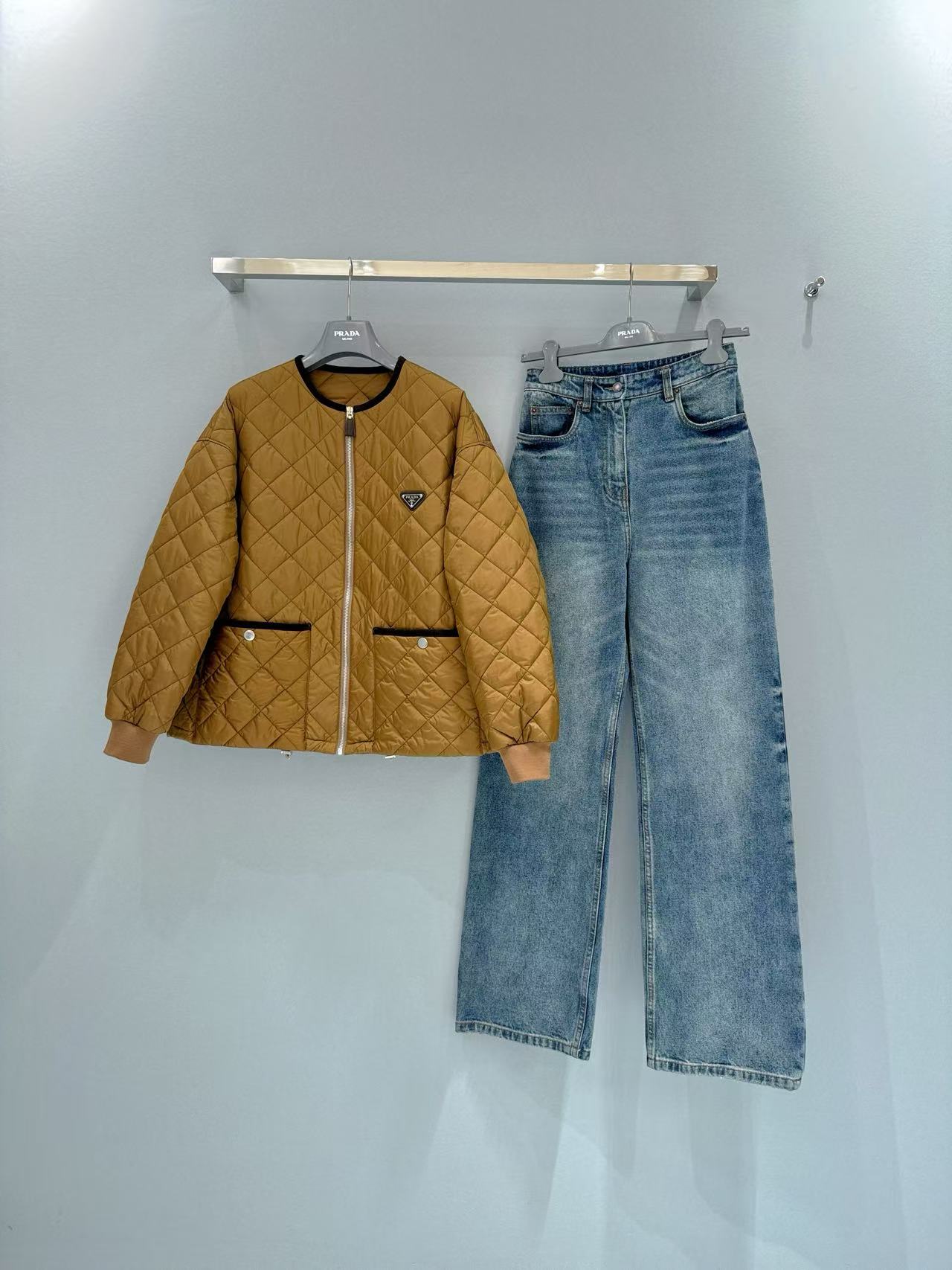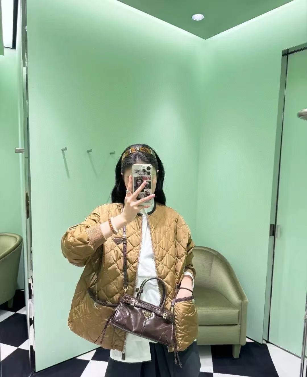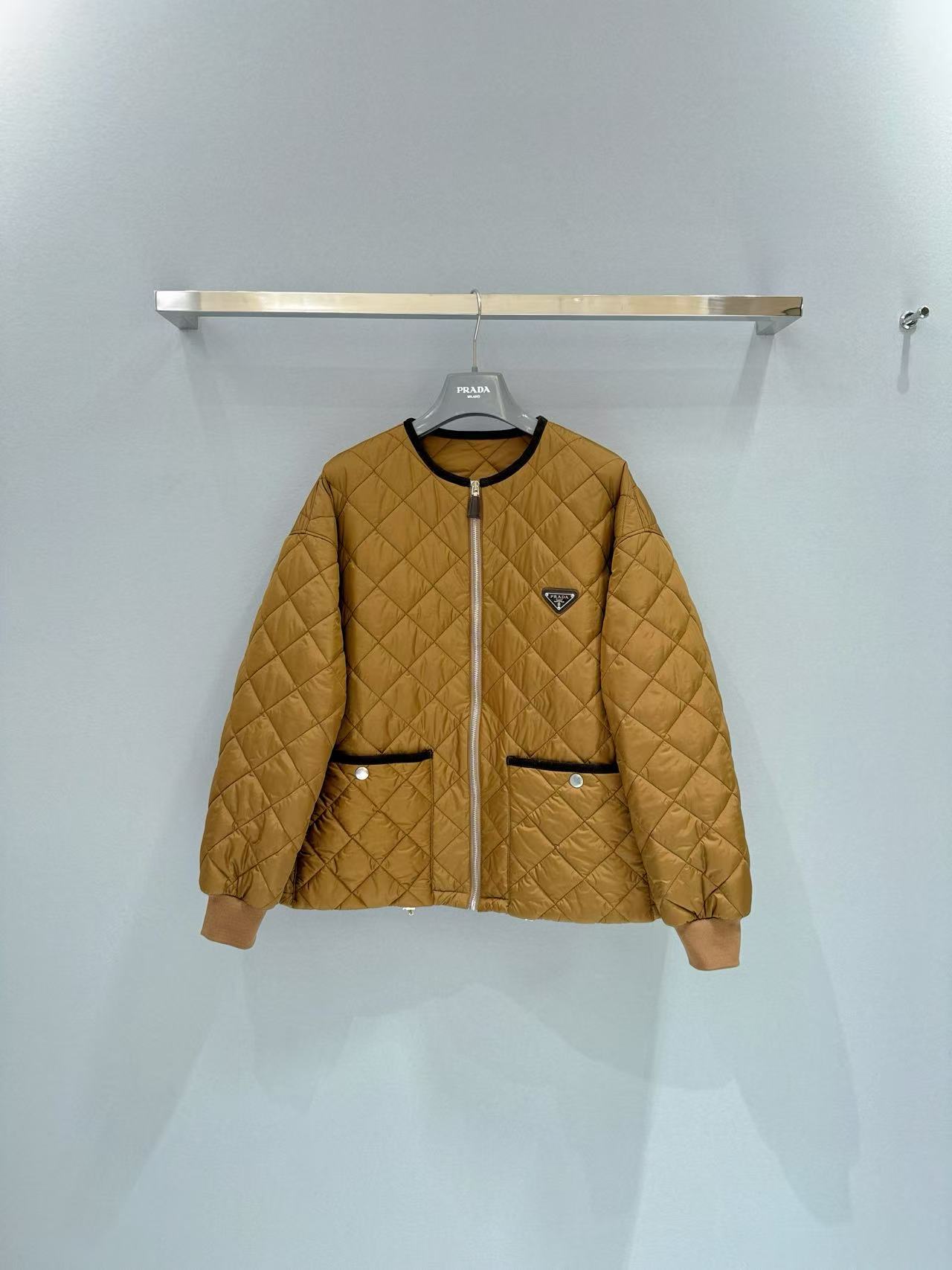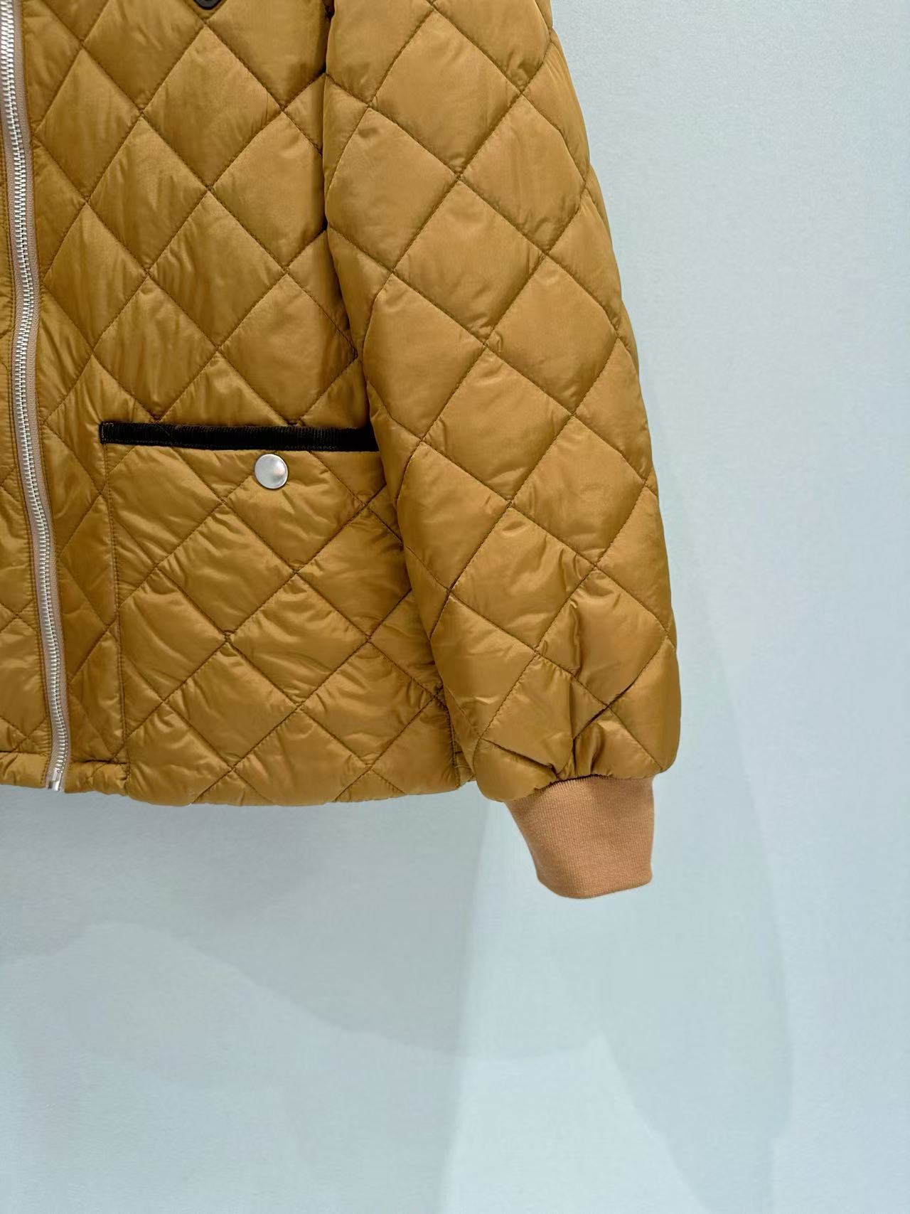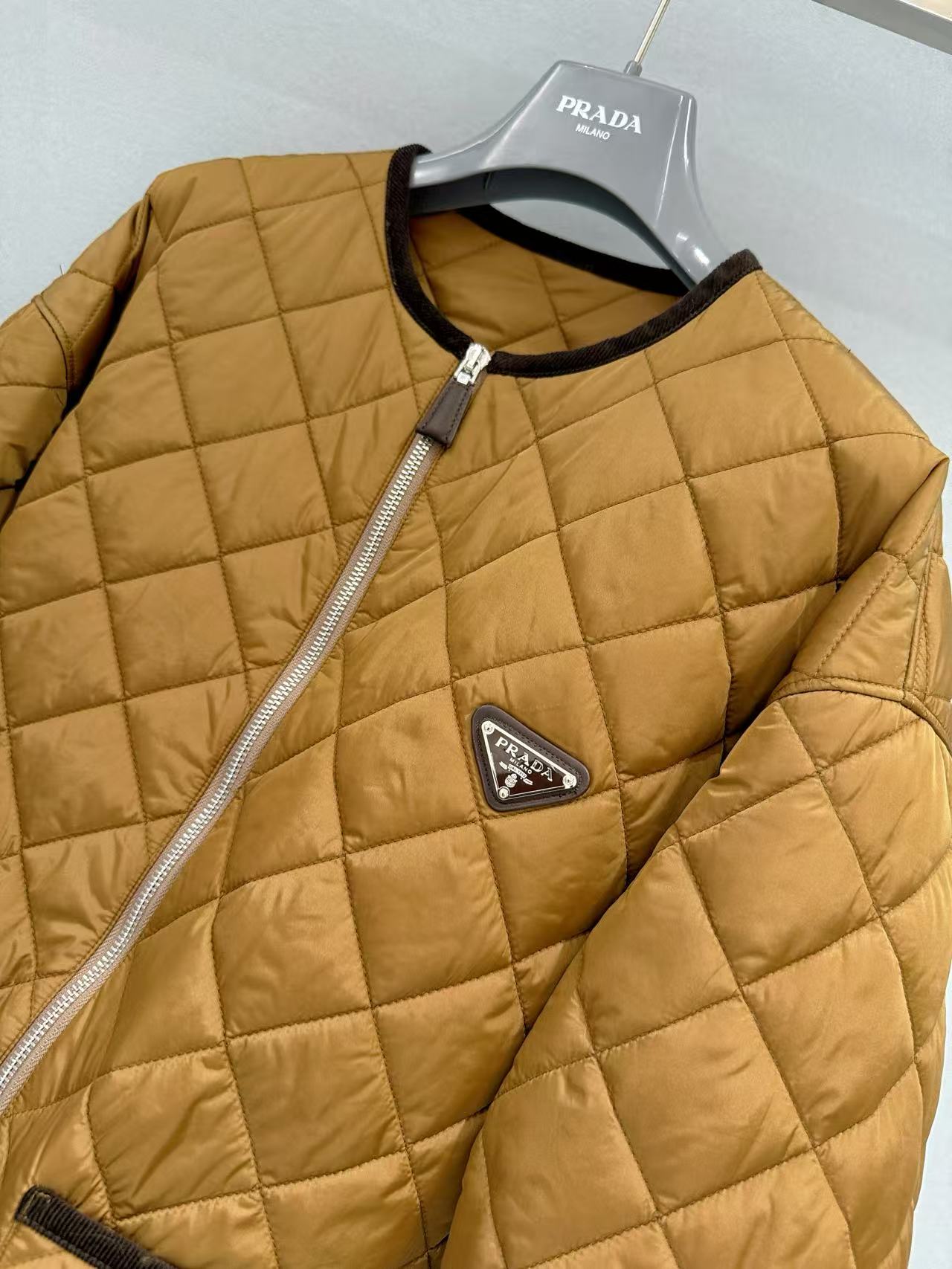 這件圓領棉服外套乍看簡約,但細節非常有誠意。焦糖色的菱形車縫設計帶出復古質感,經典雙口袋與三角標作為點綴,整體看起來既耐看又有辨識度。