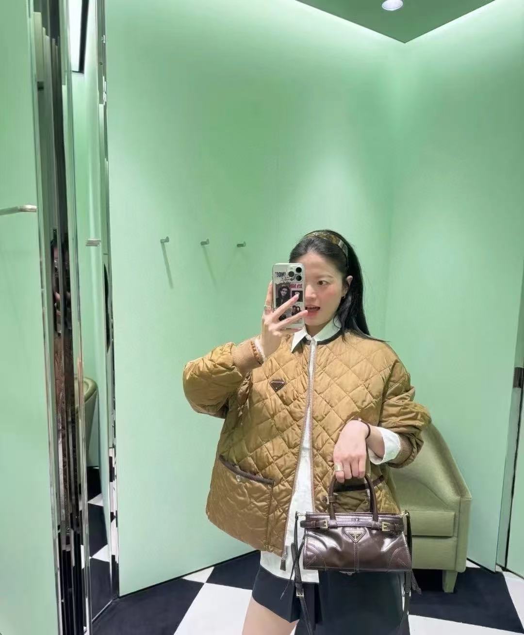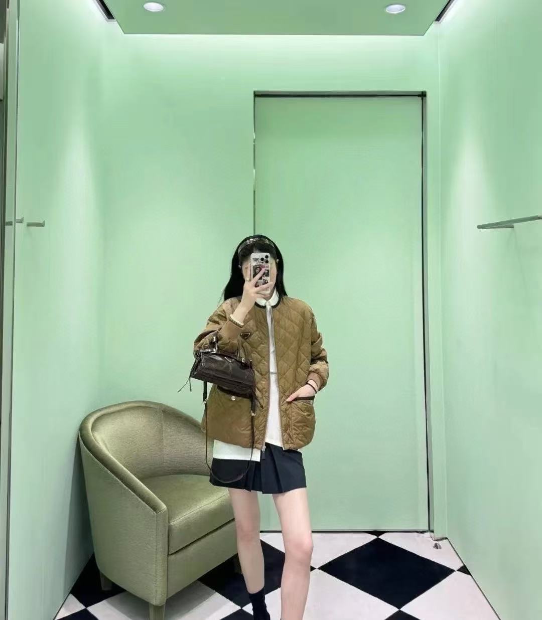 表面採用平整挺括的棉質材質,布面平滑且耐磨,穿起來有一定的份量感,能維持外套的立體廓形。,因此實品色調與質感都更有層次。三角標與口袋處的做工特別講究,細節上能看出品質差異。