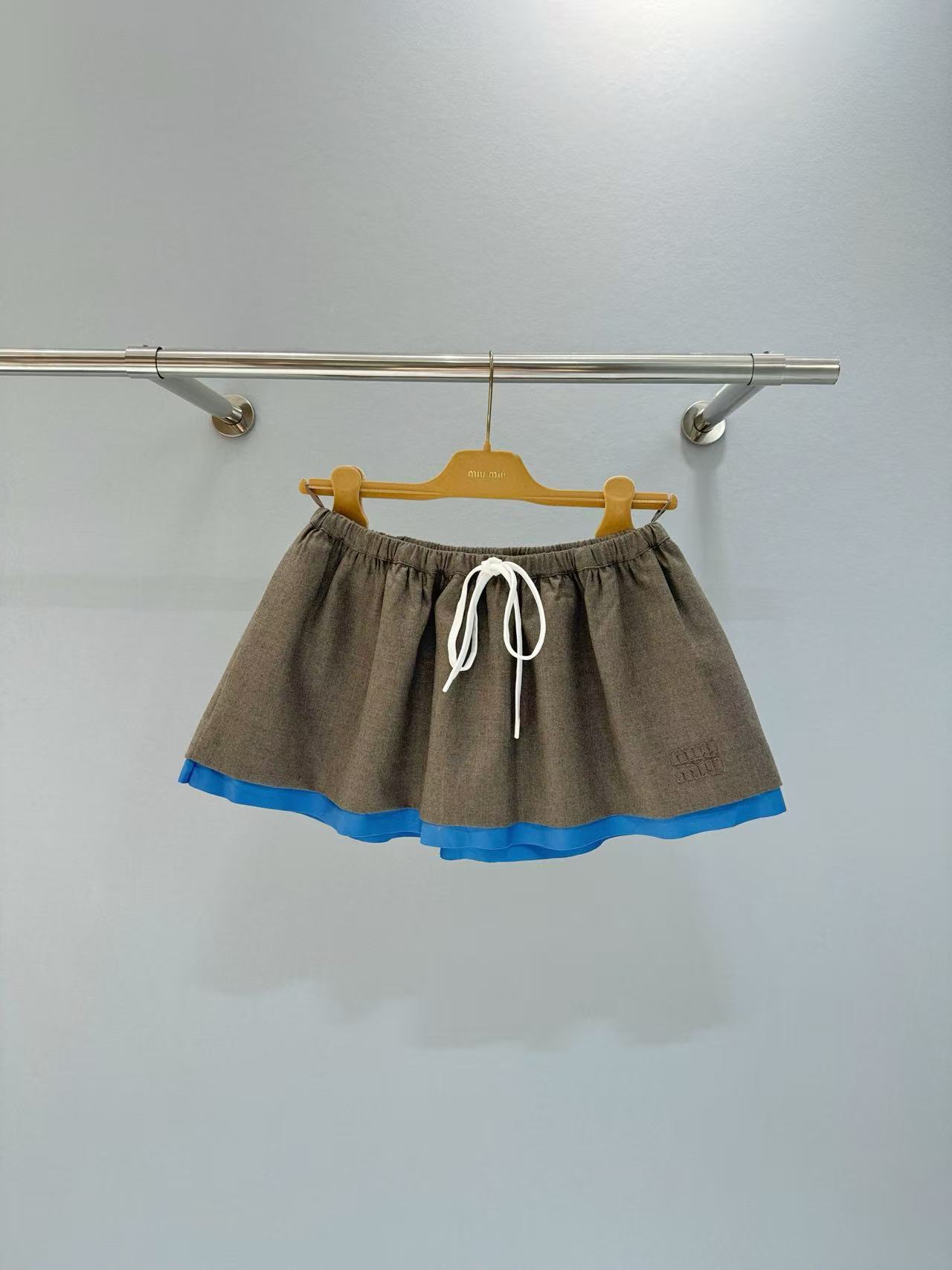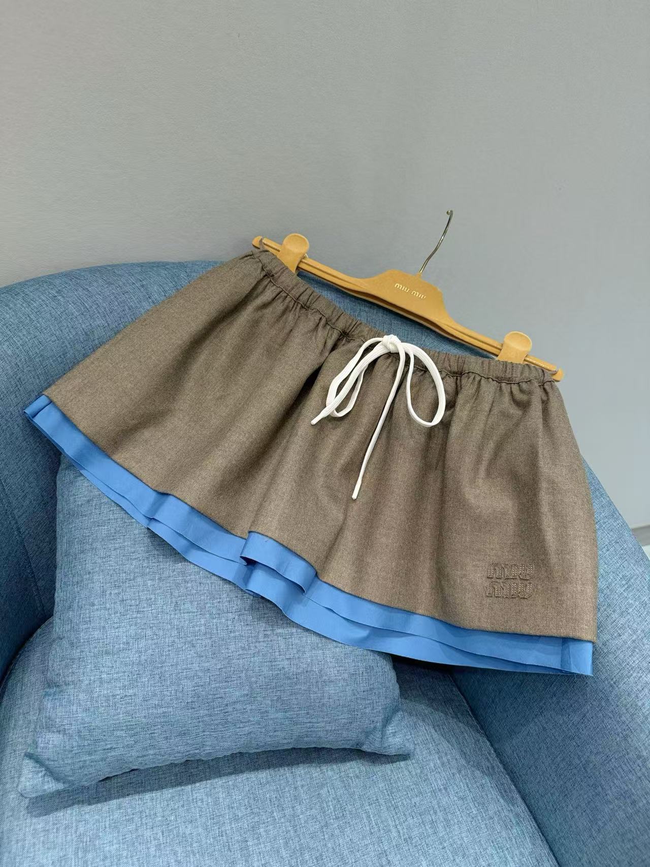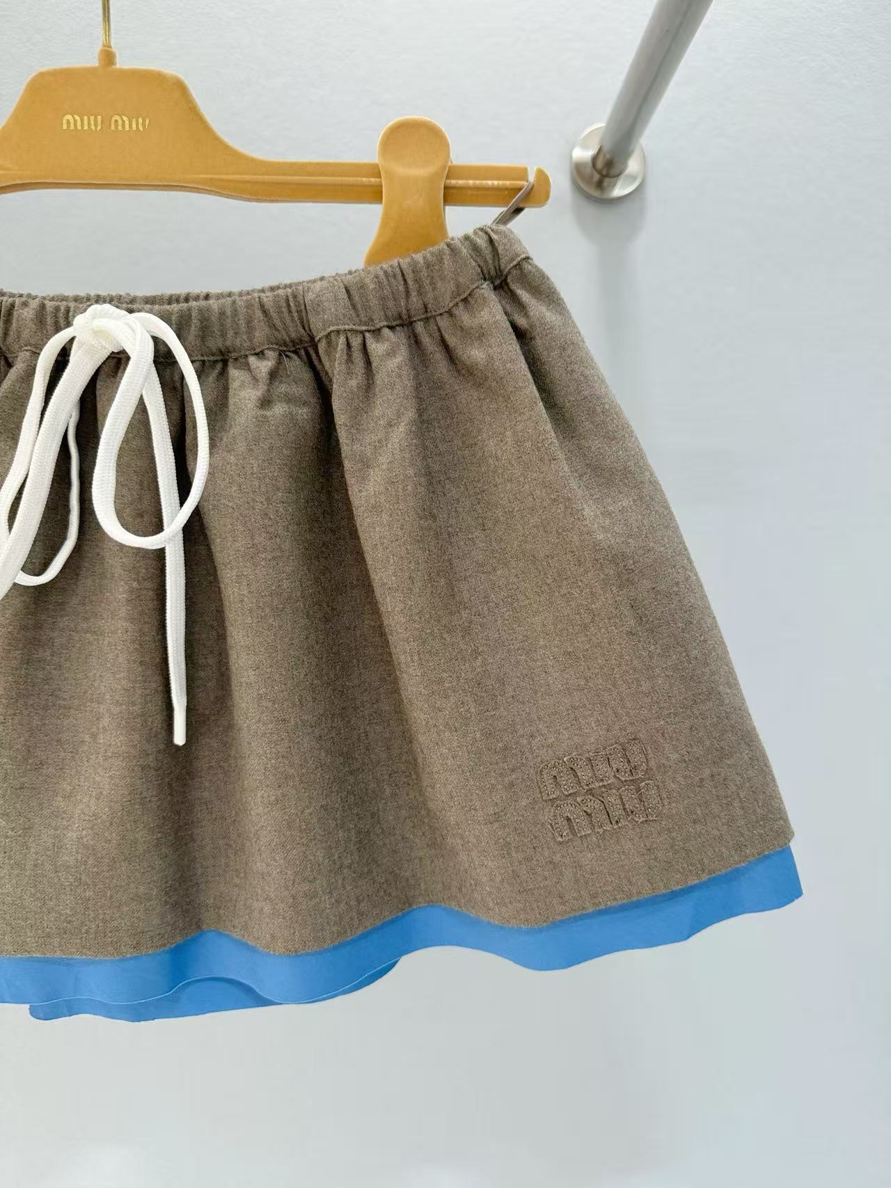 2025秋冬 Miu家 刺繡字母徽標拼接藍邊半裙