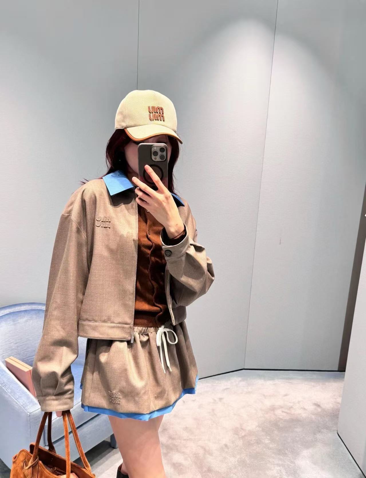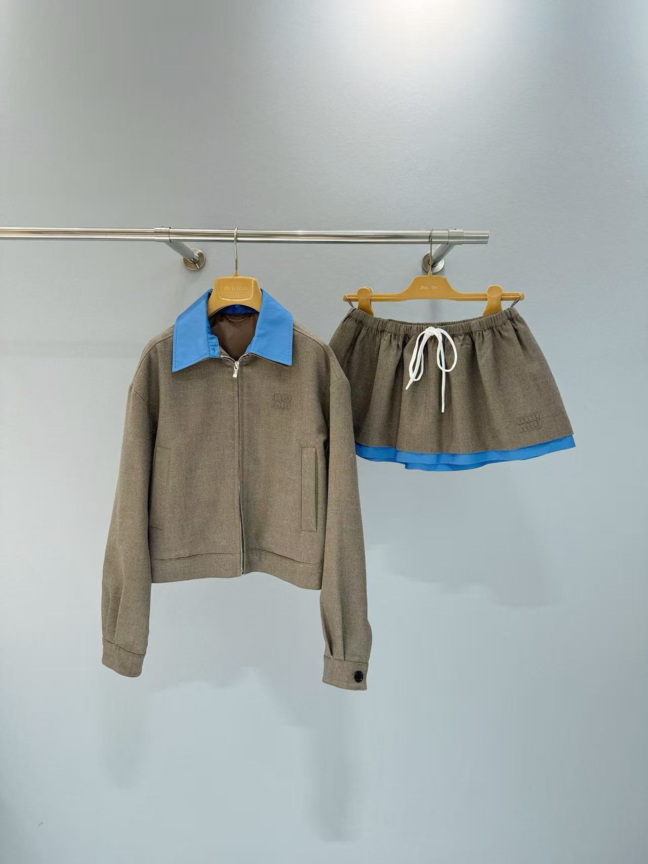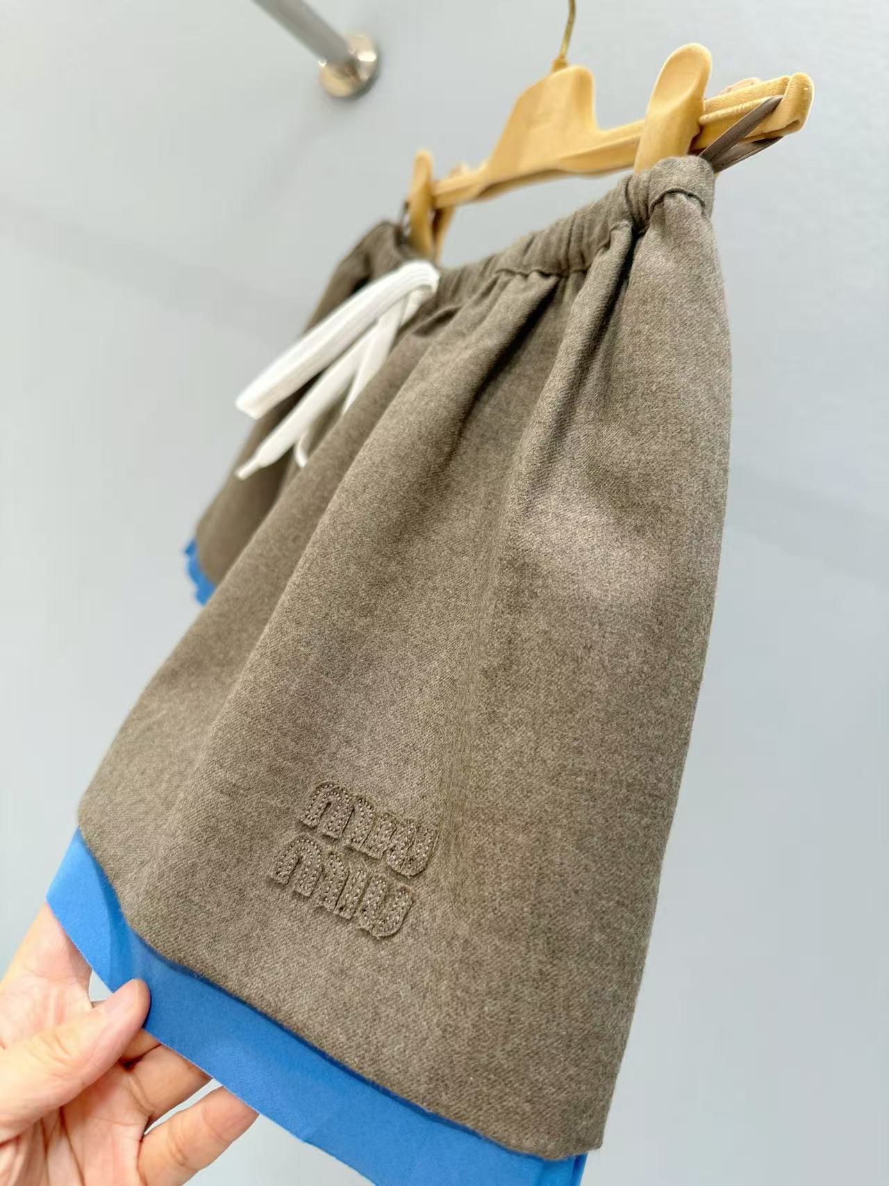2025秋冬 Miu家 刺繡字母徽標拼接藍邊半裙