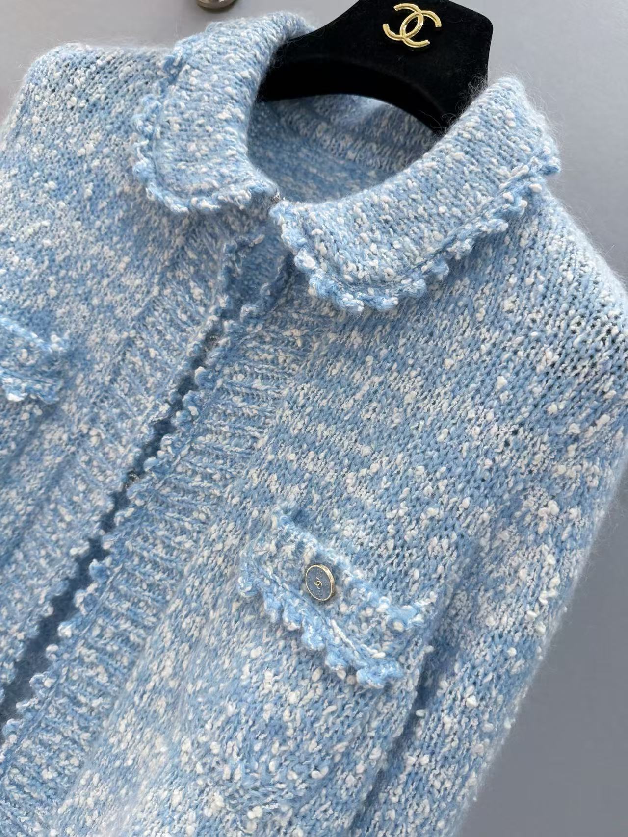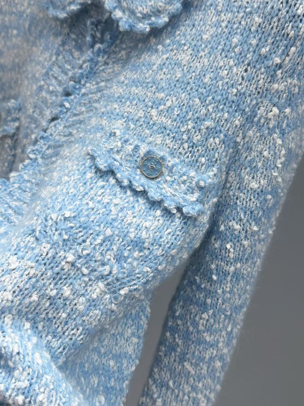 羊毛混紡柔軟貼膚,花瓣領配蕾絲花邊,袖口下擺細節滿點,法式優雅一秒到位。淺藍色調清新溫柔,