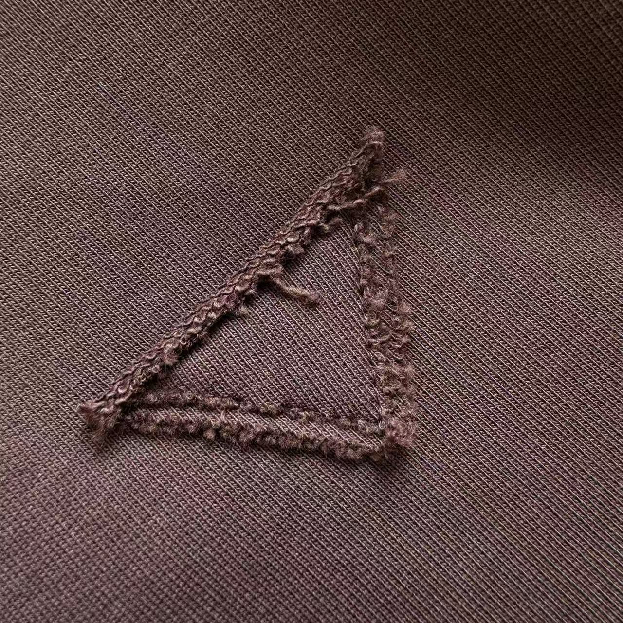 這件衛衣最吸引人的地方就是它胸前經典的品牌三角形織標!這個標誌使用了紅外線切割技術,將不同尺寸的三角形布料進行疊加,然後再用車縫固定在胸前。這種獨特的工藝,讓標誌看起來更有層次感,也完美展現了品牌的工匠精神。