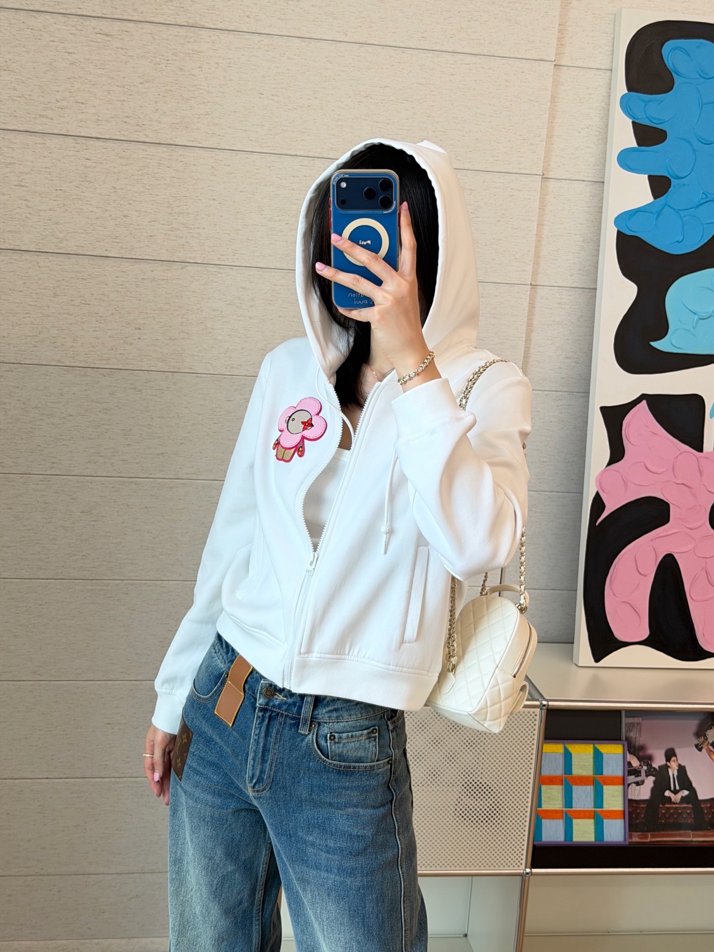 胸前點綴的花朵貼布刺繡,替整體增添一點可愛與細節亮點,不會過於甜膩,反而多了一點個性。