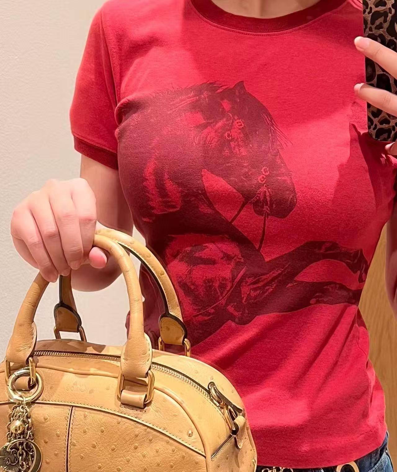 正紅色的濃郁氛圍 結合力量感十足的駿馬圖案,展現出一種自信且不羈的時尚宣言,無論是日常出街還是節日聚會,都是最吸睛的存在。